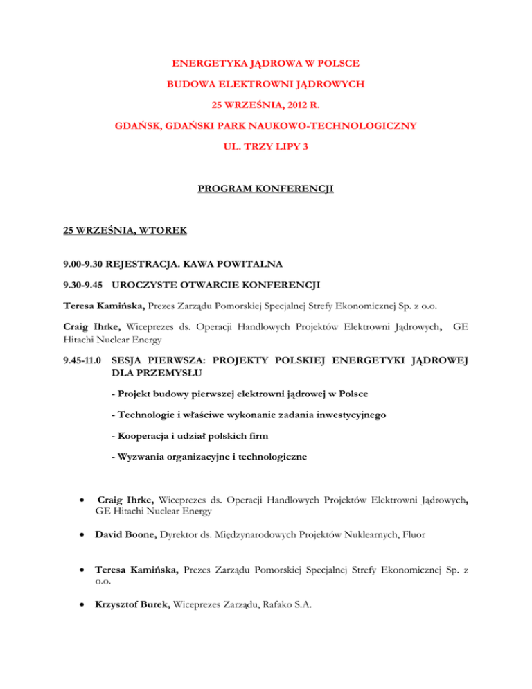 ENERGETYKA JĄDROWA W POLSCE BUDOWA ELEKTROWNI JĄDROWYCH 25 WRZEŚNIA, 2012 R. GDAŃSK, GDAŃSKI PARK NAUKOWO-TECHNOLOGICZNY UL. TRZY LIPY 3 PROGRAM KONFERENCJI 25 WRZEŚNIA, WTOREK 9.00-9.30 REJESTRACJA. KAWA POWITALNA 9.30-9.45 UROCZYSTE OTWARCIE KONFERENCJI Teresa Kamińska, Prezes Zarządu Pomorskiej Specjalnej Strefy Ekonomicznej Sp. z o.o. Craig Ihrke, Wiceprezes ds. Operacji Handlowych Projektów Elektrowni Jądrowych, Hitachi Nuclear Energy GE 9.45-11.0 SESJA PIERWSZA: PROJEKTY POLSKIEJ ENERGETYKI JĄDROWEJ DLA PRZEMYSŁU - Projekt budowy pierwszej elektrowni jądrowej w Polsce - Technologie i właściwe wykonanie zadania inwestycyjnego - Kooperacja i udział polskich firm - Wyzwania organizacyjne i technologiczne Craig Ihrke, Wiceprezes ds. Operacji Handlowych Projektów Elektrowni Jądrowych, GE Hitachi Nuclear Energy David Boone, Dyrektor ds. Międzynarodowych Projektów Nuklearnych, Fluor Teresa Kamińska, Prezes Zarządu Pomorskiej Specjalnej Strefy Ekonomicznej Sp. z o.o. Krzysztof Burek, Wiceprezes Zarządu, Rafako S.A. Jarosław Jankowski, Weil, Gotshal & Manges Moderator: Roman Rewald, Partner w Weil, Gotshal & Manges Panelita: Craig Ihrke, Wiceprezes ds. Operacji Handlowych Projektów Elektrowni Jądrowych, GE Hitachi Nuclear Energy Panelista: David Boone, Dyrektor ds. Międzynarodowych Projektów Nuklearnych, Fluor Panelista: Teresa Kamińska, Prezes Zarządu Pomorskiej Specjalnej Strefy Ekonomicznej Sp. z o.o. Panelista: Krzysztof Burek, Wiceprezes Zarządu, Rafako S.A. Panelista: Jarosław Jankowski, Weil, Gotshal & Manges 11.00-11.15 PRZERWA NA KAWĘ 11.15-13.00 SESJA DRUGA: WYZWANIA KONSTRUKCYJNE ROZWOJOWE DLA PRZEMYSŁU POLSKIEGO I SZANSE - Zaplecze przemysłowe i kompetencje - Doświadczenie pracy na rynkach polskim i zagranicznych - Możliwość adaptacji najnowocześniejszych technologii i budowa polskiego centrum przemysłowego o zasięgu regionalnym Grzegorz Czul, Wiceprezes Zarządu, Fluor S.A. Anna Wiosna, Pełnomocnik Zarządu ds. Sektora Energetycznego w HOCHTIEF Polska SA Edmund Kickertz, Dyrektor Działu Obsługi Projektów, HOCHTIEF Solutions AG, Civil Europe, Energy Europe mgr inż. Halina Strawińska, Prezes Zarządu, MMS Multi Marine Service Sp. z o.o. Krzysztof Burek, Wiceprezes Zarządu, Rafako S.A. Jacek Faltynowicz, Prezes Zarządu, Elektrobudowa S.A. Katowice prof. dr hab. inż. Bożydar Metschkow, Członek Rady Nadzorczej, Stocznia Gdańsk Moderator: Grzegorz Czul, Wiceprezes Zarządu, Fluor S.A. Panelista: Anna Wiosna, Pełnomocnik Zarządu ds. Sektora Energetycznego w HOCHTIEF Polska SA Panelista: Edmund Kickertz, Dyrektor Działu Obsługi Projektów, HOCHTIEF Solutions AG, Civil Europe, Energy Europe Panelista: mgr inż. Halina Strawińska, Prezes Zarządu, MMS Multi Marine Service Sp. z o.o. Panelista: Krzysztof Burek, Wiceprezes Zarządu, Rafako S.A. Panelista: Jacek Faltynowicz, Prezes Zarządu, Elektrobudowa S.A. Katowice Panelista: prof. dr hab. inż. Bożydar Metschkow, Rady Nadzorczej, Stocznia Gdańsk 13.00-13.45 LUNCH 13.45-15.00 SESJA TRZECIA: BAZA NAUKOWO-TECHNICZNA W POLSCE DLA WSPIERANIA ROZWOJU ENERGETYKI JĄDROWEJ prof. dr hab. inż. Waldemar Kamrat, Politechnika Gdańska prof.dr hab. Ludwik Dobrzyński, Dyrektor Działu Edukacji i Szkoleń, Narodowe Centrum Badań Jądrowych prof. dr hab. inż. Stefan Taczanowski, Kierownik Katedry Energetyki Jądrowej na Wydziale Energetyki i Paliw, Akademia Górniczo-Hutnicza mgr inż. Andrzej Patrycy, Prezes Zarządu, Energoprojekt - Warszawa S.A. prof. dr hab. Mariusz P. Dąbrowski, Uniwersytet Szczeciński prof. dr hab. inż. Roman Domański, Instytut Techniki Cieplnej, Politechnika Warszawska Moderator: prof. dr hab. inż. Waldemar Kamrat, Prorektor ds. kształcenia i rozwoju, Politechnika Gdańska Panelista: prof. dr hab. Mariusz P. Dąbrowski, Uniwersytet Szczeciński Panelista: mgr inż. Andrzej Patrycy, Prezes Zarządu, Energoprojekt - Warszawa S.A. Panelista: prof. dr hab. inż. Stefan Taczanowski, Kierownik Katedry Energetyki Jądrowej na Wydziale Energetyki i Paliw, Akademia Górniczo-Hutnicza Panelista: prof. dr hab. Ludwik Dobrzyński, Dyrektor Działu Edukacji i Szkoleń, Narodowe Centrum Badań Jądrowych Panelista: prof. dr hab. inż. Roman Domański, Instytut Techniki Cieplnej, Politechnika Warszawska 15.00-15.15 PRZERWA NA KAWĘ 15.15-16.30 SESJA CZWARTA: FINANSOWANIE INFRASTRUKTURALNYCH W POLSCE WIELKICH PROJEKTÓW - Modele finansowania - Specyfika polskiego rynku inwestycyjnego - Praktyka światowa i pragmatyzm ekonomiczny Marcin Krzemiński, Senior Vice President, Sales & Project Finance - Eastern Europe, GE Global Growth & Operations Amjad Ghori, Dyrektor Zarządzający, Doradztwo w Zakresie Finansowania Strukturalnego, Credit Agricole Bank Londyn Wojciech Hann, Partner w Dziale Doradztwa Finansowego, Środkowoeuropejski Zespół Energii i Zasobów, Deloitte Artur Zawadowski, Partner w Weil, Gotshal & Manges Moderator: Wojciech Hann, Partner w Dziale Doradztwa Finansowego, Środkowoeuropejski Zespół Energii i Zasobów, Deloitte Panelista: Marcin Krzemiński, Senior Vice President, Sales & Project Finance - Eastern Europe, GE Global Growth & Operations Panelista: Amjad Ghori, Dyrektor Zarządzający, Doradztwo w Zakresie Finansowania Strukturalnego, Credit Agricole Bank Londyn Panelista: Artur Zawadowski, Partner w Weil, Gotshal & Manges