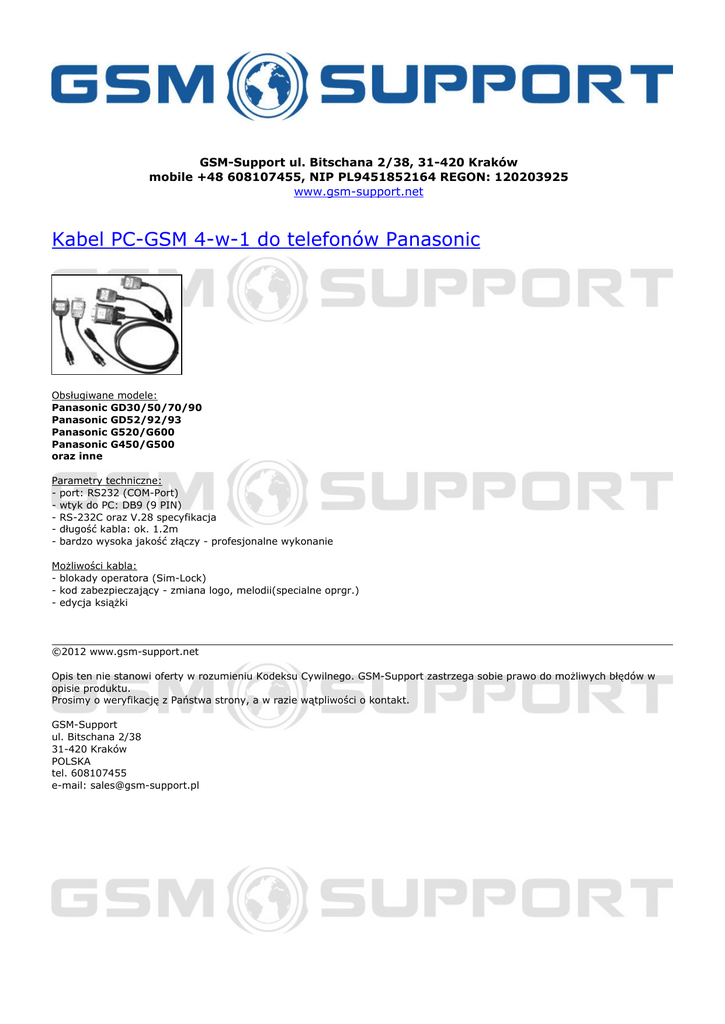 GSM-Support ul. Bitschana 2/38, 31-420 Kraków mobile +48 608107455, NIP PL9451852164 REGON: 120203925 www.gsm-support.net Kabel PC-GSM 4-w-1 do telefonów Panasonic Obsługiwane modele: Panasonic GD30/50/70/90 Panasonic GD52/92/93 Panasonic G520/G600 Panasonic G450/G500 oraz inne Parametry techniczne: - port: RS232 (COM-Port) - wtyk do PC: DB9 (9 PIN) - RS-232C oraz V.28 specyfikacja - długość kabla: ok. 1.2m - bardzo wysoka jakość złączy - profesjonalne wykonanie Możliwości kabla: - blokady operatora (Sim-Lock) - kod zabezpieczający - zmiana logo, melodii(specialne oprgr.) - edycja książki ©2012 www.gsm-support.net Opis ten nie stanowi oferty w rozumieniu Kodeksu Cywilnego. GSM-Support zastrzega sobie prawo do możliwych błędów w opisie produktu. Prosimy o weryfikację z Państwa strony, a w razie wątpliwości o kontakt. GSM-Support ul. Bitschana 2/38 31-420 Kraków POLSKA tel. 608107455 e-mail: [email protected] Powered by TCPDF (www.tcpdf.org)