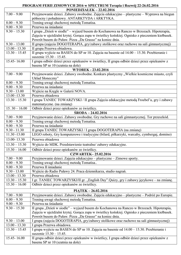 PROGRAM FERII ZIMOWYCH 2016 w SPECTRUM Terapia i Rozwój 22-26.02.2016 PONIEDZIAŁEK – 22.02.2016 7.00 – 9.00 Przyjmowanie dzieci. Zabawy swobodne. Zajęcia edukacyjno – plastyczne – Wyprawa na biegun północny i południowy. ANTARKTYDA i ARKTYKA. 8.00 – 9.30 Trening uwagi słuchowej metodą Tomatisa. 9.00 – 9.30 Przerwa na śniadanie 9.30 – 15.30 I grupa „Dzień w siodle” – wyjazd busem do Kochanowa na Ranczo w Brzozach. Hipoterapia, Zajęcia w ujeżdżalni krytej. Gorąca zupa w świetlicy końskiej. Ognisko z pieczeniem kiełbasek. Powrót busem do Puław. Pizza „Da Grasso” na koniec dnia. 9.30 – 13.00 II grupa (zajęcia DOGOTERAPIA, gry/zabawy stolikowe oraz ruchowe na sali gimnastycznej) 13.00 - 13.30 II grupa Przerwa obiadowa. 13.30 – 15.45 II grupa wyjście na BASEN do SP nr 10. Zajęcia na basenie od 14.00 – 15.30. Przebieranie i suszenie 15.30 – 15.45. 15.45- 16.00 I grupa odbiór dzieci przez opiekunów w świetlicy, II grupa odbiór dzieci przez opiekunów z basenu SP nr 10 (szatnia na dole) WTOREK - 23.02.2016 7.00 – 9.00 Przyjmowanie dzieci. Zabawy swobodne. Konkurs plastyczny „Wielkie kosmiczne miasto, czyli Układ Słoneczny” 8.00 – 9.30 Trening uwagi słuchowej metodą Tomatisa. 9.00 – 9.30 Przerwa na śniadanie 9.30 - 13.00 Wyjście na Kręgle w Galerii NOVA. 13.00 -13.30 Przerwa obiadowa 13.30 – 15.30 I grupa TANIEC TOWARZYSKI / II grupa Zajęcia edukacyjne metodą Froebel’a, gry i zabawy matematyczne. (na zmianę) 15. 30 – 16.00 Odbiór dzieci przez opiekunów ze świetlicy. ŚRODA – 24.02.2016 7.00 – 9.00 Przyjmowanie dzieci. Zabawy swobodne. Gry ruchowe na sali gimnastycznej. Tor przeszkód. 8.00 – 9.30 Trening uwagi słuchowej metodą Tomatisa. 9.00 – 9.30 Przerwa na śniadanie 9.30 - 11.30 II grupa TANIEC TOWARZYSKI / I grupa DOGOTERAPIA (na zmianę) 11.30 -13.00 LEGO roboty, Gry komputerowe i tradycyjne (bilard, piłkarzyki, warcaby, cymbergaj, domino) 13.00- 13.30 Przerwa obiadowa 13.30 – 15.30 Wyjście do MDK. Przedstawienie teatralne/ zabawy edukacyjne. 15.30 – 16.00 Odbiór dzieci przez opiekunów ze świetlicy. CZWARTEK– 25.02.2016 7.00 – 9.00 Przyjmowanie dzieci. Zajęcia edukacyjno – plastyczne – Zimowe sporty. 8.00 – 9.30 Trening uwagi słuchowej metodą Tomatisa.. 9.00 – 9.30 Przerwa II śniadanie 9.30 - 13.00 Wyjście do Radio Puławy 24. Praca dziennikarza, studio nagrań. 13.00 - 13.30 Przerwa obiadowa 13.30 – 15.30 I gr. TANIEC TOWARZYSKI/II gr. „English Day”.Quizy, gry i zabawy językowe – na zmianę. Odbiór dzieci przez opiekunów ze świetlicy. 15.30 – 16.00 7.00 – 9.00 8.00 – 9.30 9.00 – 9.30 9.30 – 15.30 9.30 – 13.00 13.00 - 13.30 13.30 – 15.45 15.45- 16.00 PIĄTEK – 26.02.2016 Przyjmowanie dzieci. Zabawy swobodne. Zajęcia edukacyjno – plastyczne – Podróż po Europie. Trening uwagi słuchowej metodą Tomatisa. Przerwa na śniadanie II grupa „Dzień w siodle” – wyjazd busem do Kochanowa na Ranczo w Brzozach. Hipoterapia, Zajęcia w ujeżdżalni krytej. Gorąca zupa w świetlicy końskiej. Ognisko z pieczeniem kiełbasek. Powrót busem do Puław. Pizza „Da Grasso” na koniec dnia. I grupa (zajęcia DOGOTERAPIA, gry/zabawy stolikowe oraz ruchowe na sali gimnastycznej) I grupa Przerwa obiadowa. I grupa wyjście na BASEN do SP nr 10. Zajęcia na basenie od 14.00 – 15.30. Przebieranie i suszenie 15.30 – 15.45. II grupa odbiór dzieci przez opiekunów w świetlicy, I grupa odbiór dzieci przez opiekunów z basenu SP nr 10 (szatnia na dole)