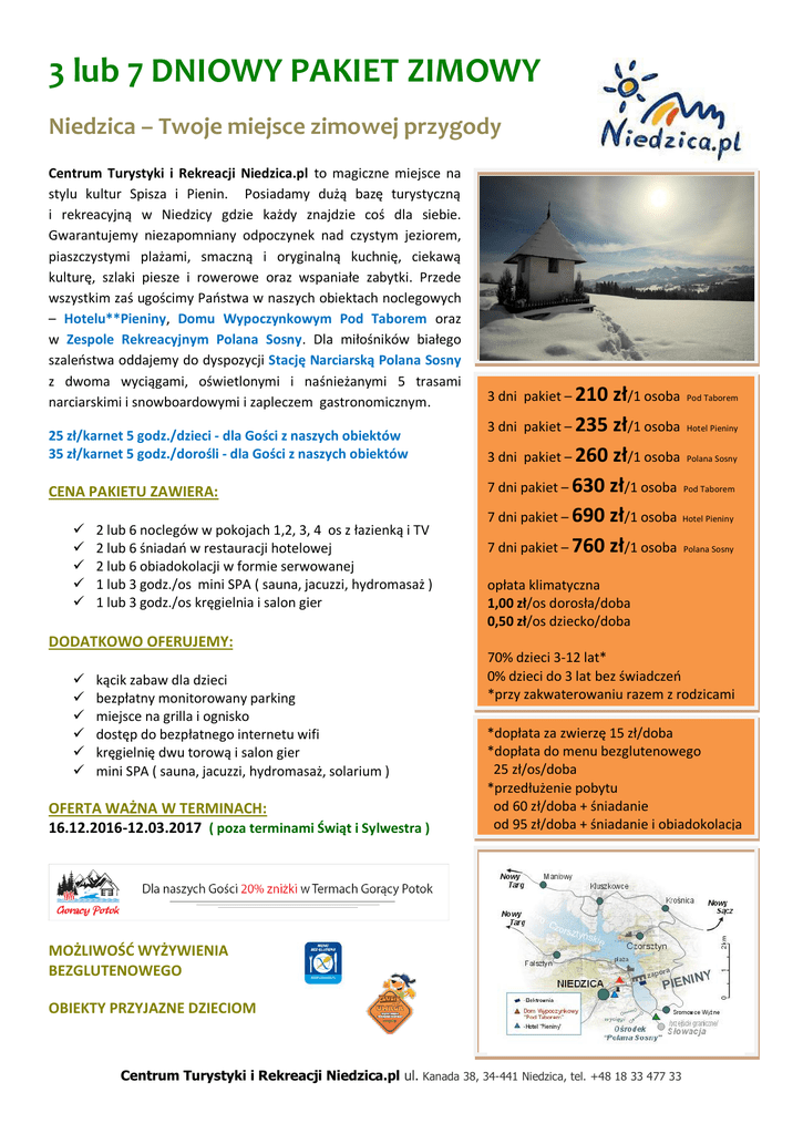 3 lub 7 DNIOWY PAKIET ZIMOWY Niedzica – Twoje miejsce zimowej przygody Centrum Turystyki i Rekreacji Niedzica.pl to magiczne miejsce na stylu kultur Spisza i Pienin. Posiadamy dużą bazę turystyczną i rekreacyjną w Niedzicy gdzie każdy znajdzie coś dla siebie. Gwarantujemy niezapomniany odpoczynek nad czystym jeziorem, piaszczystymi plażami, smaczną i oryginalną kuchnię, ciekawą kulturę, szlaki piesze i rowerowe oraz wspaniałe zabytki. Przede wszystkim zaś ugościmy Państwa w naszych obiektach noclegowych – Hotelu**Pieniny, Domu Wypoczynkowym Pod Taborem oraz w Zespole Rekreacyjnym Polana Sosny. Dla miłośników białego szaleństwa oddajemy do dyspozycji Stację Narciarską Polana Sosny z dwoma wyciągami, oświetlonymi i naśnieżanymi 5 trasami narciarskimi i snowboardowymi i zapleczem gastronomicznym. 25 zł/karnet 5 godz./dzieci - dla Gości z naszych obiektów 35 zł/karnet 5 godz./dorośli - dla Gości z naszych obiektów CENA PAKIETU ZAWIERA: 2 lub 6 noclegów w pokojach 1,2, 3, 4 os z łazienką i TV 2 lub 6 śniadań w restauracji hotelowej 2 lub 6 obiadokolacji w formie serwowanej 1 lub 3 godz./os mini SPA ( sauna, jacuzzi, hydromasaż ) 1 lub 3 godz./os kręgielnia i salon gier 3 dni pakiet – 210 zł/1 osoba Pod Taborem 3 dni pakiet – 235 zł/1 osoba Hotel Pieniny 3 dni pakiet – 260 zł/1 osoba Polana Sosny 7 dni pakiet – 630 zł/1 osoba Pod Taborem 7 dni pakiet – 690 zł/1 osoba Hotel Pieniny 7 dni pakiet – 760 zł/1 osoba Polana Sosny opłata klimatyczna 1,00 zł/os dorosła/doba 0,50 zł/os dziecko/doba DODATKOWO OFERUJEMY: kącik zabaw dla dzieci bezpłatny monitorowany parking miejsce na grilla i ognisko dostęp do bezpłatnego internetu wifi kręgielnię dwu torową i salon gier mini SPA ( sauna, jacuzzi, hydromasaż, solarium ) OFERTA WAŻNA W TERMINACH: 16.12.2016-12.03.2017 ( poza terminami Świąt i Sylwestra ) 70% dzieci 3-12 lat* 0% dzieci do 3 lat bez świadczeń *przy zakwaterowaniu razem z rodzicami *dopłata za zwierzę 15 zł/doba *dopłata do menu bezglutenowego 25 zł/os/doba *przedłużenie pobytu od 60 zł/doba + śniadanie od 95 zł/doba + śniadanie i obiadokolacja MOŻLIWOŚĆ WYŻYWIENIA BEZGLUTENOWEGO OBIEKTY PRZYJAZNE DZIECIOM Centrum Turystyki i Rekreacji Niedzica.pl ul. Kanada 38, 34-441 Niedzica, tel. +48 18 33 477 33