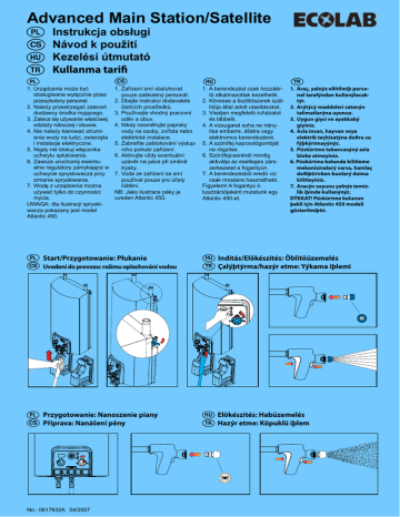 Advanced Main Station/Satellite PL CS HU TR Instrukcja obsługi Návod k použití Kezelési útmutató Kullanma tarifi PL 1.Urządzenie może być obsługiwane wyłącznie przez przeszkolony personel. 2.Należy przestrzegać zaleceń dostawcy środka myjącego. 3.Zaleca się używanie właściwej odzieży roboczej i obuwia. 4.Nie należy kierować strumienia wody na ludzi, zwierzęta i instalacje elektryczne. 5.Nigdy nie blokuj włącznika uchwytu spłukiwania. 6. Zawsze uruchomij ewentualne regulatory zamykające w uchwycie spryskiwacza przy zmianie spryskiwania. 7.Wodę z urządzenia można używać tylko do czynności mycia. UWAGA: dla ilustracji spryskiwacza pokazany jest model Atlantic 450. CS 1.Zařízení smí obsluhovat pouze zaškolený personál. 2.Dbejte instrukcí dodavatele čistících prostředků. 3.Používejte vhodný pracovní oděv a obuv. 4.Nikdy nesměřujte paprsky vody na osoby, zvířata nebo elektrické instalace. 5.Zabraňte zablokování výstupního potrubí zařízení. 6.Aktivujte vždy eventuální uzávěr na páce při změně trysky. 7.Voda ze zařízení se smí používat pouze pro účely čištění. NB: Jako ilustrace páky je uveden Atlantic 450. HU 1.A berendezést csak hozzáértö alkalmazottak kezelhetik. 2.Kövesse a tisztitószerek szállitója által adott utasitásokat. 3.Viseljen megfelelö ruházatot és lábbelit. 4.A vizsugarat soha ne irányitsa emberre, állatra vagy elektromos berendezésre. 5.A szórófej kapcsológombját ne rögzitse. 6.Szórófejcserénél mindig aktiválja az esetleges zárszerkezetet a fogantyún. 7.A berendezésböl eredö viz csak mosásra használható. Figyelem! A fogantyú illusztrációjaként mutatunk egy Atlantic 450-et. TR 1. Araç, yalnýz eðitilmiþ personel tarafýndan kullanýlacaktýr. 2. Arýtýcý maddeleri satanýn talimatlarýna uyunuz. 3. Uygun giysi ve ayakkabý giyiniz. 4. Asla insan, hayvan veya elektrik teçhizatýna doðru su fýþkýrtmayýnýz. 5. Püskürtme tabancasýný asla bloke etmeyiniz. 6. Püskürtme kolunda kilitleme mekanizmalarý varsa, hamlaç deðiþtirirken bunlarý daima kilitleyiniz. 7. Aracýn suyunu yalnýz temizlik iþinde kullanýnýz. DÝKKAT! Püskürtme kolunun þekli için Atlantic 450 modeli gösterilmiþtir. PL Start/Przygotowanie: Płukanie CS Uvedení do provozu: režimu oplachování vodou HU Inditás/Elökészités: Öblitöüzemelés TR Çalýþtýrma/hazýr etme: Yýkama iþlemi PL Przygotowanie: Nanoszenie piany CS Příprava: Nanášení pěny HU Elökészités: Habüzemelés TR Hazýr etme: Köpuklü iþlem No.: 0617632A 04/2007 PL Zmiana środka czyszczącego CS Změňte čisticí prostředek HU Tisztítószer cseréje TR Temizleyici maddenin deðiþtirilmesi >20 sec. PL Dezynfekowanie przy użyciu P3-User Pack CS Desinfekce s použitím P3-User Pack HU Fertötlenités a P3-User Pack-kel TR P3-User Pack kullanma paketiyle PL Procedura zakończeniu pracy urządzenia CS Ukončení HU Befejezömód TR Bitirme prosedürü >20 sec. >20 sec. Ecolab GmbH & Co. OHG © 2006 All rights reserved P.O. Box 13 04 06 D-40554 Düsseldorf www.ecolab.com Tel.: +49 211 98 93 203 - Fax: +49 211 98 93 223 Printed in Denmark