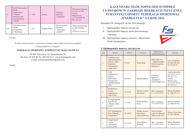 9. XVIII Mistrzostwa Polski Energetyków w Tenisie Stołowym dla niezrzeszonych w PZTS 10. VIII Mistrzostwa Polski Energetyków w Bowlingu 7 - 9.10 2 - 4.11 Tarnów Federacja Sportowa „Energetyk” Łaziska Górne Stowarzyszenie Sportowo – Kulturalne „Elektro” Walentyna Gniewek, tel. 516 115 700 Łukasz Bigoszewski, tel. 22 629 40 76, 605 265 617 Kalendarz FS „Energetyk” na rok 2016 obejmuje: Tomasz Kalinowski, tel. 601 953 006 e-mail: [email protected] Uwaga! Wszelkie zmiany terminów, regulaminów lub miejsc imprez należy niezwłocznie uzgadniać z Federacją Sportową „Energetyk.” FEDERACJA SPORTOWA „ENERGETYK” RADA GŁÓWNA 02-001 Warszawa, Al. Jerozolimskie 91 Tel./Fax: 22 629 40 76, 605 265 617 www.fsenergetyk.com e-mail: [email protected] Notatki: KALENDARZ OGÓLNOPOLSKICH IMPREZ I ZAWODÓW W ZAKRESIE REKREACJI FIZYCZNEJ, TURYSTYKI I SPORTU FEDERACJI SPORTOWEJ „ENERGETYK” NA ROK 2016 I. Ogólnopolskie imprezy turystyczne II. Ogólnopolskie imprezy sportu powszechnego i rekreacji III. Ogólnopolskie imprezy sportowe - Mistrzostwa Polski Energetyków I. Ogólnopolskie imprezy turystyczne Lp. Nazwa Termin 1. L Jubileuszowy Międzynarodowy Zimowy Spływ Kajakowy Energetyków „Brda 2016” 2. XXII Ogólnopolski Zimowy Rajd Górski Energetyków „Beskid Sądecki – 2016” 24-30.01 3. Rozpoczęcie Sezonu Żeglarskiego 2016 WJM 4. Miejsce Organizator/ współorganizator Kontakt PGE GiEK S.A. – Oddział Zespół Elektrociepłowni Bydgoszcz Anna Świderska, tel. 604 526 994, 52 372 83 50 Beskid Sądecki Federacja Sportowa „Energetyk”, ZWSE Kraków S.A. Andrzej Kaszuba, tel. 12 415 37 21, 502 427 731, Łukasz Bigoszewski, tel. 22 629 40 76, 605 265 617 12-15.05 Wielkie Jeziora Mazurskie SK-T „Sekstant” Marek Wardziak, tel. 508 019 723 IV Ogólnopolski Rajd Pieszy „Mazury mniej znane” 6 -11.06 Szlak Wielkich Jezior SK-T „Sekstant” Marek Wardziak, tel. 508 019 723 5. LIV Ogólnopolski Rejs Żeglarski Energetyków 16 -30.07 Wielkie Jeziora Mazurskieakwen północny Veolia Energia Łódż SA (dawniej Dalkia Łódź SA) Dariusz Pomykała, tel. 601 386 934 6. I Rajd Górski z cyklu „Poznajemy nowe szlaki” 20 -31.07 Stara PłaninaBułgaria SK-T „Sekstant” Marek Wardziak, tel. 508 019 723 6-10.01 Rzeka Brda www.sekstant.zagle.pl www.sekstant.zagle.pl www.sekstant.zagle.pl 7. LV Ogólnopolski Górski Rajd Pieszy Energetyków 6 – 11.09 8. Zakończenie Sezonu Żeglarskiego 2016 WJM 22 - 23.09 Bieszczady Federacja Sportowa „Energetyk” Łukasz Bigoszewski, tel. 22 629 40 76, 605 265 617 Wielkie Jeziora Mazurskie SK-T „Sekstant” Marek Wardziak, tel. 508 019 723 www.sekstant.zagle.pl 8. 1. 2. 3. 4. 5. 6. 7. Nazwa Lp. I Mistrzostwa Narciarskie o Puchar SKT Sekstant Termin 23 - 28.02 VI Zawody Narciarskie o Puchar Federacji Sportowej „Energetyk” 3 - 6.03 VIII Mistrzostwa Polski Energetyków w Maratonie Rowerowym maj VIII Mistrzostwa Polski Energetyków w biegu na 10km 7.05 I Mistrzostwa Polski Energetyków na „Łodziach Smoczych” 17 – 18.06 X Ogólnopolskie Igrzyska Sportowe Energetyków XXVI Mistrzostwa Polski Energetyków w Wędkarstwie Spławikowym 31.08 - 04.09 9 - 11.09 Miejsce BanskoBułgaria Szczyrk Kraków Organizator/ współorganizator SK-T „Sekstant” www.sekstant.zagle.pl Federacja Sportowa „Energetyk” TKKF „ENERGIA” www.mtbenergetykow.pl Termin 1. 21 - 24.01 2. Łukasz Bigoszewski, tel. 22 629 40 76, 605 265 617 XIV Mistrzostwa Polski Energetyków w Piłce Nożnej 3. Bogdan Ulicki, tel. 502 967 657 Kontakt www.biegskawina.pl Wrocław TST Kogeneracja Wrocław Jacek Wojtyłło, tel. 608 591 469 Federacja Sportowa „Energetyk” Łukasz Bigoszewski, tel. 22 629 40 76, 605 265 617 Towarzystwo Sportowe „Kuźnia” Mirosław Białowąs, tel. 693 116 445 UKS „Energetyk” Dychów Jerzy Ostojski, tel. 607 743 105 Miejsce Organizator/ współorganizator Kontakt Szczyrk Łukasz Bigoszewski, tel. 22 629 40 76, 605 265 617 kwiecień Kozienice „Energia” Kozienice Sławomir Kalina, tel. 691 387 151 XXIII Mistrzostwa Polski Energetyków w Pool-Bilardzie 08 - 10.04 Żory Stowarzyszenie Sportowo – Kulturalne „Elektro” Tomasz Kalinowski, tel. 601 953 006 4. XXXVI Mistrzostwa Polski Energetyków w Szachach 15 - 17.04 Suwałki SK-T „Sekstant” Marek Wardziak, tel. 508 019 723 5. XXIX Mistrzostwa Polski Energetyków w Tenisie Ziemnym 16 -19.06 COS Szczyrk Federacja Sportowa „Energetyk” Łukasz Bigoszewski, tel. 22 629 40 76, 605 265 617 6. X Ogólnopolskie Regaty Żeglarskie Energetyków 11 - 13.09 Jezioro Żywieckie Stowarzyszenie Rekreacyjno – Sportowe „Elektron” Henryk Chrobak, tel. 516 111 096 7. XVI Halowe Mistrzostwa Polski Energetyków w Tenisie 23 - 24.09 Gliwice Stowarzyszenie Sportowo – Kulturalne „Elektro” 8. XXXIX Mistrzostwa Polski Energetyków w Piłce Siatkowej Kobiet i Mężczyzn 6 - 9.10 COS Szczyrk Federacja Sportowa „Energetyk” Adam Mrowiec tel. 502 073 699 e-mail: uksjedynka_ [email protected] Dychów Bobrowice Federacja Sportowa „Energetyk” Marek Wardziak, tel. 508 019 723 UKS „Jedynka” Skawina Zalew Rybnicki Nazwa XVII Mistrzostwa Polski Energetyków w Narciarstwie Alpejskim Skawina k. Krakowa AWF Biała Podlaska 15.10 III. Ogólnopolskie imprezy sportowe – Mistrzostwa Polski Energetyków II. Ogólnopolskie imprezy sportu powszechnego i rekreacji Lp. Indywidualny Rekreacyjny Bieg na Orientację Energetyków www.sekstant.zagle.pl e-mail: [email protected] Tomasz Kalinowski, tel. 601 953 006 e-mail: [email protected] Łukasz Bigoszewski, tel. 22 629 40 76, 605 265 617