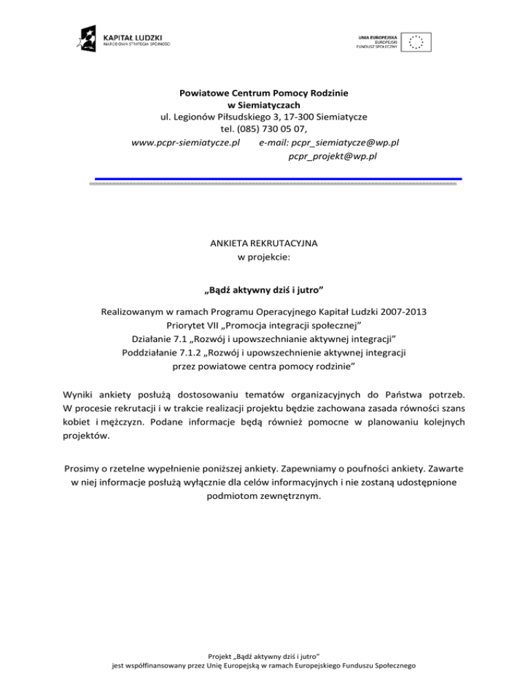 Powiatowe Centrum Pomocy Rodzinie w Siemiatyczach ul. Legionów Piłsudskiego 3, 17-300 Siemiatycze tel. (085) 730 05 07, www.pcpr-siemiatycze.pl e-mail: [email protected] [email protected] ANKIETA REKRUTACYJNA w projekcie: „Bądź aktywny dziś i jutro” Realizowanym w ramach Programu Operacyjnego Kapitał Ludzki 2007-2013 Priorytet VII „Promocja integracji społecznej” Działanie 7.1 „Rozwój i upowszechnianie aktywnej integracji” Poddziałanie 7.1.2 „Rozwój i upowszechnienie aktywnej integracji przez powiatowe centra pomocy rodzinie” Wyniki ankiety posłużą dostosowaniu tematów organizacyjnych do Państwa potrzeb. W procesie rekrutacji i w trakcie realizacji projektu będzie zachowana zasada równości szans kobiet i mężczyzn. Podane informacje będą również pomocne w planowaniu kolejnych projektów. Prosimy o rzetelne wypełnienie poniższej ankiety. Zapewniamy o poufności ankiety. Zawarte w niej informacje posłużą wyłącznie dla celów informacyjnych i nie zostaną udostępnione podmiotom zewnętrznym. Projekt „Bądź aktywny dziś i jutro” jest współfinansowany przez Unię Europejską w ramach Europejskiego Funduszu Społecznego A NKIETA REKRUTACYJNA Ankietę należy wypełnić poprzez wstawienie w odpowiedniej kratce znaku „X”, a w przypadku pytań otwartych należy wpisać odpowiedź w miejsce kropek. 1. Płeć kobieta mężczyzna 15 - 24 lat 25 - 54 lat 55 - 64 la podstawowe gimnazjalne zawodowe średnie pomaturalne wyższe w trakcie nauki (na jakim poziomie?) 2. Wiek 3. Wykształcenie ……………………………………………………………………….……………. 4. Czy korzysta Pan/Pani ze świadczeń pomocy społecznej? ( w tym ze świadczeń PCPR) tak nie osoba samotnie gospodarująca osoba w rodzinie 5. Rodzina 6. Czy Pan/Pani opiekuje się dzieckiem w wieku poniżej 7 lat lub osobą zależną? tak nie 7. Czy jest Pan/Pani zainteresowany/na możliwością zapewnienia opieki nad dzieckiem/osobą zależną w czasie zajęć organizowanych w ramach projektu „Bądź aktywny dziś i jutro”? tak nie 8. Czy jest Pan/Pani osobą niepełnosprawną? tak nie Projekt „Bądź aktywny dziś i jutro” jest współfinansowany przez Unię Europejską w ramach Europejskiego Funduszu Społecznego 9. Czy jest Pan/Pani zarejestrowany/na jako bezrobotny w PUP? tak nie Jeżeli nie, to proszę podać z jakiego powodu: Jeżeli tak, to proszę podać przez jaki okres w ciągu ostatnich 24 miesięcy był/a Pan/Pani zarejestrowany/a jako bezrobotny/a w PUP: 0-12 miesięcy 12-24 miesięcy powyżej 24 miesięcy 10. Czy posiada Pan/Pani doświadczenie zawodowe? (staż pracy) tak nie Jeżeli tak, to proszę podać w jakim zawodzie i na jakich stanowiskach Pan/Pani pracował/a zawodowo: 11. Czy posiada Pan/Pani uprawnienia zawodowe potwierdzone świadectwem ukończenia szkoły, kursu? tak nie Jeżeli tak, to proszę podać jakie: 12. Jakie bariery uniemożliwiają Panu/Pani znalezienie zatrudnienia? 13. Jakie są Pana/Pani zainteresowania? ……………………………………………………………………………… ……………………………………………………………………………………………………………………………………………… ……………………………………………………………………………………………………………………………………………… 14. Czy dotychczas uczestniczył/a Pan/Pani w szkoleniach organizowanych przez PUP, PCPR lub inną instytucję? tak nie Projekt „Bądź aktywny dziś i jutro” jest współfinansowany przez Unię Europejską w ramach Europejskiego Funduszu Społecznego Jeżeli tak, to proszę podać nazwę szkolenia (kursu) oraz rok ukończenia: 15. Jakie przeszkody uniemożliwiają Panu/Pani podniesienie kwalifikacji zawodowych? problemy finansowe brak czasu brak odpowiedniej oferty niepełnosprawność opieka nad dzieckiem lub osobą zależną brak umiejętności w komunikacji społecznej nieumiejętność autoprezentacji inne, jakie? ……………………………………………………..…………… 16. W jakich szkoleniach/kursach chciałby/aby Pan/Pani uczestniczyć w ramach realizowanego projektu? (można zaznaczyć więcej niż jedno) Stylizacja i wydłużanie paznokci Kurs prawa jazdy kat. ……… (wpisać rodzaj) Kurs językowy …………………………….(rodzaj) Obsługa wózków widłowych kurs komputerowy …………………………………….. (jaki?) sprzedawca- handlowiec ABC przedsiębiorczości (rozpoczęcie działalności i zarządzenie własną firmą) inne, jakie? …………………………………………………………………………..………….…… ………………………………………………………………………………… 17. Czy Pan/Pani jest zainteresowany/na uczestnictwem w zajęciach rehabilitacyjnym? (pkt dotyczy osób niepełnosprawnych) tak nie 18. W jakim czasie mógłby/aby Pan/Pani uczestniczyć w szkoleniach, kursach? w dni robocze i weekendy w godzinach ………………… tylko w dni robocze w godzinach …………………………… tylko w weekendy w godzinach ……………………………... 19. Skąd dowiedział/a się Pan/Pani o projekcie? (można zaznaczyć więcej niż jedną odpowiedź) Ogłoszenie w gazecie lokalnej Ogłoszenie w Internecie Plakaty, tablica informacyjna Powiatowy Urząd Pracy Gminny/Miejski Ośrodek Pomocy Społecznej Urząd Starostwa Powiatowego Od znajomych/rodziny Powiatowe Centrum Pomocy Rodzinie w Projekt „Bądź aktywny dziś i jutro” jest współfinansowany przez Unię Europejską w ramach Europejskiego Funduszu Społecznego Siemiatyczach Inne (jakie?)………………………………………………………………………. D ANE OSOBOWE : Imię (imiona) Nazwisko Adres zamieszkania: Adres korespondencyjny Telefon kontaktowy PESEL Wiek Jestem zainteresowany/zainter