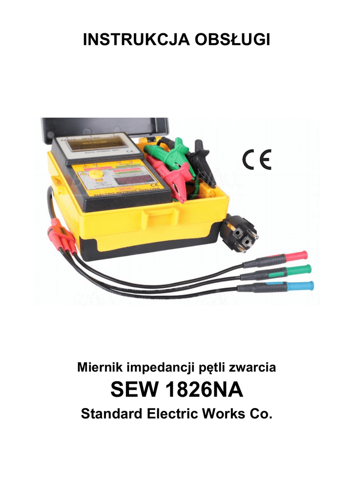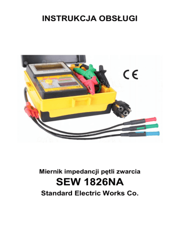 INSTRUKCJA OBSŁUGI Miernik impedancji pętli zwarcia SEW 1826NA Standard Electric Works Co. Spis treści 1. BEZPIECZEŃSTWO ................................................................................. 3 2. SPECYFIKACJA ........................................................................................ 4 3. CHARAKTERYSTYKA............................................................................... 5 4. PODŁĄCZENIA ......................................................................................... 5 5. OPIS URZĄDZENIA .................................................................................. 6 6. FUNKCJE URZĄDZENIA .......................................................................... 7 7. PRZYGOTOWANIA DO POMIARÓW....................................................... 8 8. TEST PĘTLI ZWARCIA/PSC/UZIEMIENIA ................................................ 8 9. BATERIA ................................................................................................. 10 10. KALIBRACJA I SERWIS ........................................................................ 10 11. CZYSZCZENIE I PRZECHOWYWANIE ................................................ 10 12. OCHRONA ŚRODOWISKA ................................................................... 11 2 1. BEZPIECZEŃSTWO Elektryczność może być źródłem poważnych obrażeń, nawet przy pracy z niskim napięciem i prądem. W związku z tym należy koniecznie przeczytać niniejszą instrukcję obsługi przed przystąpieniem do użytkowania miernika 1826NA. 1.1 Miernik 1826NA może być użytkowany wyłącznie przez przeszkolone i wykwalifikowane osoby, zgodnie z zaleceniami zawartymi w niniejszej instrukcji obsługi. Producent nie ponosi odpowiedzialności za wszelkie uszkodzenia i uszczerbki na zdrowiu wynikające z nieprawidłowego użytkowania urządzenia lub niezastosowania się do zaleceń dotyczących bezpieczeństwa. Urządzenie wyzwala przepływ do ziemi prądu o dużej wartości. 1.2 1826NA jest przeznaczony wyłącznie do pracy w instalacjach jednofazowych, 230V AC z poprawnym układem połączeń (przewód fazowy, neutralny, ochronny). Nie wolno podłączać urządzenia do napięcia międzyfazowego, ponieważ może to doprowadzić do jego uszkodzenia. W trakcie testu nie wolno dotykać odsłoniętych metalowych części i jakichkolwiek innych elementów przewodzących. 1.3 Wszystkie wyłączniki różnicowoprądowe typu RCCB, GFCI i ELCB w obwodzie muszą zostać zmostkowane tylko na czas trwania testu. 1.4 Nie wolno otwierać obudowy urządzenia, chyba że w celu wymiany baterii (Patrz sekcja: Wymiana baterii). 1.5 Przed przystąpieniem do użytkowania należy sprawdzić stan urządzenia oraz przewodów pomiarowych pod kątem ich uszkodzenia. Jeśli stwierdzono jakiekolwiek nieprawidłowości (np. uszkodzone przewody pomiarowe, pęknięta obudowa, niedziałający ekran) nie wolno przystępować do użytkowania urządzenia i prowadzenia pomiarów. W takim wypadku należy oddać miernik do serwisu dystrybutora. 1.6 Tester został zaprojektowany z myślą o bezpieczeństwie jego użytkowania, jednakże nie jest on w stanie uchronić użytkownika przed wszelkimi konsekwencjami nieprawidłowej obsługi. Obwody elektryczne mogą być niebezpieczne lub nawet stwarzać zagrożenie dla życia, jeśli w trakcie użytkowania nie zostanie zachowana należyta ostrożność i prawidłowe metody pracy. Należy zachować szczególną ostrożność przy pracy z napięciami powyżej 24V, ponieważ niesie ona ryzyko porażenia prądem elektrycznym. 1.7 Należy zwracać uwagę na zawarte w instrukcji ostrzeżenia dotyczące potencjalnie niebezpiecznych zachowań związanych z obsługą urządzenia. Warunki prowadzenia pomiarów: 1. Do użytku wewnątrz pomieszczeń 2. CAT III 300V 3. Stopień zanieczyszczenia 2 4. Wysokość do 2000m n.p.m. 5. Wilgotność względna RH 85%max 6. Temperatura otoczenia 0˚~40˚C 3 Międzynarodowe symbole bezpieczeństwa: Podwójna lub wzmocniona izolacja. Uwaga! Ryzyko porażenia prądem elektrycznym. Ostrzeżenie! Przeczytaj instrukcję obsługi przed rozpoczęciem użytkowania urządzenia. 2. SPECYFIKACJA Mikroprocesorowy, przenośny miernik impedancji pętli zwarcia. Pomiar impedancji pętli zwarcia LE(PE) i L-N, napięcia AC L-E(PE) i L-N, spodziewanego prądu zwarciowego L-E(PE) i L-N oraz impedancji przewodu fazowego, neutralnego, ochronnego Inne funkcje: autowyłączenie, test integralności przewodów, ochrona przed przegrzaniem i wskazanie przekroczenia temperatury, pamięć poprzednich odczytów. Pomiar Pętli zwarcia/Uziemienia/Przewodów Prąd testu w każdej pętli Spodziewany max prąd zwarciowy PSC (L-N i L-E(PE)) Pomiar napięcia L-N, L-E(PE) Impedancja przewodu ochronnego Impedancja przewodu neutralnego Impedancja przewodu fazowego i uzwojeń transformatora Napięcie pracy Najlepsze dokładności przy nominalnym Temperatura operacyjna Temperatura przechowywania Wilgotność pracy RH Wilgotność przechowywania RH Dokładność wskazań napięcia Dokładność pomiaru impedancji zwarcia/Uziemienia/Przewodów Dokładność pomiaru PSC Źródło zasilania Wymiary Masa Wyposażenie standardowe 0,03~2000Ω Autozakresy 11,76A przy 230V/50Hz 0~6kA @ 230V AC 50~280V AC (sinus), 50Hz 0,01~2000Ω 0,01~2000Ω 0,01~2000Ω 50~275V AC (50 lub 60Hz) napięciu 230V AC ±20% Max. 10A 0˚C~40˚C -20˚C~60˚C 85% Max 85% Max ±(1%ww) (210-250V) ±(3%ww) (inne wartości) Pętli ±2% (0,05~50Ω) ±3% (50~500Ω) ±15% (> 500Ω) ±(10%ww+5c) Bateria AA, LR06, 8sztuk 179 x185 x 90mm (szer x gł x wys) 1,23kg Przewody pomiarowe zakończone 3 krokodylkami, Przewód pomiarowy zakończony wtykiem sieciowym, pasek naszyjny, baterie, instrukcja obsługi 4 3. CHARAKTERYSTYKA Wyświetlacz LCD alfanumeryczny: 2 wiersze, po 16 znaków Autozakresy, autowyłączenie Obsługa jednym przyciskiem Niski pobór mocy Sterowanie mikroprocesorem Dokładność lepsza niż ±2% (zakres 0,05Ω~50Ω) Test poprawno