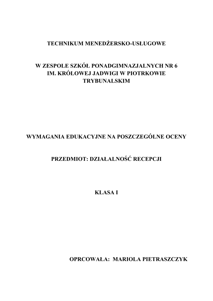 TECHNIKUM MENEDŻERSKO-USŁUGOWE W ZESPOLE SZKÓŁ PONADGIMNAZJALNYCH NR 6 IM. KRÓLOWEJ JADWIGI W PIOTRKOWIE TRYBUNALSKIM WYMAGANIA EDUKACYJNE NA POSZCZEGÓLNE OCENY PRZEDMIOT: DZIAŁALNOŚĆ RECEPCJI KLASA I OPRCOWAŁA: MARIOLA PIETRASZCZYK Wymagania edukacyjne niezbędne do uzyskania poszczególnych śródrocznych i rocznych ocen klasyfikacyjnych z przedmiotu „Działalność recepcji” Dział 2.1. Goście hotelowi Ocena celujący Otrzymuje uczeń, który spełnia wymagania na ocenę bardzo dobry oraz: prowadzi dyskusję na temat etyki i etyki zawodowej, podpierając się licznymi przykładami ogólnie zna treść Kodeksu Etyki Hotelarza wykazuje zależność pomiędzy kulturą osobistą a kulturą zawodową samodzielnie przygotowuje scenki symulacyjne dotyczące kulturalnego zachowania się recepcjonisty przygotowuje projekt na temat gościnności w hotelu przygotowuje dodatkowe referaty, czyta czasopisma branżowe, wykazuje zainteresowanie zawodem potrafi skorelować wiadomości z innych przedmiotów zawodowych Ocena bardzo dobry Otrzymuje uczeń, który spełnia wymagania na ocenę dobry oraz: omawia znaczenie pojęć: etyka, estetyka, etykieta, etyka zawodowa dobiera obiekty hotelarskie w zależności od potrzeb gości rozróżnia i podaje przykłady zachowań etycznych i nieetycznych zna treść KEH, charakteryzuje dokument przedstawia zastosowanie dokumentu w praktyce udziela wyczerpującej wypowiedzi na temat kultury i kultury osobistej, ich wpływu na społeczeństwo i pracę zawodową wymienia i opisuje cechy kultury osobistej omawia i uzasadnia czego wymaga ranga społeczna zawodu hotelarza, przedstawia znaczenie norm moralnych w środowisku i w pracy zawodowej podaje przykłady kulturalnego zachowania się recepcjonisty podczas obsługi gości uzasadnia na czym polega umiejętność komunikowania się: mowa ciała: mimika, uśmiech, gesty, przestrzeń, słuchanie aktywne, porozumienie werbalne charakteryzuje zasady protokołu dyplomatycznego stosowane w hotelu umiejętnie opisuje nietypowe postawy zachowania gości w hotelu oraz przedstawia właściwy sposób reagowania hotelarza we wszystkich sytuacjach dokładnie omawia spiralę konfliktu podaje własne przykłady i rozwiązania sytuacji konfliktowych prezentuje kulturalne zachowanie się bierze aktywny udział w dyskusji samodzielnie wykonuje ćwiczenia i omawia je, najczęściej w grach zespołowych samodzielnie wykonuje ćwiczenia, często jest liderem w rozwiązaniu zadań grupowych Ocena dobry Otrzymuje uczeń, który spełnia wymagania na ocenę dostateczny oraz: omawia modele gościnności. określa potrzeby gości hotelowych i ich oczekiwania przedstawia sylwetkę wzorowego hotelarza, dokonując klasyfikacji cech na: fizyczne, psychiczne oraz dotyczące wiedzy i umiejętności ocenia własne predyspozycje do pracy w zawodzie hotelarza dokonuje porównania etyki hotelarskiej z etyką ogólną zna zasady protokołu dyplomatycznego obowiązujące podczas przyjmowania gości w hotelu potrafi dobrać ofertę do potrzeb gości hotelowych podaje sytuacje, w których język ciała może być jedyną formą komunikacji omawia techniki aktywnego słuchania i podaje przykłady ich zastosowania prowadzi rozmowę z gościem hotelowym wymienia elementy decydujące o poczuciu estetyki pracowników zakładu hotelarskiego zna treść Kodeksu Etyki Hotelarza określa wymogi w zakresie kultury obsługi, które stawia się pracownikom hotelu wymienia nawyki pożądane i niepożądane w pracy omawia postępowanie recepcjonisty z różnymi typami gości hotelowych charakteryzuje źródła konfliktów między pracownikami potrafi zaproponować sposoby rozwiązania konfliktów samodzielnie wykonuje ćwiczenia, czasami jest liderem w czasie wykonywania zadań grupowych Ocena dostateczny Otrzymuje uczeń, który spełnia wymagania na ocenę dopuszczający oraz: określa podstawową misję hotelarstwa – oferowanie gościny wymienia modele gościnności przy pomocy nauczyciela przedstawia pojęcie etyki oraz etyki zawodowej określa pojęcia: kultura i kultura osobista wymienia rodzaje i typy gości omawia podstawowe potrzeby gości określa zasady etykiety w kontaktach z gośćmi wymienia zasady i zachowania, które składają się na poziom i kulturę obsługi prawidłowo wita i żegna gościa wie z ilu części składa się Kodeks Etyki Hotelarza wymienia przykłady komunikacji przy pomocy mowy ciała określa , na czym polega aktywne słuchanie wymienia przykłady dotyczących kulturalnego zachowania się recepcjonisty podczas obsługi gościa, podaje przykłady barier w komunikacji zna sposoby rozwiązywania konfliktów międzyludzkich próbuje samodzielnie wykonać ćwiczenia bierze aktywny udział w wykonywaniu zadań w grupach Ocena dopuszczający Otrzymuje uczeń, który: zna podstawową misję hotelarstwa – oferowanie gościny odróżnia pojęcia etyka i etyka zawodowa, zna podstawowe potrzeby gości wie kto opracował polski Kodeks Etyki Hotelarza zna pojęcia kultura i kultura osobista zna zasady etykiety w kontaktach z gośćmi potrafi zaproponować stroje obowiązujące w hotelu zna zasady kulturalnej obsługi gościa hotelowego przy pomocy nauczyciela potrafi podać kilka przykładów dotyczących kulturalnego zachowania się recepcjonisty podczas obsługi gościa hotelowego, zna podstawowe zasady higieny w życiu codziennym i w zakładzie pracy zna typy gości hotelowych zna rodzaje komunikacji interpersonalnej – komunikacja werbalna i niewerbalna wymienia podstawowe cechy profesjonalnego wyglądu hotelarza zna zasady powitania i pożegnania gościa wie na czym polega aktywne słuchanie wymienia cechy dobrego słuchacza przy pomocy nauczyciela potrafi wymienić nietypowe sytuacje wymienia źródła konfliktów między pracownikami współuczestniczy przy rozwiązywaniu ćwiczeń bierze udział w zadaniach grupowych Ocena niedostateczny Otrzymuje uczeń, który: nie opanował podstawowej wiedzy dotyczącej działalnoś