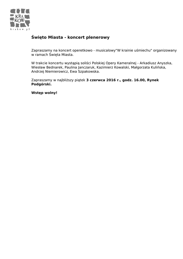 Święto Miasta - koncert plenerowy Zapraszamy na koncert operetkowo - musicalowy"W krainie uśmiechu" organizowany w ramach Święta Miasta. W trakcie koncertu wystąpią soliści Polskiej Opery Kameralnej - Arkadiusz Anyszka, Wiesław Bednarek, Paulina Janczaruk, Kazimierz Kowalski, Małgorzata Kulińska, Andrzej Niemierowicz, Ewa Szpakowska. Zapraszamy w najbliższy piątek 3 czerwca 2016 r., godz. 16.00, Rynek Podgórski. Wstęp wolny! Powered by TCPDF (www.tcpdf.org)