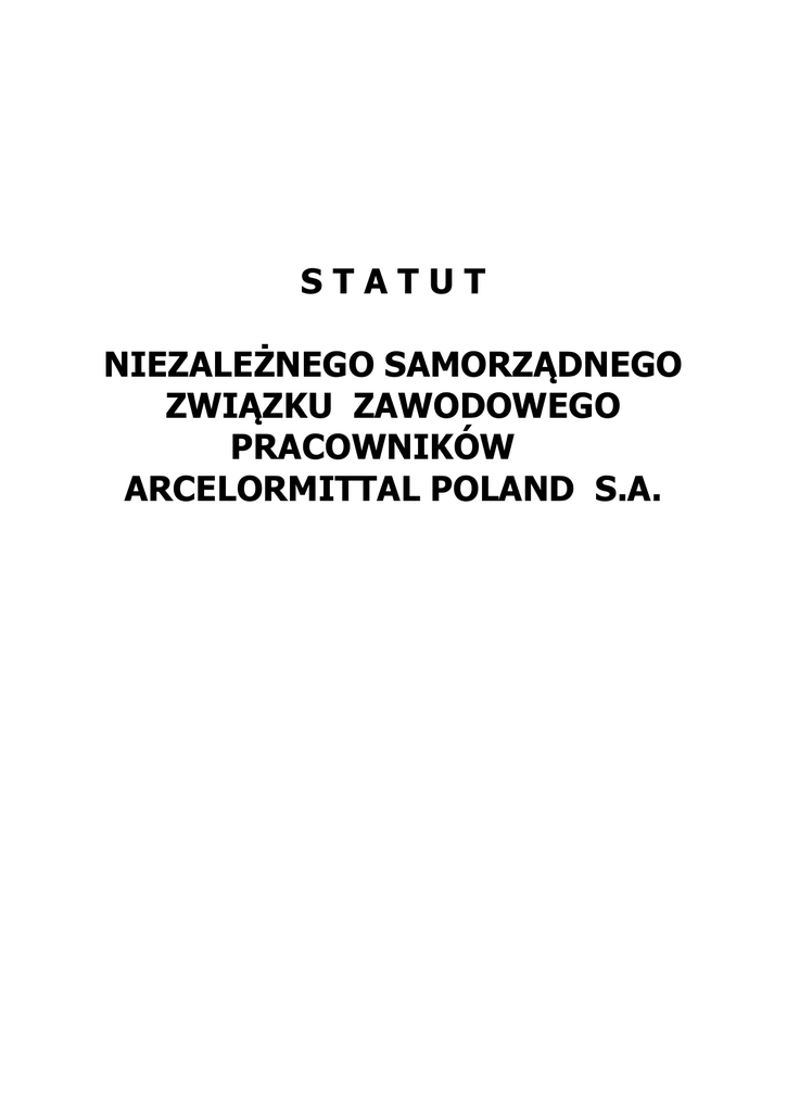 STATUT NIEZALEŻNEGO SAMORZĄDNEGO ZWIĄZKU ZAWODOWEGO PRACOWNIKÓW ARCELORMITTAL POLAND S.A. S T A T U T NIEZALEŻNEGO SAMORZĄDNEGO ZWIĄZKU ZAWODOWEGO PRACOWNIKÓW ARCELORMITTAL POLAND S.A. Organizację zawodową pod nazwą Niezależny Samorządny Związek Zawodowy Pracowników ArcelorMittal Poland S.A. zwany dalej "Związkiem", tworzą pracownicy ArcelorMittal Poland S.A., jednostek organizacyjnych powstałych w ramach przekształceń własnościowych HTS S.A., jego następcy prawnego PHS S.A., IPS S.A., Mittal Steel Poland S.A. i ArcelorMittal Poland S.A., jednostki gospodarczej Związku Zawodowego, emeryci i renciści ArcelorMittal Poland S.A., wymienionych jednostek organizacyjnych jednostki gospodarczej Związku oraz pracownicy spółek wykonujących prace na rzecz ArcelorMittal Poland S.A. ROZDZIAŁ I POSTANOWIENIA OGÓLNE § 1. 1. Związek Zawodowy Pracowników ArcelorMittal Poland S.A. zwany dalszym ciągu związkiem w działalności statutowej jest organizacją dobrowolną, samorządną i niezależną od organów administracji państwowej i gospodarczej oraz od organizacji partyjnych i społecznych. Niezależny Samorządny Związek Zawodowy Pracowników ArcelorMittal Poland S.A. jest organizacją Międzyzakładową. 2. Związek realizuje cele i zadania określone w niniejszym statucie zgodnie z przepisami Konstytucji RP, Ustawy o związkach zawodowych i innych ustaw ratyfikowanymi przez Polskę Konwencjami Międzynarodowej Organizacji Pracy. 3. Związek broni praw i działa w interesie swoich członków oraz współuczestniczy w kształtowaniu i realizacji zadań społeczno-gospodarczych zakładu oraz zapewnia odpowiednie środki kontroli i wyrażania opinii. § 2. 1. Członkiem Związku może zostać każdy pracownik zatrudniony w ArcelorMittal Poland S.A. w jednostkach organizacyjnych powstałych w ramach przekształceń własnościowych jednostek organizacyjnych ArcelorMittal Poland S.A., w jednostce gospodarczej Związku Zawodowego oraz pracownicy spółek wykonujących prace na rzecz ArcelorMittal Poland S.A bez względu na wiek, płeć, narodowość, przekonania polityczne, wyznanie, podstawę stosunku pracy i stanowisko, jeżeli wyrazi gotowość przestrzegania postanowień statutu i uchwał władz związkowych. 2 2. Renciści i emeryci mogą pozostać nadal członkami Związku lub mogą do niego wstąpić, jeżeli w dniu przejścia na emeryturę lub rentę byli pracownikami ArcelorMittal Poland S.A., powstałych jednostek organizacyjnych lub jednostki gospodarczej Związku oraz emeryci i renciści spółek wykonujących prace na rzecz ArcelorMittal Poland S.A. 3. Członkiem Związku może pozostać osoba, która została zwolniona na podstawie ustawy o "grupowych zwolnieniach" - na okres poszukiwania pracy. § 3. 1. Związek posiada osobowość prawną, może nabywać prawa i zaciągać zobowiązania w granicach przewidzianych przepisami prawa. 2. Związek działa przez władze związku wskazane w niniejszym statucie. 3. Do dokonywania czynności prawnych w imieniu związku, upoważnieni są przez Zarząd Związku pełnomocnicy. § 4. 1. Siedzibą Związku jest ArcelorMittal Poland S.A. oddz. - Kraków ul. Ujastek 1, a terenem jego działania terytorium Rzeczpospolitej Polski. ROZDZIAŁ II CELE I ZADANIA ZWIĄZKU § 5. 1. Celem Związku jest obrona praw, godności i interesów członków Związku w tym: 1/ obrona interesów zawodowych, materialnych, socjalnych i kulturalnych pracowników oraz ich rodzin, 2/ obrona praw pracowniczych w zakresie wykonywanej pracy zawodowej, wynagrodzenia, warunków socjalno-bytowych oraz bezpieczeństwa i higieny pracy, 3/ harmonizowanie działania zakładu pracy z interesami pracowników, 4/ oddziaływanie na rzecz demokratyzmu, praworządności, sprawiedliwości społecznej, koleżeńskiej solidarności w stosunkach międzyludzkich, 5/ kształtowanie etyki zawodowej i sumiennego stosunku do obowiązków pracowniczych, 3 6/ inicjowanie i popieranie działań na rzecz stwarzania pracownikom warunków podnoszenia kwalifikacji zawodowych i adaptacji społeczno-zawodowej młodych pracowników, 7/ współuczestnictwo w kształtowaniu i realizacji zadań społeczno-gospodarczych zakładu w celu pomnażania funduszu zakładu i jego sprawiedliwego podziału, 8/ umacnianie rodziny oraz ochrona życia rodzinnego, § 6. 1. Do zakresu działania Związku należy w szczególności: 1/ reprezentowanie interesów zawodowych swoich członków wobec kierownictwa zakładu pracy, organów administracji państwowej i gospodarczej, organizacji społecznych i samorządnych, 2/ sprawowanie kontroli nad przestrzeganiem przepisów prawa pracy, udzielania pomocy prawnej oraz podejmowanie interwencji i mediacji w przypadku indywidualnych spraw na tle stosunku pracy, 3/ sprawowanie kontroli nad przestrzeganiem przez Kierownictwo zakładu pracy obowiązku zapewnienia pracownikowi bezpiecznych i higienicznych warunków pracy a także udział w opracowaniu planów poprawy warunków pracy, 4/ zajmowanie stanowiska wobec kierownika zakładu pracy i organu samorządu załogi w sprawach dotyczących praw i interesów załogi zakładu pracy, a w szczególności przy ustalaniu regulaminów pracy, regulaminów nagradzania i premiowania, rozkładu czasu pracy, ustalania planów urlopów oraz dotyczących socjalno-bytowych i kulturalnych potrzeb załogi, rencistów i emerytów, 5/ zajmowanie stanowiska w indywidualnych sprawach pracowniczych w zakresie unormowanym w przepisach prawa pracy, 6/ zapewnienie członkom i ich rodzinom prawa korzystania z wczasów pracowniczych, kolonii, zaspakajania potrzeb mieszkaniowych, miejsc w żłobkach i przedszkolach dla dzieci oraz odpowiedniego udziału w podziale świadczeń z funduszu socjalnego i innych funduszy zakładu, 7/ partnerskie współdziałanie z kierownictwem zakładu pracy oraz organizacjami społecznymi w rozwijaniu działalności kulturalno-oświatowej i tworzeniu warunków 4 do odpoczynku po pracy, jak również podejmo