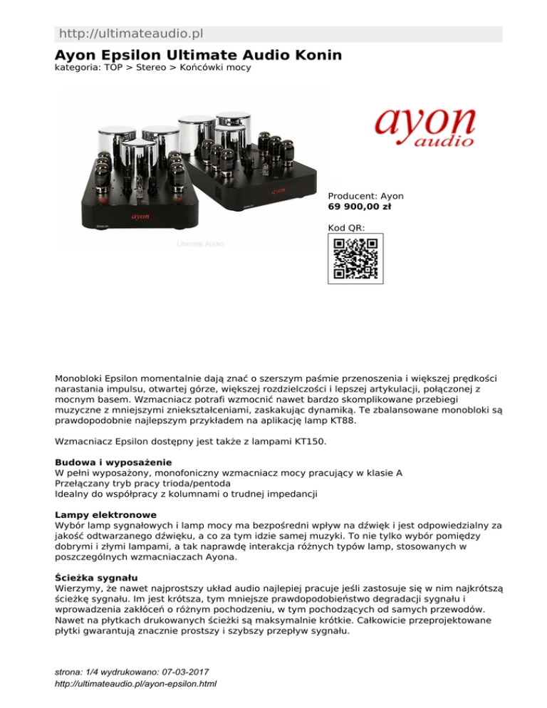 http://ultimateaudio.pl Ayon Epsilon Ultimate Audio Konin kategoria: TOP > Stereo > Końcówki mocy Producent: Ayon 69 900,00 zł Kod QR: Monobloki Epsilon momentalnie dają znać o szerszym paśmie przenoszenia i większej prędkości narastania impulsu, otwartej górze, większej rozdzielczości i lepszej artykulacji, połączonej z mocnym basem. Wzmacniacz potrafi wzmocnić nawet bardzo skomplikowane przebiegi muzyczne z mniejszymi zniekształceniami, zaskakując dynamiką. Te zbalansowane monobloki są prawdopodobnie najlepszym przykładem na aplikację lamp KT88. Wzmacniacz Epsilon dostępny jest także z lampami KT150. Budowa i wyposażenie W pełni wyposażony, monofoniczny wzmacniacz mocy pracujący w klasie A Przełączany tryb pracy trioda/pentoda Idealny do współpracy z kolumnami o trudnej impedancji Lampy elektronowe Wybór lamp sygnałowych i lamp mocy ma bezpośredni wpływ na dźwięk i jest odpowiedzialny za jakość odtwarzanego dźwięku, a co za tym idzie samej muzyki. To nie tylko wybór pomiędzy dobrymi i złymi lampami, a tak naprawdę interakcja różnych typów lamp, stosowanych w poszczególnych wzmacniaczach Ayona. Ścieżka sygnału Wierzymy, że nawet najprostszy układ audio najlepiej pracuje jeśli zastosuje się w nim najkrótszą ścieżkę sygnału. Im jest krótsza, tym mniejsze prawdopodobieństwo degradacji sygnału i wprowadzenia zakłóceń o różnym pochodzeniu, w tym pochodzących od samych przewodów. Nawet na płytkach drukowanych ścieżki są maksymalnie krótkie. Całkowicie przeprojektowane płytki gwarantują znacznie prostszy i szybszy przepływ sygnału. strona: 1/4 wydrukowano: 07-03-2017 http://ultimateaudio.pl/ayon-epsilon.html Sekwencja startowa soft-start, przedłużająca żywotność lamp Układ zabezpieczający lampy i cały układ elektroniczny Zerowe sprzężenie zwrotne (0 dB) DHT Ultra-krótka ścieżka sygnału Uproszczony układ wzmacniający, dający czystszy dźwięk i poprawiający niezawodność wzmacniacza Brak w ścieżce sygnału elementów półprzewodnikowych Układ o wysokiej wydajności prądowej, niskiej impedancji wyjściowej, w którym lampy pracują w najlepszym przedziale krzywych wzmocnienia Minimalne okablowanie, poprawiające propagację sygnału Automatyczna i manualna regulacja prądu podkładu lamp (biasu) Brak buforów w ścieżce sygnału Wysokiej klasy elementy bierne Zasilanie Mając na względzie specyficzne wymogi zasilacz tego wzmacniacza został na nowo opracowany oraz wyposażony w nowe komponenty i lepsze filtrowanie napięcia sieciowego AC. Osobne transformatory zasilające, dławiki i filtry dla poszczególnych stopni umożliwiają całkowitą izolację sekcji wejściowej i wyjściowej. Zastosowano znacznie większe niż zazwyczaj kondensatory elektrolityczne, zmniejszając dzięki temu straty wynikające z zastosowania oporników w filtrach typu Pi. Dwa odseparowane, niskoszumne transformatory zasilające Zaekranowane, tłumione mechanicznie transformatory, chronione przed promieniowaniem RFI/EMI Innowacyjny układ zasilający, zapewniający wystarczający zapas mocy dla szybkich, transjentowych elementów sygnału Dwa dławiki filtrujące napięcie dla lamp wyjściowych Dławik filtrujący napięcie dla lamp wejściowych i sterujących Separowane, izolowane układy zasilające dla każdego stopnia wzmocnienia Stabilizowany układ napięcia żarzenia z miękkim startem Filtr napięcia zasilającego AC Ograniczenie prądu początkowego Automatyczna sekwencja startu – trwa 1 minutę Podwójna ścieżka masy Modyfikacje w topologii ścieżki masy doprowadziły do zwiększonej odporności na szum pochodzący od zasilacza i innych układów. Topologia z podwójną masą, stosowana we wszystkich wzmacniaczach Ayon Audio jest unikalnym rozwiązaniem, spotykanym we wzmacniaczach lampowych niezwykle rzadko. Tak wyrafinowana topologia odpowiada za znacznie niższy poziom szumów tła. Daje to też poprawę kontroli basu i pełny dźwięk o dużej skali. Duży nacisk położono również na prowadzenie masowej części ścieżki sygnału. Przełącznik masy Centralny punkt z masą prowadzoną w formie gwiazdy Podwójna ścieżka masy (przełączana – osobno dla ścieżki sygnału i dla zasilania) Transformatory głośnikowe strona: 2/4 wydrukowano: 07-03-2017 http://ultimateaudio.pl/ayon-epsilon.html Największą zaletą transformatorów o ultra-szerokim paśmie przenoszenia jest ich zdolność oddania wysokich prądów w zakresie basu, przy jednoczesnym zachowaniu szybkiego oddawania wysokich częstotliwości, co przekłada się na dramatyczną poprawę przenoszenia sygnału kwadratowego. Efektem jest zrelaksowany, bardziej naturalny dźwięk o znacznie lepszej klarowności, rozdzielczości i płynności. Super-szerokie pasmo przenoszenia Wysoka skuteczność pozwalająca na duże transfery prądu i napięcia Wielowarstwowe, ciasne nawijanie, poprawiające szerokość pasma przenoszenia Materiał tłumiący drgania, którym transformatory są zalewane Komponenty Typ i rodzaj elementów biernych musi zgrać się synergicznie w zależności od konkretnego układu. I właśnie rodzaj tych zależności, jak elementy ze sobą współpracują itp. odróżniają produkty masowe od ekskluzywnych produktów hi-end. Selekcjonowane, wysokiej klasy pasywne komponenty zastosowane we wszystkich miejscach układu Charakteryzujące się szybkim przeładowaniem, wysokiej klasy kondensatory sprzęgające Specjalne podstawki z miedziano-berylowymi stykami sprężynowymi, wykonywane samodzielnie przez Ayona Gniazda głośnikowe niemieckiej firmy WBT Gniazda wejściowe RCA niemieckiej firmy WBT Gniazda wejściowe XLR szwajcarskiej firmy Neutrik Specjalnie izolowane okablowanie wewnętrzne Srebrno-miedziane okablowanie Płytki drukowane ze złoconymi ścieżkami Wysokiej klasy gniazda głośnikowe Nowe gniazda głośnikowe Ayona gwarantują jakość dźwięku sytuującą ten wzmacniacz w high endzie. Solidna konstr