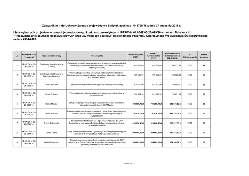 Załącznik nr 1 do Uchwały Zarządu Województwa Świętokrzyskiego Nr 1799/16 z dnia 27 września 2016 r. Lista wybranych projektów w ramach jednoetapowego konkursu zamkniętego nr RPSW.04.01.00-IZ.00-26-029/16 w ramach Działania 4.1 "Przeciwdziałanie skutkom klęsk żywiołowych oraz usuwanie ich skutków" Regionalnego Programu Operacyjnego Województwa Świętokrzyskiego na lata 2014-2020 Wartość ogółem (PLN) Wydatki kwalifikowalne (PLN) Lp. Numer wniosku (sygnatura) Nazwa wnioskodawcy Tytuł projektu 1 RPSW.04.01.0026-0022/16 Ochotnicza Straż Pożarna w Czarncy Zakup wozu pożarniczego wyposażonego w sprzęt do prowadzenia akcji ratowniczych i usuwania skutków katastrof dla Ochotniczej Straży Pożarnej w Czarncy 855 356,69 855 356,69 2 RPSW.04.01.0026-0032/16 Ochotnicza Straż Pożarna w Skarżysku-Kamiennej Poprawa bezpieczeństwa publicznego na terenie Gminy SkarżyskoKamienna poprzez zakup średniego samochodu ratowniczo - gaśniczego wraz z wyposażeniem. 799 500,00 3 RPSW.04.01.0026-0023/16 Gmina Staszów Zakup samochodu dla Ochotniczej Straży Pożarnej w Wiśniowej 4 RPSW.04.01.0026-0011/16 Gmina Połaniec Poprawa jakości systemów wczesnego reagowania i ratownictwa w Gminie Połaniec 5 RPSW.04.01.0026-0013/16 Gmina Masłów 6 RPSW.04.01.0026-0010/16 7 Przyznana kwota dofinansowania z EFRR (PLN) % dofinansowania Liczba punktów 641 517,51 75,00 44 799 500,00 599 625,00 75,00 41 938 600,00 938 600,00 703 950,00 75,00 39 952 921,59 952 921,59 714 691,19 75,00 38 Zakup samochodu strażackiego z wyposażeniem w celu zwiększenia gotowości bojowej jednostki OSP Masłów 802 686,70 zł 794 208,70 zł 595 656,52 zł 75,00 37 Gmina Krasocin Poprawa systemu wczesnego reagowania i ratownictwa na terenie gminy Krasocin, poprzez zakup samochodu ratowniczo-gaśniczego z wyposażeniem 797 010,76 zł 797 010,76 zł 597 758,07 zł 75,00 37 RPSW.04.01.0026-0019/16 Gmina Bodzechów Zakup samochodu strażackiego i agregatu pompowego dla OSP Bodzechów w celu przeciwdziałania skutkom klęsk żywiołowych oraz usuwania ich skutków 313 636,47 zł 313 636,47 zł 235 227,35 zł 75,00 37 8 RPSW.04.01.0026-0017/16 Gmina Górno Zakup samochodu ratowniczo – gaśniczego wraz ze sprzętem ratującym życie dla Ochotniczej Straży Pożarnej w Woli Jachowej 909 804,80 zł 909 804,80 zł 682 353,60 zł 75,00 37 9 RPSW.04.01.0026-0041/16 Gmina Daleszyce Zakup nowoczesnego samochodu ratowniczo-gaśniczego dla OSP Niestachów w Gminie Daleszyce w celu przeciwdziałania skutkom klęsk żywiołowych oraz usuwania ich skutków 885 809,10 zł 885 809,10 zł 664 356,82 zł 75,00 36 Strona 1 z 2 10 RPSW.04.01.0026-0038/16 Gmina Brody Zakup średniego samochodu ratowniczo-gaśniczego na podwoziu 4x4 z wyposażeniem dla OSP Lubienia 900 000,00 zł 900 000,00 zł 675 000,00 zł 75,00 36 11 RPSW.04.01.0026-0014/16 Gmina Radoszyce Poprawa systemu wczesnego reagowania i ratownictwa w przypadku wystąpienia zagrożenia w Gminie Radoszyce poprzez zakup nowoczesnego samochodu ratowniczo-gaśniczego z wyposażeniem 755 389,00 zł 755 389,00 zł 550 000,00 zł 73,00 36 12 RPSW.04.01.0026-0001/16 Gmina Pacanów Zakup średniego samochodu strażackiego wraz z wyposażeniem dla Ochotniczej Straży Pożarnej w miejscowości Pacanów 812 618,00 zł 812 618,00 zł 609 463,50 zł 75,00 35 13 RPSW.04.01.0026-0036/16 Gmina Raków Zakup samochodu dla Ochotniczej Straży pożarnej w celu przeciwdziałaniu skutkom klęsk żywiołowych oraz usuwaniu ich skutków 273 652,00 zł 273 529,00 zł 205 146,75 zł 75,00 34 14 RPSW.04.01.0026-0025/16 Gmina Koprzywnica Zakup samochodu ratowniczo-gaśniczego dla OSP Ciszyca w Gminie Koprzywnica - przeciwdziałanie skutkom klęsk żywiołowych oraz usuwania ich skutków 804 481,50 zł 804 481,50 zł 603 361,12 zł 75,00 34 15 RPSW.04.01.0026-0006/16 Gmina Miedziana Góra Zakup ciężkiego samochodu ratowniczo- gaśniczego wraz z wyposażeniem dla Ochotniczej Straży Pożarnej w Ćmińsku 1 011 090,00 zł 1 011 090,00 zł 758 317,50 zł 75,00 34 11 812 556,61 11 803 955,61 8 836 424,93 Razem: Strona 2 z 2