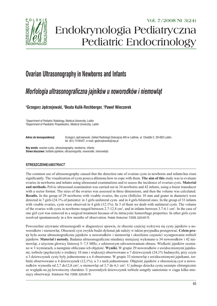 Jędrzejewski G. i inni – Ovarian ultrasonography in newborn and neonates Vol. 7/2008 Nr 3(24) Endokrynologia Pediatryczna Pediatric Endocrinology Ovarian Ultrasonography in Newborns and Infants Morfologia ultrasonograficzna jajników u noworodków i niemowląt Grzegorz Jędrzejewski, 2Beata Kulik-Rechberger, 1Paweł Wieczorek 1 Department of Pediatric Radiology, Medical University, Lublin Department of Paediatric Propedeutics, Medical University, Lublin 1 2 Adres do korespondencji: Grzegorz Jędrzejewski, Zakład Radiologii Dziecięcej AM w Lublinie, ul. Chodźki 2, 20-093 Lublin, tel: (81) 7418447, e-mail: [email protected] Key words: ovarian cysts, ultrasonography, newborns, infants Słowa kluczowe: torbiele jajników, ultrasonografia, noworodki, niemowlęta STRESZCZENIE/ABSTRACT The common use of ultrasonography caused that the detection rate of ovarian cysts in newborns and infants has risen significantly. The visualization of cysts poses a dilemma how to cope with them. The aim of this study was to evaluate ovaries in newborns and infants using ultrasound examinations and to assess the incidence of ovarian cysts. Material and methods. Pelvic ultrasound examination was carried out in 34 newborns and 42 infants, using a linear transducer with a sector format. The sizes of the ovaries was assessed in three dimensions, and then the volume was calculated. Results. In the group of 29 newborns with visable ovaries, the cysts (follicles 10 mm and grater in diameter) were detected in 7 girls (24.1% of patients): in 3 girls unilateral cysts and in 4 girls bilateral ones. In the group of 33 infants with visable ovaries, cysts were observed in 4 girls (12.1%). In 3 of them we dealt with unilateral cysts. The volume of the ovaries with cysts in newborns ranged between 2.7-12.8 cm3, and in infants between 3.7-6.1 cm3. In the case of one girl cyst was removed in a surgical treatment because of its intracystic hemorrhage properties. In other girls cysts resolved spontaneously in a few months of observation. Pediatr. Endocrinol. 7/2008; 3(24):65-70. Powszechne używanie ultrasonografii w diagnostyce sprawia, że obecnie częściej wykrywa się cysty jajników u noworodków i niemowląt. Obecność cyst zwykle budzi dylemat jak należy w takim przypadku postępować. Celem pracy była ocena ultrasonograficzna jajników u noworodków i niemowląt i określenie częstości występowania torbieli jajników. Materiał i metody. Badania ultrasonograficzne miednicy mniejszej wykonano u 34 noworodków i 42 niemowląt, z użyciem głowicy liniowej 5–7,5 MHz, z sektorowym odwzorowaniem obrazu. Wielkość jajników oceniano w 3 wymiarach, a następnie obliczano ich objętość. Wyniki. W grupie 29 noworodków z uwidocznionymi jajnikami, torbiele (pęcherzyki o średnicy 10 mm i większej) obserwowano u 7 dziewczynek (24,1% badanych), przy czym u 3 dziewczynek cysty były jednostronne a u 4 obustronne. W grupie 33 niemowląt z uwidocznionymi jajnikami, torbiele obserwowano u 4 dziewczynek (12,1%), u 3 z nich jednostronne. Objętość jajników z obecnością cyst u noworodków wynosiła od 2,7 do12,8 cm3, u niemowląt od 3,7 do 6,1 cm3. U jednego dziecka cystę usunięto chirurgicznie ze względu na jej krwotoczny charakter. U pozostałych dziewczynek torbiele ustąpiły samoistnie w ciągu kilku miesięcy obserwacji. Endokrynol. Ped. 7/2008; 3(24):65-70. 65 Praca oryginalna Pelvic ultrasound appears to be a routine gynaecological examination. Normal values for ovarian measurements in adults have been revised over the past decades. Less is known about ovaries in children, especially in newborns and infants. In these patients ultrasound examinations are made mainly to exclude congenital malformations. During abdomen and pelvic ultrasound examinations small cystic lesions in ovaries that made doctors and parents concerned are usually detected accidentally [1-3]. According to Strickland [4], small simple cysts found accidentally in childhood should be considered as normal findings. The controversial issue seems to be the size of follicles, which may be named the cyst. Cohen and co-authors [1] apply the term of the cyst to all cystic lesions in an ovary, regardless of their size. They noted ovarian cysts in 84% out of 98 investigated patients. The majority of authors [4-6] claim that the cyst should have 9-10 mm and more in diameter. They are usually functional, which is a consequence of follicular growth and atresia [4]. In the case of large cysts it is recommended to carefully assess the size, shape, localization, walls of the cyst and its internal structure. To make the diagnose more reliable, the urinary and digestive systems should also be assessed [5]. The incidence of cystic lesions increases the ovarian volume [3]. The aim of this study was to evaluate ovaries in newborns and infants during ultrasound examinations, assess the incidence of ovarian cysts as well as to follow their natural history. Material and methods Pelvic ultrasound was performed in 76 girls. The patients were divided into two groups. The first group consisted of 34 newborns, girls born in time and premature ones, whose corrected age did not exceed four weeks. The second group consisted of 42 girls aged between four weeks to 12 months (mean 3,5±2,1 month). Pelvic ultrasound was performed using a linear transducer with a sector format. The sizes of the ovaries were assessed in three dimensions, and then the volume was calculated. Girls with ovarian cysts had regular ultrasound review in 2-4 week periods. The observation lasted up to 24 weeks. Results The ovaries were visualized in 29 out of 34 girls from the first age group. In 10 girls the 66 Endokrynol. Ped., 7/2008;3(24):65-70 ovaries consisted of small follicles, up to 2 mm in diameter. In 12 girls bigger follicles were found, with a diameter ranging from 3 to 10 mm [Fig.1]. The cysts (follicles grater than 10 mm in diameter) were observed in 7 girls, which represents 24% of patie