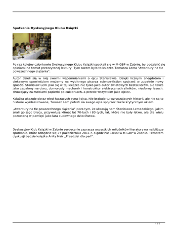 Spotkanie Dyskusyjnego Klubu Książki Po raz kolejny członkowie Dyskusyjnego Klubu Książki spotkali się w M-GBP w Żabnie, by podzielić się opiniami na temat przeczytanej lektury. Tym razem była to książka Tomasza Lema "Awantury na tle powszechnego ciążenia". Autor dzieli się w niej swoimi wspomnieniami o ojcu Stanisławie. Dzięki licznym anegdotom i ciekawym opowieściom możemy na wybitnego pisarza science-fiction spojrzeć w zupełnie nowy sposób. Stanisław Lem jawi się w tej książce nie tylko jako autor światowych bestsellerów, ale także jako zapalony narciarz, domorosły mechanik i konstruktor elektrycznych silników, niesforny łasuch, chowający za meblami papierki po cukierkach, a przede wszystkim jako ojciec. Książka ukazuje obraz więzi łączących syna i ojca. Nie brakuje tu wzruszających historii, ale nie są to historie wyidealizowane, Tomasz Lem potrafi na swego ojca spojrzeć także krytycznym okiem. „Awantury na tle powszechnego ciążenia” poza tym, że ukazują nam Stanisława Lema takiego, jakim znali go jego bliscy, przywołują klimat lat 70-tych i 80-tych, lat, które nie były łatwe, ale dla wielu pozostaną w pamięci jako lata cudownego dzieciństwa. Dyskusyjny Klub Książki w Żabnie serdecznie zaprasza wszystkich miłośników literatury na najbliższe spotkanie, które odbędzie się 27 października 2011 r. o godzinie 18:00 w M-GBP w Żabnie. Tematem dyskusji będzie książka Anity Nair „Przedział dla pań”. 1/1 Powered by TCPDF (www.tcpdf.org)