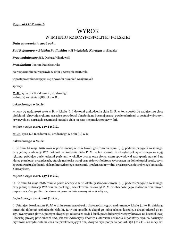 Sygn. akt II K 146/16 WYROK W IMIENIU RZECZYPOSPOLITEJ POLSKIEJ Dnia 23 września 2016 roku Sąd Rejonowy w Bielsku Podlaskim w II Wydziale Karnym w składzie: Przewodniczący SSR Dariusz Wiśniewski Protokolant Joanna Radziszewska po rozpoznaniu na rozprawie w dniu 9 września 2016 roku w postępowaniu toczącym się z powodu oskarżeń wzajemnych sprawy: P. M., syna R. i B. z domu R., urodzonego w dniu 27 września 1988 roku w B., oskarżonego o to, że: w nocy 29 maja 2016 roku w B. w lokalu (...) dokonał uszkodzenia ciała M. R. w ten sposób, że zadając mu ciosy pięściami i chwytając rękoma za szyję spowodował obrażenia na bocznej prawej powierzchni szyi w postaci wybroczyn krwawych, co naruszyło czynności narządu ciała na czas nie przekraczający 7 dni, to jest o czyn z art. 157 § 2 k.k., M. R., syna K. i B. z domu B., urodzonego w dniu (...) w B., oskarżonego o to, że: I. w dniu 29 maja 2016 roku w porze nocnej w B. w lokalu gastronomicznym (...), podczas przyjęcia weselnego, przy jednej z ubikacji WC, dokonał uszkodzenia ciała P. M. w ten sposób, że chwytał pokrzywdzonego za szyję rękoma, próbując dusić, uderzał pięściami w okolice twarzy oraz głowy, czym spowodował zadrapania na szyi i na klatce piersiowej oraz plecach, otarcie naskórka wargi oraz różowo-fioletowy wybroczyn na dolnej części brody, czym spowodował uszkodzenie ciała pokrzywdzonego na czas nie przekraczający 7 dni, oraz rozerwanie srebrnego łańcuszka z krzyżykiem, to jest o czyn z art. 157 § 2 k.k., II. w dniu 29 maja 2016 roku w porze nocnej w B. w lokalu gastronomicznym (...), podczas przyjęcia weselnego, przy jednej z ubikacji WC oraz na parkingu, wielokrotnie znieważył P. M. w obecności jego małżonki oraz innych imprezowiczów, publicznie, słowami powszechnie uznanymi za obelżywe, to jest o czyn z art. 216 § 1 k.k., I. Ustalając, że oskarżony P. M. w dniu 29 maja 2016 roku około godziny 3:00 nad ranem, w lokalu (...) w B., działając umyślnie, dokonał uszkodzenia ciała M. R. w ten sposób, że złapał go jedną ręką za koszulę, a drugą uderzał go po szyi, twarzy oraz głowie, po czym chwycił go rękoma za szyję i dusił, powodując wybroczyny krwawe na bocznej lewej i bocznej prawej powierzchni szyi, jak też wybroczyny krwawe z otarciem naskórka u podstawy szyi, co naruszyło czynności narządu ciała na czas nie przekraczający 7 dni, który to czyn podpada pod art. 157 § 2 k.k. – na mocy art. 66 § 1 i § 2 k.k. oraz art. 67 § 1 k.k. postępowanie karne wobec tego oskarżonego warunkowo umarza na okres próby wynoszący 2 (dwa) lata. II. Na mocy art. 67 § 3 k.k. orzeka od oskarżonego P. M. nawiązkę na rzecz Funduszu Pomocy Pokrzywdzonym oraz Pomocy Postpenitencjarnej w wysokości 1000 (jeden tysiąc) złotych. III. Zasądza od oskarżonego P. M. na rzecz oskarżyciela prywatnego M. R. kwotę 2214 (dwa tysiące dwieście czternaście) złotych tytułem zwrotu poniesionych przez niego kosztów zastępstwa prawnego. IV. Oskarżonego M. R. uniewinnia od popełnienia obu zarzuconych mu czynów i w tym zakresie kosztami procesu obciąża oskarżyciela prywatnego (wzajemnego) P. M.. Sędzia : II K 146/16 UZASADNIENIE Sąd ustalił następujący stan faktyczny: W nocy z 28 na 29 maja 2016 roku w lokalu (...) w B. odbywało się przyjęcie weselne z okazji ślubu W. B.. Bawili się na nim M. R. z żoną I. R., a także P. M. z żoną A. M.. Rodziny obu wymienionych mężczyzn od dłuższego czasu pozostawały w konflikcie, dlatego też w trakcie imprezy, mimo siedzenia przy jednym stole, ignorowali się oni wzajemnie i w ogóle ze sobą nie rozmawiali. Około godziny 3:00 nad ranem I. R. poprosiła męża, by towarzyszył jej w drodze do toalety, albowiem obawiała się zaczepek ze strony pijanych gości weselnych. Kobieta weszła następnie do ubikacji, a M. R. usiadł na kanapie ustawionej w korytarzu prowadzącym do tego pomieszczenia i oczekiwał na jej powrót. W pewnym momencie, do tego samego korytarza wkroczył P. M., który też zamierzał skorzystać z łazienki. Wymieniony, widząc samotnego M. R., podbiegł do niego, nachylił się nad nim i zaczął krzyczeć „ile za dzierżawę”, nawiązując w ten sposób do sporu o działkę rolną, który był zarzewiem konfliktu pomiędzy ich rodzinami. M. R. zażądał od swojego adwersarza, aby ten zostawił go w spokoju. P. M. złapał go wówczas jedną ręką za koszulę i przycisnął do kanapy, a drugą zaczął go uderzać po szyi, twarzy i głowie. M. R. starał się uchylać przed tymi ciosami i próbował wyrwać się napastnikowi, jednak z uwagi na znaczną dysproporcję wzrostu i masy ciała nie był w stanie podjąć skutecznej obrony. Następnie, P. M. złapał go dwoma rękoma za szyję i zaczął dusić. Świadkiem całego zdarzenia była I. R., która chwilę wcześniej wyszła z ubikacji. Kobieta krzyczała do napastnika, by puścił jej męża, i starała się go odciągnąć, ale również nie dała rady go powstrzymać. Jej krzyki usłyszeli jednak dwaj goście weselni, którzy przybiegli do korytarza przy toalecie, chwycili P. M. i odsunęli go od jego ofiary. W tym momencie, na miejscu zajścia pojawiła się też A. M., która zażądała od męża, aby się uspokoił i udał się z nią do auta, stwierdzając, że wracają do domu. Po upływie około 10 minut od ich odejścia, M. R. wyszedł przed lokal, chcąc upewnić się, iż faktycznie opuścili oni przyjęcie. Zauważył wówczas przejeżdżający przez pobliski parking samochód osobowy, którym kierowała A. M.. P. M. siedział na przednim fotelu pasażera, lecz na widok M. R. wyskoczył z pojazdu, przewracając się na kostce brukowej, po czym wstał i zaczął biec w stronę swojego adwersarza, wymachując przy tym rękoma, wyzywając go wulgarnie i krzycząc, że go zabije. M. R. cofnął się do wnętrza lokalu, ale P. M. wbiegł tam za nim. Część gości weselnych, w tym M. W., zorientowała s