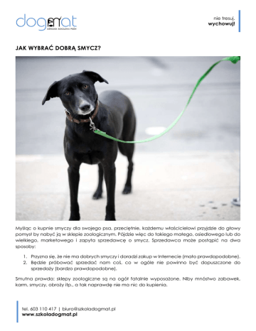 nie tresuj. wychowuj! JAK WYBRAĆ DOBRĄ SMYCZ? Myśląc o kupnie smyczy dla swojego psa, przeciętnie, każdemu właścicielowi przyjdzie do głowy pomysł by nabyć ją w sklepie zoologicznym. Pójdzie więc do takiego małego, osiedlowego lub do wielkiego, marketowego i zapyta sprzedawcę o smycz. Sprzedawca może postąpić na dwa sposoby: 1. Przyzna się, że nie ma dobrych smyczy i doradzi zakup w Internecie (mało prawdopodobne). 2. Będzie próbować sprzedać nam coś, co w ogóle nie powinno być dopuszczone do sprzedaży (bardzo prawdopodobne). Smutna prawda: sklepy zoologiczne są na ogół fatalnie wyposażone. Niby mnóstwo zabawek, karm, smyczy, obroży itp., a tak naprawdę nie ma nic do kupienia. tel. 603 110 417 | [email protected] www.szkoladogmat.pl nie tresuj. wychowuj! Jak dobrać smycz? 1. Smycz dobieramy do psa Wydaje się to dość oczywiste, że smycz dobieramy do rozmiaru psa. Nie kupimy przecie grubej, metalowej smyczy dla Maltańczyka. W tym przypadku rozmiar jak najbardziej się liczy, w tym przypadku raczej grubość. 2. Odpowiednia długość Rozmiaru ciąg dalszy. Żeby smycz była wygodna, powinna mieć odpowiednią długość. Nie wiedzieć czemu, większość smyczy oferowanych w polskich sklepach stacjonarnych ma długość od 1m do 1,5m. Kupienie dłuższej smyczy graniczy z cudem. Jeżeli mamy dużego psa (np. Owczarek Niemiecki) to nie jest aż tak źle, ale jeśli naszym pupilem jest York, to 1,5m może się okazać, a raczej na pewno okaże się zbyt krótkie. Poniżej dowód graficzny. Na oko widać że x > a W skrócie mówiąc: im mniejszy pies, tym większa odległość pomiędzy naszą ręką a psem, co oznacza, że pies będzie bliżej nas. Podsumowując: 1,5m to za mało! Odpowiedni smycz powinna mieć długość pomiędzy 2,5m do 3m. tel. 603 110 417 | [email protected] www.szkoladogmat.pl nie tresuj. wychowuj! 3. To może smycz automatyczna? O tej smyczy na pewno nie powiemy, że jest za krótka. Czy polecam? Nie. Czy się do czegoś ten rodzaj smyczy nadaje? Można tak powiedzieć, ale od początku… Pierwszą wadą smyczy automatycznej jest fakt, że jest zawsze napięta. Przy takiej smyczy psy (a szczególnie szczeniaki) świetnie kojarzą fakty, że napięcie smyczy oznacza „mogę iść dalej!” Druga wada, to brak wyczucia dystansu. Jeśli pracujemy na normalnej smyczy i ma ona 2,5m to pies z biegiem czasu przyzwyczai się do tej odległości i wie, kiedy ma zwolnić. Automatyczna smycz raz ma długość 5m, czasem 1m, a jeszcze kiedy indziej 3m – w zależności od tego, kiedy właściciel naciska przycisk. Numer trzy – utrudnia szkolenie. Szczególnie jeśli w jednej ręce trzymamy kliker, w drugiej smakołyk, a smycz? Już nie ma gdzie jej trzymać… Zalety? Jest wygodna dla ludzi. Osobiście uważam, że nadaje się dla starszych psów i starszych ludzi. 4. Coś jeszcze? Nieautomatyczna, o długości 2,5m – 3m, o odpowiednio dobranej szerokości w zależności od psa – to na pewno. Sam wole smyczy materiałowe niż skórzane (są zresztą o wiele tańsze, a wytrzymałość jest całkiem niezła). Niektóre mają jeszcze regulacje długości – dla mnie przydatne w celu zapięcia psa do samochodu. Wystarczy! Gdzie kupić skoro nie w zoologicznym? Można próbować w zoologicznym. Być może to ja mieszkam w złej okolicy i trafiam do złych sklepów. Niezastąpionym jednak źródłem smyczy jest Internet. Wybór szeroki, ceny przyzwoite – czego chcieć więcej. Zdarza się też, że na wystawach psów można kupić coś fajnego. P.S. Nauka chodzenia na smyczy dotyczy nie tylko psa! Jeżeli kupimy 3 metrową smycz naszemu psu, nauczmy sami się z niej korzystać. Na początku na pewno nie będzie wygodnie, ale wierzcie mi, że po przyzwyczajeniu się, nie zamienicie takiej smyczy na nic innego. tel. 603 110 417 | [email protected] www.szkoladogmat.pl