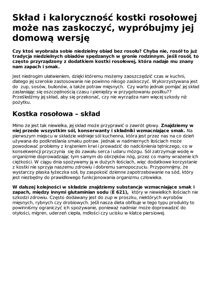 Skład i kaloryczność kostki rosołowej może nas zaskoczyć, wypróbujmy jej domową wersję Czy ktoś wyobraża sobie niedzielny obiad bez rosołu? Chyba nie, rosół to już tradycja niedzielnych obiadów spędzanych w gronie rodzinnym. Jeśli rosół, to często przyrządzony z dodatkiem kostki rosołowej, która nadaje mu znany nam zapach i smak. Jest niedrogim ułatwieniem, dzięki któremu możemy zaoszczędzić czas w kuchni, dlatego jej szerokie zastosowanie nie powinno nikogo zaskoczyć. Wykorzystywana jest do zup, sosów, bulionów, a także potraw mięsnych. Czy warto jednak pomijać jej skład zasłaniając się oszczędnością czasu i pieniędzy w przygotowaniu posiłku?? Prześledźmy jej skład, aby się przekonać, czy nie wyrządza nam więcej szkody niż pożytku. Kostka rosołowa – skład Mimo że jest tak niewielka, jej skład może przyprawić o zawrót głowy. Znajdziemy w niej przede wszystkim sól, konserwanty i składniki wzmacniające smak. Na pierwszym miejscu w składzie widnieje sól kuchenna, która jest przez nas na co dzień używana do podkreślania smaku potraw. Jednak w nadmiernych ilościach może powodować problemy z krążeniem krwi i prowadzić do nadciśnienia tętniczego, co w konsekwencji przyczynia się do zawału serca i udaru mózgu. Sól zatrzymuje wodę w organizmie doprowadzając tym samym do obrzęków nóg, przez co mamy wrażenie ich ciężkości. W ciągu dnia spożywamy ją w dużych ilościach, więc dodatkowe korzystanie z kostki nie sprzyja naszemu zdrowiu i dobremu samopoczuciu. Przypomnijmy, że wystarczy płaska łyżeczka soli, by zaspokoić dzienne zapotrzebowanie na sód, który jest niezbędny do prawidłowego funkcjonowania organizmu człowieka. W dalszej kolejności w składzie znajdziemy substancje wzmacniające smak i zapach, między innymi glutaminian sodu (E 621), który w niewielkich ilościach nie szkodzi zdrowiu. Często dodawany jest do zup w proszku, niektórych wyrobów mięsnych, rybnych czy drobiowych. Jeśli nasza dieta obfituje w tego typu produkty to powinniśmy ograniczyć ich spożywanie, ponieważ nadmiar może doprowadzić do otyłości, migren, uderzeń ciepła, mdłości czy ucisku w klatce piersiowej. W kostce rosołowej znajdziemy sól, konserwanty i składniki wzmacniające smak. Następny składnik to inozynian disodowy (E 631), który czesto znajduje się w składzie sosów z proszku, koncentratów i wędlin. Ma wzmacniać smak i zapach. Nie jest szkodliwy, lecz osoby z dną moczanową i kamieniami nerkowymi powinny na niego uważać. Kolejny dodatek to guanylan disodowy (E 627), którego właściwości i występowanie są podobnej. Spożywany w nadmiarze może powodować bóle głowy i zaparcia. Powstaje w wyniku zasuszenia glonów morskich i ryb. W kostkach rosołowych znajdziemy także karmel amoniakalny (E150c), brązowy barwnik, którego lepiej unikać, ponieważ może wywoływać nadpobudliwość, powodować choroby żołądka, wątroby. Listę składników wzbogaca tłuszcz palmowy, będący źródłem szkodliwych nasyconych kwasów tłuszczowych, przyczyniających się do zwiększenia złego cholesterolu we krwi, a także co ważne, pozbawiony jest witaminy A i E (z powodu rafinacji). W śladowych ilościach występuje natka pietruszki, marchew, seler czy ekstrakt z suszonego mięsa. Kostka rosołowa – kaloryczność Kostka rosołowa ma około 6 kcal, w zależności od składu i producenta. Nie jest to wiele, jednak należy zwrócić uwagę, że składa się w przeważającej części z tłuszczów i soli, które na pewno nie wpływają korzystnie na naszą figurę, zwłaszcza jeśli kostka rosołowa towarzyszy nam na co dzień. Tłuszcze zawierają izomery trans, które negatywnie wpływają na gospodarkę lipidową, powodując problemy z układem krążenia, cukrzycą czy otyłością. Domowa kostka rosołowa Wiedząc, że kostka rosołowa jest skoncentrowanym wywarem wzbogaconym różnymi dodatkami, możemy w bardzo łatwy sposób przyrządzić domową kostkę rosołowąmając całkowitą kontrolę nad jej składem. . Proponuję wykorzystać gotowy już rosół lub bulion warzywny, przelać go do foremek na kostki lodu i zamrozić. Inną alternatywą jest ugotowanie dowolnych warzyw (marchew, seler, cebula, cukinia) i mięsa, dodanie przypraw takich jak pieprz, szałwia, bazylia, pietruszka, a następnie zmiksowanie ich i przełożenie do słoików. Jedna łyżeczka domowej kostki zastąpi kostkę ze sklepu, a potrawa na pewno będzie smaczniejsza i przede wszystkim bogata w naturalne składniki. Przykładowy przepis: 2 marchewki 1 cebula 1 cukinia 200g selera naciowego 1 ząbek czosnku Natka pietruszki, bazylia, szałwia, rozmaryn Sól, pieprz Łyżka oliwy z oliwek Umyte i obrane warzywa pokroićw kostkę, włożyć do głębokiej patelni razem z ziołami i oliwą i dusić pod przykryciem około godziny. Później zmiksowaćwszystko i znów postawić na ogniu, by masa warzywna zgęstniała. Przełożyć następnie wszystko do słoiczka i postawić do góry dnem do wystygnięcia, gotowe! Kostka rosołowa określana mianem półproduktu na pewno pozwala na szybkie i tanie przyrządzenie ulubionej zupy lub sosu. Niestety, nie należy się dać zwieść zapewnieniom producentów, którzy twierdzą że dodają do niej tylko naturalne składniki, bądź te szkodliwe występują w minimalnej ilości. Analizując skład widzimy, że tych naturalnych i nieszkodliwych jest niewiele, a przeważają te, których powinniśmy się wystrzegać, by zachować szczupłą sylwetkę, ale przede wszystkim zdrowie. Warto przyjrzeć się naszym codziennym nawykom i zastąpić w prosty sposób kupną kostkę rosołową tą domową, przygotowaną z własnego wywaru To bardzo proste i nie wymaga wcale tak dużo czasu i wysiłku, a na pewno będzie smakować lepiej. Polecam! Author: Magdalena Mirta Link do artykułu: http://bonavita.pl/sklad-i-kalorycznosc-kostki-rosolowej-moze-naszaskoczyc-wyprobujmy-j