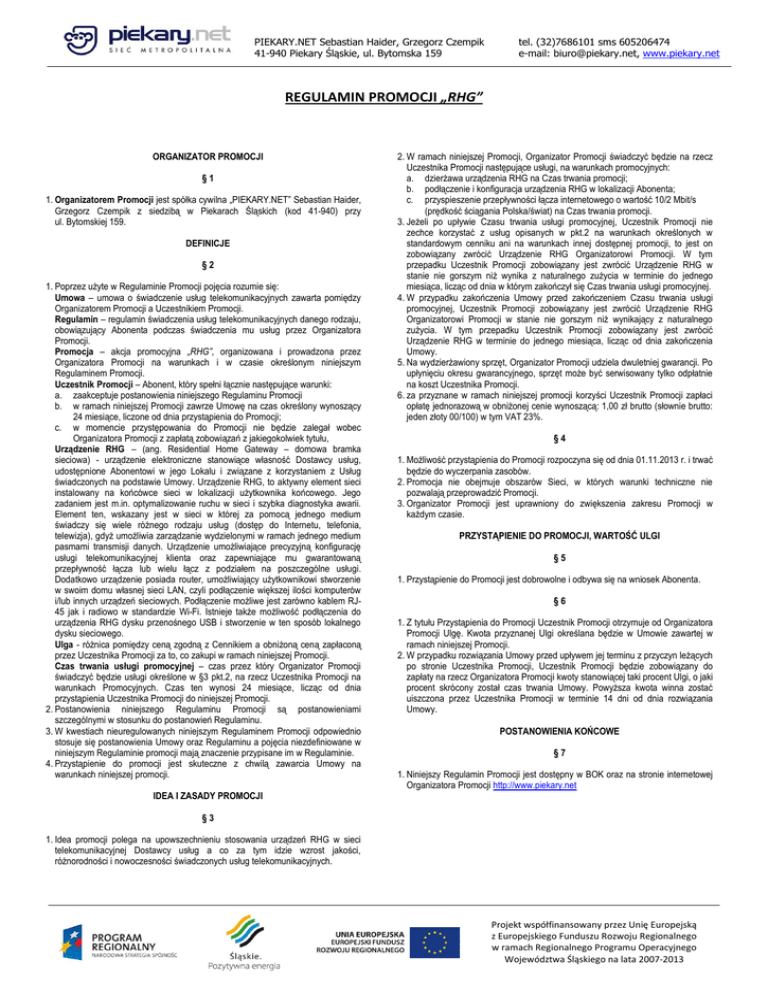 PIEKARY.NET Sebastian Haider, Grzegorz Czempik 41-940 Piekary Śląskie, ul. Bytomska 159 tel. (32)7686101 sms 605206474 e-mail: [email protected], www.piekary.net REGULAMIN PROMOCJI „RHG” ORGANIZATOR PROMOCJI §1 1. Organizatorem Promocji jest spółka cywilna „PIEKARY.NET” Sebastian Haider, Grzegorz Czempik z siedzibą w Piekarach Śląskich (kod 41-940) przy ul. Bytomskiej 159. DEFINICJE §2 1. Poprzez użyte w Regulaminie Promocji pojęcia rozumie się: Umowa – umowa o świadczenie usług telekomunikacyjnych zawarta pomiędzy Organizatorem Promocji a Uczestnikiem Promocji. Regulamin – regulamin świadczenia usług telekomunikacyjnych danego rodzaju, obowiązujący Abonenta podczas świadczenia mu usług przez Organizatora Promocji. Promocja – akcja promocyjna „RHG”, organizowana i prowadzona przez Organizatora Promocji na warunkach i w czasie określonym niniejszym Regulaminem Promocji. Uczestnik Promocji – Abonent, który spełni łącznie następujące warunki: a. zaakceptuje postanowienia niniejszego Regulaminu Promocji b. w ramach niniejszej Promocji zawrze Umowę na czas określony wynoszący 24 miesiące, liczone od dnia przystąpienia do Promocji; c. w momencie przystępowania do Promocji nie będzie zalegał wobec Organizatora Promocji z zapłatą zobowiązań z jakiegokolwiek tytułu, Urządzenie RHG – (ang. Residential Home Gateway – domowa bramka sieciowa) - urządzenie elektroniczne stanowiące własność Dostawcy usług, udostępnione Abonentowi w jego Lokalu i związane z korzystaniem z Usług świadczonych na podstawie Umowy. Urządzenie RHG, to aktywny element sieci instalowany na końcówce sieci w lokalizacji użytkownika końcowego. Jego zadaniem jest m.in. optymalizowanie ruchu w sieci i szybka diagnostyka awarii. Element ten, wskazany jest w sieci w której za pomocą jednego medium świadczy się wiele różnego rodzaju usług (dostęp do Internetu, telefonia, telewizja), gdyż umożliwia zarządzanie wydzielonymi w ramach jednego medium pasmami transmisji danych. Urządzenie umożliwiające precyzyjną konfigurację usługi telekomunikacyjnej klienta oraz zapewniające mu gwarantowaną przepływność łącza lub wielu łącz z podziałem na poszczególne usługi. Dodatkowo urządzenie posiada router, umożliwiający użytkownikowi stworzenie w swoim domu własnej sieci LAN, czyli podłączenie większej ilości komputerów i/lub innych urządzeń sieciowych. Podłączenie możliwe jest zarówno kablem RJ45 jak i radiowo w standardzie Wi-Fi. Istnieje także możliwość podłączenia do urządzenia RHG dysku przenośnego USB i stworzenie w ten sposób lokalnego dysku sieciowego. Ulga - różnica pomiędzy ceną zgodną z Cennikiem a obniżoną ceną zapłaconą przez Uczestnika Promocji za to, co zakupi w ramach niniejszej Promocji. Czas trwania usługi promocyjnej – czas przez który Organizator Promocji świadczyć będzie usługi określone w §3 pkt.2, na rzecz Uczestnika Promocji na warunkach Promocyjnych. Czas ten wynosi 24 miesiące, licząc od dnia przystąpienia Uczestnika Promocji do niniejszej Promocji. 2. Postanowienia niniejszego Regulaminu Promocji są postanowieniami szczególnymi w stosunku do postanowień Regulaminu. 3. W kwestiach nieuregulowanych niniejszym Regulaminem Promocji odpowiednio stosuje się postanowienia Umowy oraz Regulaminu a pojęcia niezdefiniowane w niniejszym Regulaminie promocji mają znaczenie przypisane im w Regulaminie. 4. Przystąpienie do promocji jest skuteczne z chwilą zawarcia Umowy na warunkach niniejszej promocji. 2. W ramach niniejszej Promocji, Organizator Promocji świadczyć będzie na rzecz Uczestnika Promocji następujące usługi, na warunkach promocyjnych: a. dzierżawa urządzenia RHG na Czas trwania promocji; b. podłączenie i konfiguracja urządzenia RHG w lokalizacji Abonenta; c. przyspieszenie przepływności łącza internetowego o wartość 10/2 Mbit/s (prędkość ściągania Polska/świat) na Czas trwania promocji. 3. Jeżeli po upływie Czasu trwania usługi promocyjnej, Uczestnik Promocji nie zechce korzystać z usług opisanych w pkt.2 na warunkach określonych w standardowym cenniku ani na warunkach innej dostępnej promocji, to jest on zobowiązany zwrócić Urządzenie RHG Organizatorowi Promocji. W tym przepadku Uczestnik Promocji zobowiązany jest zwrócić Urządzenie RHG w stanie nie gorszym niż wynika z naturalnego zużycia w terminie do jednego miesiąca, licząc od dnia w którym zakończył się Czas trwania usługi promocyjnej. 4. W przypadku zakończenia Umowy przed zakończeniem Czasu trwania usługi promocyjnej, Uczestnik Promocji zobowiązany jest zwrócić Urządzenie RHG Organizatorowi Promocji w stanie nie gorszym niż wynikający z naturalnego zużycia. W tym przepadku Uczestnik Promocji zobowiązany jest zwrócić Urządzenie RHG w terminie do jednego miesiąca, licząc od dnia zakończenia Umowy. 5. Na wydzierżawiony sprzęt, Organizator Promocji udziela dwuletniej gwarancji. Po upłynięciu okresu gwarancyjnego, sprzęt może być serwisowany tylko odpłatnie na koszt Uczestnika Promocji. 6. za przyznane w ramach niniejszej promocji korzyści Uczestnik Promocji zapłaci opłatę jednorazową w obniżonej cenie wynoszącą: 1,00 zł brutto (słownie brutto: jeden złoty 00/100) w tym VAT 23%. §4 1. Możliwość przystąpienia do Promocji rozpoczyna się od dnia 01.11.2013 r. i trwać będzie do wyczerpania zasobów. 2. Promocja nie obejmuje obszarów Sieci, w których warunki techniczne nie pozwalają przeprowadzić Promocji. 3. Organizator Promocji jest uprawniony do zwiększenia zakresu Promocji w każdym czasie. PRZYSTĄPIENIE DO PROMOCJI, WARTOŚĆ ULGI §5 1. Przystąpienie do Promocji jest dobrowolne i odbywa się na wniosek Abonenta. §6 1. Z tytułu Przystąpienia do Promocji Uczestnik Promocji otrzymuje od Organizatora Promocji Ulgę. Kwota przyznanej Ulgi określana będzie w Umowie zawartej w ramach niniejszej Promocji. 2. W przyp