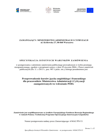 ZAMAWIAJĄCY: MINISTERSTWO ADMINISTRACJI I CYFRYZACJI ul. Królewska 27, 00-060 Warszawa S PE CY FI KACJA I S T O T NYCH WARUNKÓ W ZAMÓ WI E NIA w postępowaniu o udzielenie zamówienia publicznego prowadzonym w trybie przetargu nieograniczonego, zgodnie z przepisami ustawy z dnia 29 stycznia 2004 r. Prawo zamówień publicznych (Dz. U. z 2013 r., poz. 907 z późn. zm.), którego przedmiotem jest: Przeprowadzenie kursów języka angielskiego i francuskiego dla pracowników Ministerstwa Administracji i Cyfryzacji zaangażowanych we wdrażanie POIG Zamówienie jest współfinansowane ze środków Europejskiego Funduszu Rozwoju Regionalnego w ramach Pomocy Technicznej Programu Operacyjnego Innowacyjna Gospodarka Numer postępowania nadany przez Zamawiającego: 6/MAC/PN/15. Strona 1 z 32 Specyfikacja Istotnych Warunków Zamówienia – nr postępowania: 6/MAC/PN/15 DE FI NI CJE : Ilekroć w dalszej części Specyfikacji Istotnych Warunków Zamówienia jest mowa o: „postępowaniu” – należy przez to rozumieć postępowanie o udzielenie zamówienia publicznego prowadzone w trybie przetargu nieograniczonego, którego przedmiotem jest przeprowadzenie kursów języka angielskiego i francuskiego dla pracowników Ministerstwa Administracji i Cyfryzacji zaangażowanych we wdrażanie POIG. „specyfikacji” lub „SIWZ” – należy przez to rozumieć niniejszą Specyfikację Istotnych Warunków Zamówienia wraz z załącznikami; „ustawie” – należy przez to rozumieć ustawę z dnia 29 stycznia 2004 r. - Prawo zamówień publicznych (Dz. U. z 2013 r., poz. 907 z późn. zm.); „Wykonawcy” – należy przez to rozumieć osobę fizyczną, osobę prawną albo jednostkę organizacyjną nieposiadającą osobowości prawnej, która ubiega się o udzielenie zamówienia, złożyła ofertę lub zawarła umowę w sprawie zamówienia; „Zamawiającym” – należy przez to rozumieć Ministerstwo Administracji i Cyfryzacji. WPROWADZENIE 1. Postępowanie prowadzone jest na podstawie ustawy z dnia 29 stycznia 2004 r. - Prawo zamówień publicznych (Dz. U. z 2013 r. poz. 907 z późn. zm.), zwanej dalej „ustawą”. W zakresie nieuregulowanym poniżej stosuje się przepisy ustawy. 2. Treść oferty musi odpowiadać treści Specyfikacji Istotnych Warunków Zamówienia (SIWZ). 3. Postępowanie prowadzone jest w języku polskim. 4. Postępowanie oznaczone jest znakiem 6/MAC/PN/15. Wykonawcy winni we wszelkich kontaktach z Zamawiającym powoływać się na wyżej podane oznaczenie. I. INFORMACJE DODATKOWE 1. Zamawiający nie dopuszcza możliwości składania ofert częściowych. 2. Zamawiający nie dopuszcza składania ofert wariantowych. 3. Zamawiający dopuszcza udział podwykonawców. W wypadku udziału podwykonawców Wykonawca ma obowiązek (zgodnie z art. 36b ust. 1 ustawy) zawrzeć w ofercie (w formularzu Oferty stanowiącym załącznik nr 1 do SIWZ) informacje dotyczące podwykonawstwa. Brak powyższej informacji w ofercie oznaczać będzie, że Wykonawca nie będzie korzystał z podwykonawstwa przy realizacji zamówienia. 4. Zamawiający nie przewiduje możliwości udzielenia zamówień uzupełniających na postawie art. 67 ust. 1 pkt. 6 ustawy. 5. Postępowanie nie jest prowadzone w celu zawarcia umowy ramowej. 6. Zamawiający dopuszcza porozumiewanie się drogą elektroniczną na adres e-mail wskazany w rozdziale VIII SIWZ. 7. Zamawiający nie przewiduje dokonania wyboru najkorzystniejszej oferty z zastosowaniem aukcji elektronicznej, na zasadach określonych w art. 91a – 91c ustawy. 8. Rozliczenia między Zamawiającym, a Wykonawcą będą prowadzone w złotych polskich. Zamawiający nie przewiduje rozliczenia w walutach obcych. 9. Zamówienie jest współfinansowane ze środków Europejskiego Funduszu Rozwoju Regionalnego w ramach Programu Operacyjnego Innowacyjna Gospodarka. 10. Zgodnie z art. 144 ustawy, Zamawiający przewiduje możliwość dokonania zmian Umowy na warunkach określonych w Istotnych postanowieniach umowy, stanowiących załącznik nr 9 do SIWZ. Strona 2 z 32 Specyfikacja Istotnych Warunków Zamówienia – nr postępowania: 6/MAC/PN/15 11. Zamawiający zastrzega, iż zgodnie z art. 93 ust. 1a ustawy, może unieważnić postępowanie o udzielenie zamówienia, jeżeli środki pochodzące z budżetu Unii Europejskiej oraz niepodlegające zwrotowi środki z pomocy udzielonej przez państwa członkowskie Europejskiego Porozumienia o Wolnym Handlu (EFTA), które Zamawiający zamierzał przeznaczyć na sfinansowanie całości lub części zamówienia, nie zostały mu przyznane. II. NAZWA ORAZ ADRES ZAMAWIAJĄCEGO Zamawiający: Ministerstwo Administracji i Cyfryzacji, ul. Królewska 27, 00-060 Warszawa III. TRYB UDZIELENIA ZAMÓWIENIA Postępowanie prowadzone jest w trybie przetargu nieograniczonego. IV. OPIS PRZEDMIOTU ZAMÓWIENIA 1. Przedmiotem zamówienia jest przeprowadzenie kursów języka angielskiego i francuskiego dla pracowników Ministerstwa Administracji i Cyfryzacji zaangażowanych we wdrażanie POIG, zgodnie ze Szczegółowym Opisem Przedmiotu Zamówienia, stanowiącym załącznik nr 10 do SIWZ oraz na warunkach określonych w Istotnych Postanowieniach Umowy, stanowiących załącznik nr 9 do SIWZ. 2. Przedmiot zamówienia określony został we Wspólnym Słowniku Zamówień następującymi kodami i nazwami: 80580000-3 – Oferowanie kursów językowych V. TERMIN WYKONANIA ZAMÓWIENIA 1. Wykonawca zrealizuje przedmiot Umowy w terminie do dnia 15 grudnia 2015 r., z zastrzeżeniem ust. 2 i 3. 2. Kursy rozpoczną się w terminie maksymalnie 1 tygodnia od dnia zawarcia Umowy. 3. Wykonawca w terminie do dnia 15 grudnia 2015 r. przeprowadzi kursy przygotowujące do egzaminów dla 8 uczestników kursów i dokona opłaty za udział uczestników w tych egzaminach. VI. OPIS WARUNKÓW UDZIAŁU W POSTĘPOWANIU ORAZ OPIS SPOSOBU DOKONYWANIA OCENY SPEŁNIANIA TYCH WARUNKÓW O udzielenie zamówienia mogą ubiegać się Wykonawcy spełniający warunki wynikające z art. 22 