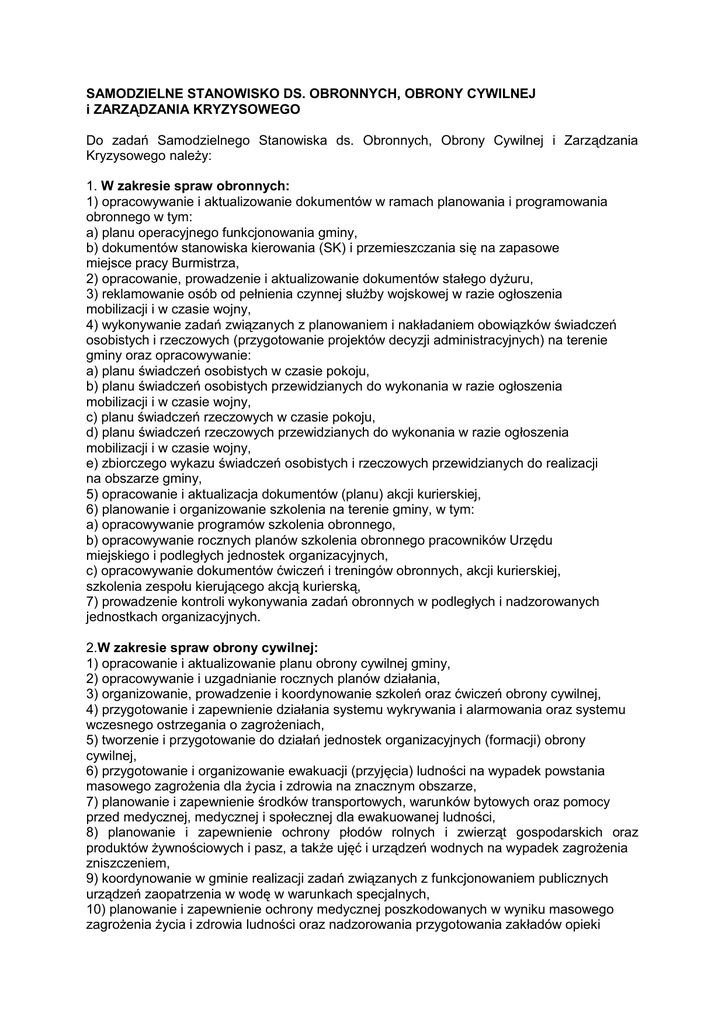 SAMODZIELNE STANOWISKO DS. OBRONNYCH, OBRONY CYWILNEJ i ZARZĄDZANIA KRYZYSOWEGO Do zadań Samodzielnego Stanowiska ds. Obronnych, Obrony Cywilnej i Zarządzania Kryzysowego należy: 1. W zakresie spraw obronnych: 1) opracowywanie i aktualizowanie dokumentów w ramach planowania i programowania obronnego w tym: a) planu operacyjnego funkcjonowania gminy, b) dokumentów stanowiska kierowania (SK) i przemieszczania się na zapasowe miejsce pracy Burmistrza, 2) opracowanie, prowadzenie i aktualizowanie dokumentów stałego dyżuru, 3) reklamowanie osób od pełnienia czynnej służby wojskowej w razie ogłoszenia mobilizacji i w czasie wojny, 4) wykonywanie zadań związanych z planowaniem i nakładaniem obowiązków świadczeń osobistych i rzeczowych (przygotowanie projektów decyzji administracyjnych) na terenie gminy oraz opracowywanie: a) planu świadczeń osobistych w czasie pokoju, b) planu świadczeń osobistych przewidzianych do wykonania w razie ogłoszenia mobilizacji i w czasie wojny, c) planu świadczeń rzeczowych w czasie pokoju, d) planu świadczeń rzeczowych przewidzianych do wykonania w razie ogłoszenia mobilizacji i w czasie wojny, e) zbiorczego wykazu świadczeń osobistych i rzeczowych przewidzianych do realizacji na obszarze gminy, 5) opracowanie i aktualizacja dokumentów (planu) akcji kurierskiej, 6) planowanie i organizowanie szkolenia na terenie gminy, w tym: a) opracowywanie programów szkolenia obronnego, b) opracowywanie rocznych planów szkolenia obronnego pracowników Urzędu miejskiego i podległych jednostek organizacyjnych, c) opracowywanie dokumentów ćwiczeń i treningów obronnych, akcji kurierskiej, szkolenia zespołu kierującego akcją kurierską, 7) prowadzenie kontroli wykonywania zadań obronnych w podległych i nadzorowanych jednostkach organizacyjnych. 2.W zakresie spraw obrony cywilnej: 1) opracowanie i aktualizowanie planu obrony cywilnej gminy, 2) opracowywanie i uzgadnianie rocznych planów działania, 3) organizowanie, prowadzenie i koordynowanie szkoleń oraz ćwiczeń obrony cywilnej, 4) przygotowanie i zapewnienie działania systemu wykrywania i alarmowania oraz systemu wczesnego ostrzegania o zagrożeniach, 5) tworzenie i przygotowanie do działań jednostek organizacyjnych (formacji) obrony cywilnej, 6) przygotowanie i organizowanie ewakuacji (przyjęcia) ludności na wypadek powstania masowego zagrożenia dla życia i zdrowia na znacznym obszarze, 7) planowanie i zapewnienie środków transportowych, warunków bytowych oraz pomocy przed medycznej, medycznej i społecznej dla ewakuowanej ludności, 8) planowanie i zapewnienie ochrony płodów rolnych i zwierząt gospodarskich oraz produktów żywnościowych i pasz, a także ujęć i urządzeń wodnych na wypadek zagrożenia zniszczeniem, 9) koordynowanie w gminie realizacji zadań związanych z funkcjonowaniem publicznych urządzeń zaopatrzenia w wodę w warunkach specjalnych, 10) planowanie i zapewnienie ochrony medycznej poszkodowanych w wyniku masowego zagrożenia życia i zdrowia ludności oraz nadzorowania przygotowania zakładów opieki zdrowotnej do niesienia tej pomocy, 11) zaopatrzenie organów i formacji obrony cywilnej w sprzęt, środki techniczne i umundurowanie niezbędne do wykonywania zadań obrony cywilnej, a także zapewnienia odpowiednich warunków przechowywania, konserwacji, eksploatacji remontu i wymiany tego sprzętu, środków technicznych oraz umundurowania, 12) integrowanie sił obrony cywilnej oraz służb, w tym sanitarno-epidemiologicznych i społecznych organizacji ratowniczych do prowadzenia akcji ratunkowych oraz likwidacji skutków żywiołowych i zagrożeń środowiska, 13) opiniowanie projektów aktów prawa miejscowego mających wpływ na realizację zadań obrony cywilnej, 14) ustalanie wykazów instytucji państwowych, przedsiębiorców i innych jednostek organizacyjnych oraz społecznych organizacji ratowniczych funkcjonujących na obszarze gminy, przewidzianych do prowadzenia przygotowań i realizacji przedsięwzięć obrony cywilnej, 15) współpraca z terenowym organem administracji wojskowej, 16) przygotowanie i zapewnienie niezbędnych sił do doraźnej pomocy w grzebaniu zmarłych, 17) prowadzenie magazynu i ewidencjonowanie sprzętu obrony cywilnej, 18) ustalanie zadań i koordynowanie ich realizacji oraz koordynowanie i kierowanie działalnością w zakresie przygotowania i realizacji przedsięwzięć obrony cywilnej w instytucjach, u przedsiębiorców, w społecznych organizacjach ratowniczych i w innych jednostkach organizacyjnych działających na obszarze gminy, 19) opracowywanie informacji dotyczących realizowanych zadań w zakresie obrony cywilnej. 3.W zakresie zarządzania kryzysowego: 1) obsługiwanie i funkcjonowanie gminnego zespołu zarządzania kryzysowego, 2) kierowanie działaniami prowadzonymi na obszarze gminy w celu zapobiegania skutkom klęsk żywiołowych i ich usunięciom, zgodnie z ustawą o stanie klęski żywiołowej, 3) kierowanie działaniami związanymi z monitorowaniem, planowaniem, reagowaniem i usuwaniem zagrożeń na terenie gminy, 4) realizowanie zadań z zakresu planowania cywilnego, w tym: a) opracowywanie i przedkładanie Staroście Pyrzyckiemu do zatwierdzenia gminnego planu reagowania kryzysowego, b) realizowanie wytycznych i zaleceń do gminnego planu reagowania kryzysowego, 5) zarządzanie, organizowanie i prowadzenie szkoleń, ćwiczeń i treningów z zakresu reagowania na potencjalne zagrożenia, 6) wykonywanie przedsięwzięć wynikających z planu operacyjnego funkcjonowania gminy, 7) przeciwdziałanie skutkom o charakterze terrorystycznym, 8) realizowanie zadań z zakresu ochrony infrastruktury krytycznej; 9) zapewnienie na obszarze gminy: a) pełnienie całodobowego dyżuru celu zapewnienia przepływu informacji na potrzeby zarządzania kryzysowego, b) współdziałanie z centrami zarządzania kryzysowego organów administracji publicznej, c) nadzorowanie nad funkcjonowaniem systemu wykrywani