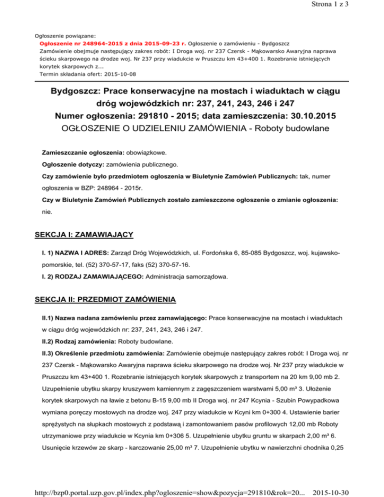 Strona 1 z 3 Ogłoszenie powiązane: Ogłoszenie nr 248964-2015 z dnia 2015-09-23 r. Ogłoszenie o zamówieniu - Bydgoszcz Zamówienie obejmuje następujący zakres robót: I Droga woj. nr 237 Czersk - Mąkowarsko Awaryjna naprawa ścieku skarpowego na drodze woj. Nr 237 przy wiadukcie w Pruszczu km 43+400 1. Rozebranie istniejących korytek skarpowych z... Termin składania ofert: 2015-10-08 Bydgoszcz: Prace konserwacyjne na mostach i wiaduktach w ciągu dróg wojewódzkich nr: 237, 241, 243, 246 i 247 Numer ogłoszenia: 291810 - 2015; data zamieszczenia: 30.10.2015 OGŁOSZENIE O UDZIELENIU ZAMÓWIENIA - Roboty budowlane Zamieszczanie ogłoszenia: obowiązkowe. Ogłoszenie dotyczy: zamówienia publicznego. Czy zamówienie było przedmiotem ogłoszenia w Biuletynie Zamówień Publicznych: tak, numer ogłoszenia w BZP: 248964 - 2015r. Czy w Biuletynie Zamówień Publicznych zostało zamieszczone ogłoszenie o zmianie ogłoszenia: nie. SEKCJA I: ZAMAWIAJĄCY I. 1) NAZWA I ADRES: Zarząd Dróg Wojewódzkich, ul. Fordońska 6, 85-085 Bydgoszcz, woj. kujawskopomorskie, tel. (52) 370-57-17, faks (52) 370-57-16. I. 2) RODZAJ ZAMAWIAJĄCEGO: Administracja samorządowa. SEKCJA II: PRZEDMIOT ZAMÓWIENIA II.1) Nazwa nadana zamówieniu przez zamawiającego: Prace konserwacyjne na mostach i wiaduktach w ciągu dróg wojewódzkich nr: 237, 241, 243, 246 i 247. II.2) Rodzaj zamówienia: Roboty budowlane. II.3) Określenie przedmiotu zamówienia: Zamówienie obejmuje następujący zakres robót: I Droga woj. nr 237 Czersk - Mąkowarsko Awaryjna naprawa ścieku skarpowego na drodze woj. Nr 237 przy wiadukcie w Pruszczu km 43+400 1. Rozebranie istniejących korytek skarpowych z transportem na 20 km 9,00 mb 2. Uzupełnienie ubytku skarpy kruszywem kamiennym z zagęszczeniem warstwami 5,00 m³ 3. Ułożenie korytek skarpowych na ławie z betonu B-15 9,00 mb II Droga woj. nr 247 Kcynia - Szubin Powypadkowa wymiana poręczy mostowych na drodze woj. 247 przy wiadukcie w Kcyni km 0+300 4. Ustawienie barier sprężystych na słupkach mostowych z podstawą i zamontowaniem pasów profilowych 12,00 mb Roboty utrzymaniowe przy wiadukcie w Kcynia km 0+306 5. Uzupełnienie ubytku gruntu w skarpach 2,00 m³ 6. Usunięcie krzewów ze skarp - karczowanie 25,00 m³ 7. Uzupełnienie ubytku w nawierzchni chodnika 0,25 http://bzp0.portal.uzp.gov.pl/index.php?ogloszenie=show&pozycja=291810&rok=20... 2015-10-30 Strona 2 z 3 m³ 8. Oczyszczenie przyczółków i zabezpieczenie antykorozyjne 30,00 m2 9. Porządkowanie przestrzeni pod mostowej 800,00 m2 III Droga woj. nr 246 Paterek - Dąbrowa Biskupia Roboty utrzymaniowe przy moście w Łabiszynie km 31+241 10. Usunąć mech i porosty z trylinki na stożkach i ze schodów 440,00 m2 11. Wykonanie zabezpieczenia antykorozyjnego balustrad przy schodach 3,00 m2 12. Zabezpieczenie antykorozyjne łożysk 16,00 szt. IV Droga woj. nr 243 Mrocza - Koronowo Roboty utrzymaniowe przy moście w Byszewie km 18+808 13. Usunięcie roślinności ze stożków 220,00 m2 14. Oczyszczenie z rdzy i zanieczyszczeń balustrad metalowych, zabezpieczenie farbą podkładową epoksydową do konstrukcji mostowych oraz malowanie farbą nawierzchniową do konstrukcji mostowych kolor biały, zielony RAL 6032 19,52 m2 15. Oczyszczenie i malowanie słupków żelbetowych farbą chlorokauczukową kolor biały, zielony RAL 6032 18,14 m2 16. Reprofilowanie ubytków betonu dźwigarów i przyczółków oraz gzymsów zaprawą naprawczą typu PCC 0,85 m³ 17. Uszczelnienie dylatacji gzymsowej 5,00 mb 18. Oczyszczenie koryta rzeki z gruzu i kamieni 50,00 m2 V Droga woj. nr 241 Tuchola - Rogoźno Roboty utrzymaniowe przy wiadukcie Więcbork km 41+890 19. Karczowanie krzewów ze skarp oraz pod obiektem 30,00 m2 20. Oczyszczenie z rdzy i zanieczyszczeń balustrad metalowych , zabezpieczenie farbą podkładową epoksydową do konstrukcji mostowych oraz malowanie farbą nawierzchniową do konstrukcji mostowych kolor biały, zielony RAL 6032 97,10 m2 21. Sprzątanie - porządkowanie przestrzeni pod mostowej 1.500,00 m2 Roboty utrzymaniowe przy moście w Nakle n/Notecią km 71+098 22. Usunięcie porostów ze stożków 420,00 m2 23. Zabezpieczenie antykorozyjne łożysk 16,00 szt. 24. Oczyszczenie gzymsów 50,00 m2 Zamawiający zaleca zainteresowanym Wykonawcom przed złożeniem oferty w niniejszym postępowaniu dokonanie wizji w terenie oraz porównanie z dokumentacją przetargową. Koszty dokonania wizji w terenie ponosi w całości Wykonawca. Każdy oferent ponosi pełną odpowiedzialność za treść uzyskanej informacji. Zamawiający dopuszcza rozwiązania równoważne w stosunku do opisywanych w SST. Wykonawca, który zaoferuje rozwiązania równoważne, musi wykazać, że oferowany przez niego przedmiot zamówienia jest równoważny czyli spełnia wymagania określone przez Zamawiającego w SST będącego częścią SIWZ. Zamawiający dokona oceny równoważności w stosunku do wymagań odnoszących się do przedmiotu zamówienia przekazanym Wykonawcom, a zawartym w opisie zamówienia. Wykonawca zobowiązany jest oznakować teren robót zgodnie z Rozporządzeniem Ministra Infrastruktury z dnia 3 lipca 2003r. w sprawie szczegółowych warunków technicznych dla znaków i sygnałów drogowych oraz urządzeń bezpieczeństwa ruchu drogowego i warunków umieszczania ich na drogach (Dz. U. z 2003r. nr 220 poz.2181) wg projektu organizacji ruchu na czas prowadzonych robót przekazanego przez Zamawiającego . Wykonawca zobowiązany jest prowadzić roboty w taki sposób by ograniczyć utrudnienia w ruchu do niezbędnego minimum oraz by nie wyrządzić szkód uczestnikom ruchu drogowego. Wszelkie szkody z tytułu likwidacji szkód wyrządzonych uczestnikom ruchu drogowego poniesie Wykonawca. II.4) Wspólny Słownik Zamówień (CPV): 45.22.11.11-3, 45.22.11.21-6. SEKCJA III: PROCEDURA http://bzp0.portal.uzp.gov.pl/index.php?ogloszenie=show&pozycja=291810&rok=20... 2015-10-30 Strona 3 z 3 III.1) TRYB UDZIELENIA ZAMÓWIENIA: Przetarg 