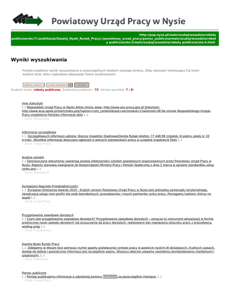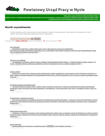 http://pup.nysa.pl/main/szukaj/wszedzie/roboty publiczne/sts:7/:/publikacje/Gazeta_Nyski_Rynek_Pracy/:/powiatowy_urzad_pracy/pomoc_publiczna/main/szukaj/wszedzie/robot y publiczne/sts:2/main/szukaj/wszedzie/roboty publiczne/sts:4.html Wyniki wyszukiwania Poniżej znajdziesz wyniki wyszukiwania w poszczególnych działach naszego serwisu. Żeby odszukać interesujące Cię treści wybierz dział, który najbardziej odpowiada Twoim oczekiwaniom. roboty publicz szukaj wszędzie ▼ Szukaj Szukane hasło: roboty publiczne. Znaleziono podstron: 72 (strona wyników: 7 / 8) 61 Inne statystyki (..) Wojewódzki Urząd Pracy w Opolu Adres strony www: http://www.psz.praca.gov.pl Statystyki: http://www.wup.opole.pl/start/index.php?option=com_content&task=section&id=11&Itemid=58 Na stronie Wojewódzkiego Urzędu Pracy znajdziecie Państwo informacje doty (..) Dział: Statystyka 62 Informacje szczegółowe (..) Szczegółowych informacji udziela: Starszy Inspektor (Kadrowa)Dorota Rybak telefon: 77 448 99 12pokój: III piętro, pokój nr 33 e-mail: Wszelkie informacje dotyczące ogłoszeń o wolnych stanowiskach pracy w urzędzie znajdziecie Pańs (..) Dział: Urząd Pracy 63 Analiza szkoleń (..) Zamieszczone dokumenty zawierają analizę efektywności szkoleń zawodowych organizowanych przez Powiatowy Urząd Pracy w Nysie. Raporty stanowią nawiązanie do Rozporządzeń Ministra Pracy i Polityki Społecznej z dnia 2 marca w sprawie standardów usług rynku pra (..) Dział: Statystyka 64 Europejska Nagroda Przedsiębiorczości (..) European Enterprise Awards 2010 - English version Powiatowy Urząd Pracy w Nysie jest jednostką samorządu terytorialnego, świadczącą usługi (non profit) dla osób bezrobotnych, pracodawców i innych partnerów rynku pracy. Pomagamy ludziom, którzy na współ (..) Dział: Urząd Pracy 65 Przygotowanie zawodowe dorosłych (..) Czym jest przygotowanie zawodowe dorosłych? Przygotowanie zawodowe dorosłych – oznacza to instrument aktywizacji w formie praktycznej nauki zawodu dorosłych lub przyuczenia do pracy dorosłych, realizowany bez nawiązania stosunku pracy z pracodawcą, według prog (..) Dział: Pracodawcy 66 Gazeta Nyski Rynek Pracy (..) Oddajemy w Wasze ręce pierwszy numer gazety poświęconej rynkowi pracy w powiecie nyskim.W dzisiejszych, trudnych czasach, dostęp do dobrej i pożytecznej informacji jest szczególnie ważny. Wszyscy obecnie ulegamy swoistemu bombardowaniu medialnymi i szeptanymi (..) Dział: Publikacje 67 Pomoc publiczna (..) Poniżej publikujemy informacje o udzielonej pomocy publicznej za poszczególne miesiące. (..) Dział: Urząd Pracy 68 Polityka prywatności (..) Powiatowy Urząd Pracy w Nysie przywiązuje szczególną wagę do poszanowania prywatności użytkowników odwiedzających portal http://www.pup.nysa.pl Gromadzone w dziennikach logów dane są wykorzystywane tylko i wyłącznie do celów administrowania serwisem. Ż (..) Dział: Ogólne 69 Zastrzeżenia prawne (..) Zasady użytkowania serwisu internetowego Powiatowego Urzędu Pracy w Nysie: Właściciel witryny Właścicielem niniejszej witryny internetowej, znajdującej się pod adresem http://www.pup.nysa.pl jest Powiatowy Urzędu Pracy w Nysie (PUP Nysa) z siedzibą ul. Słowi (..) Dział: Ogólne 70 Zamówienia publiczne (..) pobierane z BIP http://pup.nysa.ibip.pl/public/?id=53712 (..) Dział: Urząd Pracy ● ● ● ● ● ● ● ● ● « Pierwsza < Poprzednia 2 3 4 5 6 7 8