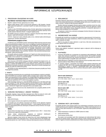 INFORMACJE UZUPEŁNIAJĄCE 1. PROCEDURA ZGŁOSZENIA NA KURS 4. REKLAMACJE Aby dokonać rezerwacji miejsca na kursie należy: Ewentualne reklamacje należy kierować w formie pisemnej na adres SJO GLOSSA najpóźniej w terminie 14 dni od daty zakończenia kursu. SJO GLOSSA zastrzega sobie prawo do opowiedzi na reklamacje w terminie 1 miesiąca od daty otrzymania reklamacji. 1. Wypełnić i podpisać formularz zgłoszeniowy oraz umowę. 2. Dokonać wpłaty depozytu (1200 zł lub dla kursów językowych w USA, Kanadzie i Australii, 1000 zł dla kursów językowych w pozostałych krajach) oraz opłaty administracyjnej w wysokości 195 zł. 3. Przesłać na adres SJO GLOSSA podpisaną umowę, formularz zgłoszeniowy oraz kopię dowodu wpłaty depozytu i opłaty administracyjnej. W celu przyspieszenia procedury rejestracji można przesłać powyższe dokumenty faksem, a następnie oryginały pocztą. 4. Wszelkie reklamacje wymagające interwencji podczas pobytu uczestnika na kursie (np. nieodpowiedni poziom zaawansowania, standard zakwaterowania itp.) powinny być zgłaszane w trakcie kursu w szkole w której odbywa się kurs. W przypadku problemów z rozwiązaniem zgłoszonych reklamacji należy kontaktować się ze SJO GLOSSA. Nie zgłoszone w trakcie kursu zastrzeżenia wymagające doraźnej interwencji nie będą rozpatrywane po zakończeniu kursu. SJO GLOSSA rozpoczyna procedurę rejestracji w momencie otrzymania kopii dowodu wpłaty depozytu i opłaty administracyjnej na konto SJO GLOSSA 5. NIEOBECNOŚĆ NA KURSIE U W A G A : Depozyt jest częścią całkowitej opłaty za kurs, natomiast opłata administracyjna związana jest z kosztami rejestracyjnymi. W przypadku gdy uczestnik kursu nie pojawi się na zajęciach w ciągu pierwszych 4 dni trwania kursu jego rezerwacja może zostać unieważniona, a Klient nie otrzyma zwrotu opłaty za kurs lub jego część (w zależności od szkoły). Potwierdzenie przyjęcia na kurs. Klient nie ma prawa do zwrotu należności za część kursu, która była zarezerwowana lecz w której zajęciach Klient nie uczestniczył. Po dokonaniu przez SJO GLOSSA czynności rezerwacyjnych Klient otrzymuje pocztą lub pocztą elektroniczną potwierdzenie przyjęcia na kurs wraz ze szczegółowym kosztorysem obejmującym całkowite koszty uczestnictwa w kursie i zamawianych usług dodatkowych (np. bilety lotnicze, ubezpieczenie itp.). Wpłatę należności przedstawionej w kosztorysie należy dokonać w terminie najpóźniej 5 tygodni przed datą rozpoczęcia kursu. W przypadku przekroczenia terminu płatności SJO GLOSSA zastrzega sobie prawo do naliczenia dodatkowej opłaty administracyjnej w wysokości 100zł lub do skreślenia Klienta z listy uczestników. Skreślenie z listy uczestników powoduje przepadek depozytu i opłaty administracyjnej. 6. DNI ŚWIĄTECZNE Podczas świąt religijnych, narodowych i regionalnych zajęcia w większości szkół nie odbywają się i nie są odrabiane. 7. PŁATNOŚCI W przypadku zgłoszeń w terminie późniejszym niż 5 tygodni przez datą rozpoczęcia kursu należy skontaktować się z SJO GLOSSA a następnie dokonać na podstawie otrzymanego kosztorysu pełnej wpłaty za kurs przelewem na konto SJO GLOSSA. 1. Pracownicy SJO GLOSSA nie są upoważnieni do przyjmowania wpłat gotówkowych. Wszelkie wpłaty należy dokonywać bezpośrednio na nasze konta bankowe. Na wszystkich dowodach wpłat muszą być umieszczone imię, nazwisko uczestnika kursu, symbol kursu oraz numer formularza zgłoszeniowego (w przypadku zapisu przez internet). 2. Wpłaty dokonywane w złotówkach muszą być przeliczane po kursie sprzedaży waluty (w dniu dokonywania płatności) Banku Millenium (www.millenet.pl). 3. Po uprzednim ustaleniu z pracownikiem SJO GLOSSA istnieje możliwość dokonywania opłat w walutach EUR, GBP i USD. W takim przypadku należy dokonać płatności depozytu i opłaty administracyjnej w walucie w wysokości: 53EUR/35GBP/70USD opłata administracyjna, 270EUR/180GBP/420USD depozyt. Nie ma możliwości dokonywania wpłat w walutach CHF, AUD oraz CAD Dokumenty uczestnictwa w kursie. Klient otrzymuje od SJO GLOSSA następujące dokumenty: potwierdzenie przyjęcia na kurs, adres zakwaterowania, polisę ubezpieczeniową (o ile została zamówiona). Dokumenty te mogą być odebrane w siedzibie SJO GLOSSA lub też przesłane klientowi pocztą poleconą lub kurierską (na koszt klienta) po uprzednim przesłaniem kopii przelewów. Dokumenty te uczestnik zobowiązany jest posiadać przy sobie przy przekraczaniu granicy. SJO GLOSSA nie ponosi odpowiedzialności za nieterminowe doręczenie przesyłek przez Pocztę Polską bądź firmy kurierskie. ________________________________________________ 2. RABATY Każda osoba która przynajmniej dwa razy uczestniczyła w kursie językowym za granicą za pośrednictwem SJO GLOSSA oraz po powrocie wypełniła ankietę oceniającą wyjazd uzyskuje status Stałego Klienta i jest upoważniona do zniżki w wysokości 5% na każdy kolejny kurs językowy za granicą i do 15% zniżki na kursy językowe organizowane przez SJO GLOSSA w Polsce. Osoba polecana przez Stałego Klienta jest upoważniona do 2% zniżki na kursy językowe za granicą. Konto do wpłat złotówkowych: Volkswagen Bank Polska S. A. 20 2130 0004 2001 0167 3649 0002 Osoby korzystające pierwszy raz z usług SJO GLOSSA zapisując się w 2 lub więcej osób mają prawo do uzyskania 2% zniżki. Warunkiem uzyskania zniżki jest podanie imienia i nazwiska osoby wraz z którą dokonywany jest zapis na formularzu zgłoszeniowym oraz dokonanie pełnej płatności za kurs w terminie do 5 tygodni przed rozpoczęciem kursu przez obydwie osoby. Konto do wpłat w EUR: Zniżki są naliczane od kosztu kursu (bez zakwaterowania) lub w przypadku pakietów od 50% wartości pakietu. Konto do wpłat w GBP: Bank Millenium S.A. 89 1160 2202 0000 0000 7140 8274 Bank Millenium S.A. 48 1160 2202 0000 0000 7140 8236 3. WARUNKI REZYGNACJI I ZMIANY TERMINU W przy