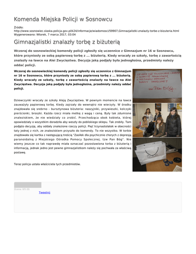 Komenda Miejska Policji w Sosnowcu Źródło: http://www.sosnowiec.slaska.policja.gov.pl/k24/informacje/wiadomosci/59907,Gimnazjalistki-znalazly-torbe-z-bizuteria.html Wygenerowano: Wtorek, 7 marca 2017, 03:04 Gimnazjalistki znalazły torbę z biżuterią Wczoraj do sosnowieckiej komendy policji zgłosiły się uczennice z Gimnazjum nr 16 w Sosnowcu, które przyniosły ze sobą papierową torbę z ... biżuterią. Kiedy wracały ze szkoły, torbę z zawartością znalazły na ławce na Alei Zwycięstwa. Decyzja jaką podjęły była jednogłośna, przedmioty należy oddać policji. Wczoraj do sosnowieckiej komendy policji zgłosiły się uczennice z Gimnazjum nr 16 w Sosnowcu, które przyniosły ze sobą papierową torbę z ... biżuterią. Kiedy wracały ze szkoły, torbę z zawartością znalazły na ławce na Alei Zwycięstwa. Decyzja jaką podjęły była jednogłośna, przedmioty należy oddać policji. Dziewczynki wracały ze szkoły Aleją Zwycięstwa. W pewnym momencie na ławce zauważyły papierową torbę. Kiedy zajrzały do wewnątrz nie wierzyły. W środku znajdowała się srebrno - bursztynowa biżuteria: naszyjniki, przywieszki, kolczyki pierścionki, broszki. Każda rzecz miała metkę z wagą i ceną. Były tak zdumione znaleziskiem, że nie wiedziały co zrobić. Przechodząca obok kobieta, której opowiedziały o wszystkim doradziła aby weszły do pobliskiego sklepu. Tak zrobiły. Tam podjęto decyzję, aby oddały znalezione rzeczy policji. Pięć trzynastolatek w obecności taty jednej z nich, ze znaleziskiem przyszło do komendy. To nie wszystko. W torbie znajdowała się kartka z następującą treścią "Zasiłek dla psychicznie chorych z depresją paranoidalną z Miejskiego Ośrodka Pomocy Społecznej. tzw Pan Bóg". Nie wiemy jeszcze co tak naprawdę miała oznaczać pozostawiona torba z biżuterią i informacją, jednak jedno jest pewne gimnazjalistkom należy się pochwała za właściwą postawę. Teraz policja ustala właściciela tych przedmiotów. Ocena: 0/5 (0) Tweetnij