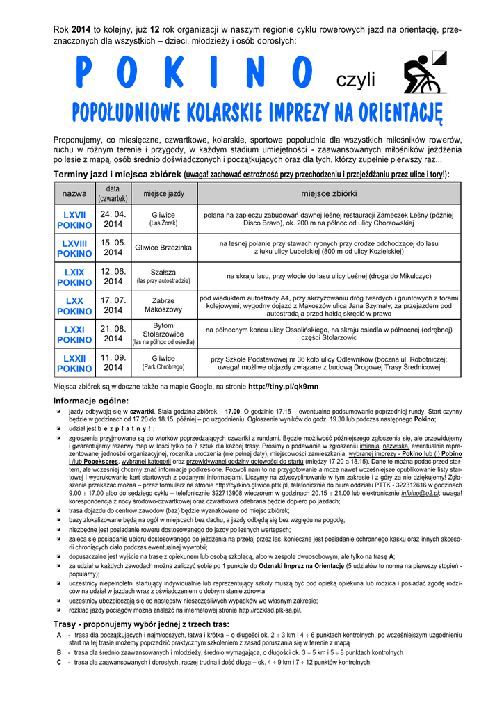 Rok 2014 to kolejny, już 12 rok organizacji w naszym regionie cyklu rowerowych jazd na orientację, przeznaczonych dla wszystkich – dzieci, młodzieży i osób dorosłych: P O K I N O czyli POPOŁUDNIOWE KOLARSKIE IMPREZY NA ORIENTACJĘ Proponujemy, co miesięczne, czwartkowe, kolarskie, sportowe popołudnia dla wszystkich miłośników rowerów, ruchu w różnym terenie i przygody, w każdym stadium umiejętności - zaawansowanych miłośników jeżdżenia po lesie z mapą, osób średnio doświadczonych i początkujących oraz dla tych, którzy zupełnie pierwszy raz... Terminy jazd i miejsca zbiórek (uwaga! zachować ostrożność przy przechodzeniu i przejeżdżaniu przez ulice i tory!): nazwa data (czwartek) 24. 04. LXVII POKINO 2014 miejsce jazdy miejsce zbiórki Gliwice polana na zapleczu zabudowań dawnej leśnej restauracji Zameczek Leśny (później Disco Bravo), ok. 200 m na północ od ulicy Chorzowskiej (Las Żorek) 15. 05. LXVIII Gliwice Brzezinka POKINO 2014 na leśnej polanie przy stawach rybnych przy drodze odchodzącej do lasu z łuku ulicy Lubelskiej (800 m od ulicy Kozielskiej) 12. 06. LXIX POKINO 2014 (las przy autostradzie) 17. 07. LXX POKINO 2014 Zabrze Makoszowy pod wiaduktem autostrady A4, przy skrzyżowaniu dróg twardych i gruntowych z torami kolejowymi; wygodny dojazd z Makoszów ulicą Jana Szymały; za przejazdem pod autostradą a przed hałdą skręcić w prawo 21. 08. LXXI POKINO 2014 Bytom Stolarzowice (las na północ od osiedla) na północnym końcu ulicy Ossolińskiego, na skraju osiedla w północnej (odrębnej) części Stolarzowic 11. 09. LXXII POKINO 2014 (Park Chrobrego) Szałsza Gliwice na skraju lasu, przy wlocie do lasu ulicy Leśnej (droga do Mikulczyc) przy Szkole Podstawowej nr 36 koło ulicy Odlewników (boczna ul. Robotniczej; uwaga! możliwe objazdy związane z budową Drogowej Trasy Średnicowej Miejsca zbiórek są widoczne także na mapie Google, na stronie http://tiny.pl/qk9mn Informacje ogólne: ◪ ◪ ◪ ◪ ◪ ◪ ◪ ◪ ◪ ◪ ◪ ◪ jazdy odbywają się w czwartki. Stała godzina zbiórek – 17.00. O godzinie 17.15 – ewentualne podsumowanie poprzedniej rundy. Start czynny będzie w godzinach od 17.20 do 18.15, później – po uzgodnieniu. Ogłoszenie wyników do godz. 19.30 lub podczas następnego Pokino; udział jest b e z p ł a t n y ! ; zgłoszenia przyjmowane są do wtorków poprzedzających czwartki z rundami. Będzie możliwość późniejszego zgłoszenia się, ale przewidujemy i gwarantujemy rezerwy map w ilości tylko po 7 sztuk dla każdej trasy. Prosimy o podawanie w zgłoszeniu imienia, nazwiska, ewentualnie reprezentowanej jednostki organizacyjnej, rocznika urodzenia (nie pełnej daty), miejscowości zamieszkania, wybranej imprezy - Pokino lub (i) Pobino i /lub Popekspres, wybranej kategorii oraz przewidywanej godziny gotowości do startu (między 17.20 a 18.15). Dane te można podać przed startem, ale wcześniej chcemy znać informacje podkreślone. Pozwoli nam to na przygotowanie a może nawet wcześniejsze opublikowanie listy startowej i wydrukowanie kart startowych z podanymi informacjami. Liczymy na zdyscyplinowanie w tym zakresie i z góry za nie dziękujemy! Zgłoszenia przekazać można – przez formularz na stronie http://cyrkino.gliwice.pttk.pl, telefonicznie do biura oddziału PTTK - 322312616 w godzinach 9.00 17.00 albo do sędziego cyklu – telefonicznie 322713908 wieczorem w godzinach 20.15 21.00 lub elektronicznie [email protected]; uwaga! korespondencja z nocy środowo-czwartkowej oraz czwartkowa odebrana będzie dopiero po jazdach; trasa dojazdu do centrów zawodów (baz) będzie wyznakowane od miejsc zbiórek; bazy zlokalizowane będą na ogół w miejscach bez dachu, a jazdy odbędą się bez względu na pogodę; niezbędne jest posiadanie roweru dostosowanego do jazdy po leśnych wertepach; zaleca się posiadanie ubioru dostosowanego do jeżdżenia na przełaj przez las, konieczne jest posiadanie ochronnego kasku oraz innych akcesorii chroniących ciało podczas ewentualnej wywrotki; dopuszczalne jest wyjście na trasę z opiekunem lub osobą szkolącą, albo w zespole dwuosobowym, ale tylko na trasę A; za udział w każdych zawodach można zaliczyć sobie po 1 punkcie do Odznaki Imprez na Orientację (5 udziałów to norma na pierwszy stopień popularny); uczestnicy niepełnoletni startujący indywidualnie lub reprezentujący szkoły muszą być pod opieką opiekuna lub rodzica i posiadać zgodę rodziców na udział w jazdach wraz z oświadczeniem o dobrym stanie zdrowia; uczestnicy ubezpieczają się od następstw nieszczęśliwych wypadków we własnym zakresie; rozkład jazdy pociągów można znaleźć na internetowej stronie http://rozklad.plk-sa.pl/. Trasy - proponujemy wybór jednej z trzech tras: - trasa dla początkujących i najmłodszych, łatwa i krótka – o długości ok. 2 3 km i 4 6 punktach kontrolnych, po wcześniejszym uzgodnieniu start na tej trasie możemy poprzedzić praktycznym szkoleniem z zasad poruszania się w terenie z mapą B - trasa dla średnio zaawansowanych i młodzieży, średnio wymagająca, o długości ok. 3 5 km i 5 8 punktach kontrolnych C - trasa dla zaawansowanych i dorosłych, raczej trudna i dość długa – ok. 4 9 km i 7 12 punktów kontrolnych. A Zasady rozgrywania jazd na orientację: zawodnicy startują indywidualnie w odstępach 2-3 minutowych; na starcie otrzymują kartę startową i mapę terenu, na której kółkami są zaznaczone punkty kontrolne znajdujące się w terenie. Punkty te na mapie są ponumerowane według obowiązkowej kolejności odszukiwania i potwierdzania. Sędzia każdego z Pokino może przed startem ogłosić inną regułę kolejności odszukiwania punktów. W terenie punkt kontrolny oznakowany jest biało czerwonym lampionem, przy którym umieszczony jest perforator (dziurkacz) lub kredka. Przy pomocy perforatora (dziurkowanie karty startowej) lub kredki (przepisanie kodu z lampionu do karty startowej) 