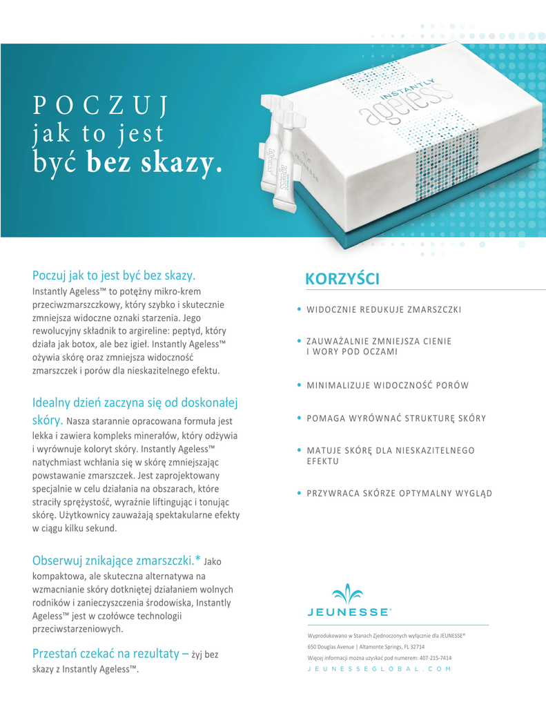 POCZUJ jak to jest być bez skazy. Poczuj jak to jest być bez skazy. Instantly Ageless™ to potężny mikro-krem przeciwzmarszczkowy, który szybko i skutecznie zmniejsza widoczne oznaki starzenia. Jego rewolucyjny składnik to argireline: peptyd, który działa jak botox, ale bez igieł. Instantly Ageless™ ożywia skórę oraz zmniejsza widoczność zmarszczek i porów dla nieskazitelnego efektu. KORZYŚCI WIDOCZNIE REDUKUJE ZMARSZCZKI ZAUWAŻALNIE ZMNIEJSZA CIENIE I WORY POD OCZAMI MINIMALIZUJE WIDOCZNOŚĆ PORÓW Idealny dzień zaczyna się od doskonałej skóry. Nasza starannie opracowana formuła jest lekka i zawiera kompleks minerałów, który odżywia i wyrównuje koloryt skóry. Instantly Ageless™ natychmiast wchłania się w skórę zmniejszając powstawanie zmarszczek. Jest zaprojektowany specjalnie w celu działania na obszarach, które straciły sprężystość, wyraźnie liftingując i tonując skórę. Użytkownicy zauważają spektakularne efekty w ciągu kilku sekund. POMAGA WYRÓWNAĆ STRUKTURĘ SKÓRY MATUJE SKÓRĘ DLA NIESKAZITELNEGO EFEKTU PRZYWRACA SKÓRZE OPTYMALNY WYGLĄD Obserwuj znikające zmarszczki.* Jako kompaktowa, ale skuteczna alternatywa na wzmacnianie skóry dotkniętej działaniem wolnych rodników i zanieczyszczenia środowiska, Instantly Ageless™ jest w czołówce technologii przeciwstarzeniowych. Przestań czekać na rezultaty – żyj bez skazy z Instantly Ageless™. Wyprodukowano w Stanach Zjednoczonych wyłącznie dla JEUNESSE® 650 Douglas Avenue | Altamonte Springs, FL 32714 Więcej informacji można uzyskać pod numerem: 407-215-7414 J E U N E S S E G L O B A L . C O M CECHY LEKKA, BEZOLEJOWA FORMUŁA ZAWIERA REWOLUCYJNY PEPTYD – ARGIRELINE RYGORYSTYCZNIE OPRACOWANY KOMPLEKS MOŻE BYĆ STOSOWANY Z MAKIJAŻEM LUB BEZ BĄDŹ SOBĄ. BĄDŹ BEZ SKAZY. Instantly Ageless™ działa synergicznie z linią produktów LUMINESCE™ żeby wyraźnie zmniejszyć oznaki starzenia. Opracowany wyłącznie przez Jeunesse®. AKTYWNE SKŁADNIKI STOSOWANIE Delikatnie wklepać bardzo cienką warstwę na wybranych obszarach; pozostawić na skórze, ograniczając mimikę twarzy, przez 2-3 minuty do wyschnięcia produktu żeby osiągnąć spektakularny efekt. Jedna fiolka zazwyczaj wystarcza na 2-3 dni w zależności od indywidualnego stosowania. Używać zgodnie z zaleceniami i unikać kontaktu z oczami. Jeżeli produkt dostanie się do oczu, należy przemyć je wodą. Przerwać stosowanie w przypadku wystąpienia zaczerwienienia lub podrażnienia. W przypadku alergii na kosmetyki należy skonsultować się z lekarzem. * Rezultaty nie są trwałe ARGIRELINE to składnik powszechnie znany z osiągania znaczących wyników w przeciwdziałaniu starzeniu. Jest to peptyd, który działa jak botox przy wygładzaniu zmarszczek. Chociaż Argireline jest jednym z najpowszechniej znanych zabiegów przeciwstarzeniowych, nie wszystkie formuły mogą działać, ponieważ konieczna jest precyzyjna kompozycja Argireline do uzyskania maksymalnych rezultatów. Opracowanie odpowiedniej formuły to doskonała umiejętność. KRZEMIANY SODU I MAGNEZU są ekskluzywną mieszanką dwóch różnych krzemianów, które w połączeniu wspierają ściągający efekt na skórze. Te krzemiany tak obkurczają skórę, że pory wydają się mniejsze, a zmarszczki wyglądają na wygładzone.