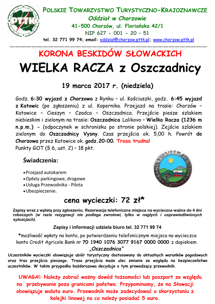 POLSKIE TOWARZYSTWO TURYSTYCZNO-KRAJOZNAWCZE Oddział w Chorzowie 41-500 Chorzów, ul. Floriańska 42/1 NIP 627 - 001 - 20 – 51 tel. 32 771 99 74; email: [email protected]; www.chorzow.pttk.pl KORONA BESKIDÓW SŁOWACKICH WIELKA RACZA z Oszczadnicy 19 marca 2017 r. (niedziela) Godz. 6:30 wyjazd z Chorzowa z Rynku – ul. Kościuszki, godz. 6:45 wyjazd z Katowic (po zgłoszeniu) z ul. Kopernika. Przejazd na trasie: Chorzów – Katowice – Cieszyn – Czadca – Oszczadnica. Przejście piesze szlakiem niebieskim i zielonym na trasie: Oszczadnica Lalikovo – Wielka Racza (1236 m n.p.m.) - (odpoczynek w schronisku po stronie polskiej). Zejście szlakiem zielonym do Oszczadnicy Vysny. Czas przejścia ok. 5,00 h. Powrót do Chorzowa przez Katowice ok. godz.20:00. Trasa trudna! Punkty GOT (§ 6, ust. 2) – 18 pkt. Świadczenia: Przejazd autokarem Opłaty parkingowe, drogowe Usługa Przewodnika - Pilota Ubezpieczenie. cena wycieczki: 72 zł* Zapisy wraz z wpłatą przy zgłoszeniu. Rezerwacja telefoniczna miejsca na wycieczce ważna do 4 dni roboczych (w razie rezygnacji nie podlega zwrotowi, tylko w nagłych i usprawiedliwionych sytuacjach). Zapisy i informacji udziela biuro tel. 32 771 99 74 *możliwość wpłaty na konto, po potwierdzeniu telefonicznym miejsca na wycieczce konto Credit Agricole Bank nr 70 1940 1076 3077 9167 0000 0000 z dopiskiem „Oszczadnica” Uczestników wycieczki obowiązuje ubiór turystyczny dostosowany do aktualnych warunków pogodowych oraz tras przejścia pieszego. Trasa przejścia może ulec zmianie ze względu na bezpieczeństwo uczestników. W takim przypadku każdorazowo decyduje o tym prowadzący przewodnik. UWAGA!: Należy zabrać ważny dowód tożsamości lub paszport ze względu na przebywanie poza granicami państwa. Przypominamy, że na Słowacji obowiązuje waluta euro. Przewodnik może zadecydować o skorzystaniu z kolejki linowej na co należy posiadać 5 euro.