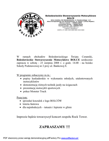 Bolesławieckie Stowarzyszenie Motocyklowe BOLCE Adres siedziby: 59-700 Bolesławiec, ul. Cieszkowskiego 1/4 Adres korespondencji: 59-700 Bolesławiec, ul. Kubika 1 (Firma Majster) Mariusz Leśniak – +48505110990 Przemysław Mrozik - +48606728140 Szymon Łuczak – tel. +48698414041 BANK ZACHODNI WBK S.A. 1 Oddział w Bolesławcu KONTO: 67 1090 1939 0000 0001 0544 8665 W ramach obchodów Bolesławieckiego Święta Ceramiki, Bolesławieckie Stowarzyszenie Motocyklowe BOLCE serdecznie zaprasza w sobotę - 23 sierpnia 2008 r. o godz. 14.00 - na boisko Szkoły Podstawowej nr 2 przy ul. Bankowej 8. W programie zobaczymy m.in.: • popisy kaskaderskie w wykonaniu młodych, utalentowanych motocyklistów • demonstrację różnych technik jazdy na ścigaczach • prezentację motocykli sportowych • pokaz Monster Truck Poza tym: • sprzedaż koszulek z logo BOLCÓW • loteria fantowa • dla najmłodszych – tatuaże i lepienie w glinie Imprezie będzie towarzyszył koncert zespołu Rock Tower. ZAPRASZAMY !!! PDF stworzony przez wersję demonstracyjną pdfFactory Pro www.pdffactory.pl/