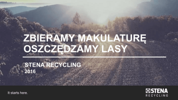 ZBIERAMY MAKULATURĘ OSZCZĘDZAMY LASY STENA RECYCLING 2016 It starts here. SPIS TREŚCI • O KONKURSIE • ZASADY ZGŁOSZEŃ • ZASADY PRZYZNAWANIA NAGRÓD • ZASADY ODBIORÓW MAKULATURY • LOKALNI KOORDYNATORZY – KONTAKT • LINKI DO ZAŁĄCZNIKÓW • O STENA RECYCLING It starts here. O KONKURSIE Stena Recycling od kilku lat prowadzi konkurs dla szkół i przedszkoli pod hasłem "Zbieramy makulaturę – oszczędzamy lasy”. Jego głównym celem jest promowanie dbałości o środowisko poprzez oddawanie surowców nadających się do recyklingu oraz współpraca w zakresie edukacji ekologicznej uczniów. Konkurs polega na zbiórce makulatury w szkołach i przedszkolach. Uczestnicy, których zadaniem jest zebranie jak największej ilości materiału do przetworzenia, jednocześnie dowiadują się, na czym polega recykling i jak ważny jest dla ochrony środowiska i naturalnych zasobów Ziemi. Każdego roku szkoły oraz przedszkola uczestniczące w konkursie zbierają łącznie ponad 2500 ton makulatury, a tym samym przed wycięciem możemy ocalić nawet 43 000 drzew! It starts here. ZASADY ZGŁOSZEŃ Do konkursu mogą zgłaszać się szkoły z terenu Gdyni i Gdańska. Konkurs trwa od 1 września 2016r. do 15 czerwca 2017r. Data zakończenia odbioru surowców z placówek do 15 maja 2017. Aby zgłosić placówkę należy wypełnić formularz zgłoszeniowy dostępny na naszej stronie internetowej www.stenarecycling.pl PAMIĘTAJ! Formularz należy wypełnić dokładnie i czytelnie, drukowanymi literami. Zgłoszenia należy przesłać do dnia 30 września 2016 roku, na adres mailowy lokalnego koordynatora (patrz: kontakt), a oryginał należy przesłać pocztą na adres oddziału (patrz: kontakt). W zgłoszeniu prosimy podać numer konta bankowego, na które Stena będzie przelewać wynagrodzenie za zebraną makulaturę. It starts here. ZASADY PRZYZNAWANIA NAGRÓD Konkurs prowadzony jest w trzech kategoriach: I KATEGORIA: II KATEGORIA: NAJLEPSZA PLACÓWKA OŚWIATOWA NAJLEPSZY UCZEŃ / NAJLEPSZYPRZEDSZKOLAK Nagrodzone zostaną 3 najlepsze placówki oświatowe, które w Konkurs wyłoni 3 uczniów i 3 przedszkolaków - którzy zebrali przeliczeniu na jednego ucznia bądź przedszkolaka zebrały największą ilość makulatury Do przeliczeń będą wykorzystane największą ilość makulatury. Do przeliczeń wskaźnika w I dane z Załącznika nr 3, który należy przesłać do 30 maja 2017. kategorii wykorzystane będą dane z formularza I miejsce - jedna nagroda o wartości 300 zł zgłoszeniowego . (w tym nagroda rzeczowa o wartości 270 zł i nagroda pieniężna o wartości 30 zł ) I miejsce- nagroda rzeczowa o wartości 700 zł II miejsce - jedna nagroda o wartości 200 zł II miejsce- nagroda rzeczowa o wartości 500 zł (w tym nagroda rzeczowa o wartości 180 zł III miejsce- nagroda rzeczowa o wartości 300 zł i nagroda pieniężna o wartości 20 zł ) III miejsce – jedna nagroda o wartości 100 zł (w tym nagroda rzeczowa o wartości 90 zł i nagroda pieniężna o wartości 10 zł ) Na dzień pobrania nagrody, jej przekazanie będzie podlegało opodatkowaniu podatkiem dochodowym. Od nagrody zostanie pobrany zryczałtowany podatek dochodowy w wysokości 10%. W końcowej klasyfikacji będą brane pod uwagę tylko placówki, które terminowo dostarczą czytelnie wypełnione dokumenty. It starts here. ZASADY ODBIORÓW Stena Recycling zapewnia każdej biorącej udział w konkursie placówce odbiór makulatury w ustalonym terminie. Zapewniamy bezpłatny transport z każdej placówki biorącej udział w konkursie przez cały czas jego trwania oraz płatny odbiór wg. ustalonych lokalnie stawek (100 zł za tonę makulatury) tzn. Stena Recycling płaci placówkom za odebrany materiał. Aby usprawnić odbiór warto przy zgłoszeniu podać warunki odbioru z danej placówki np. brak pomocy, brak windy, długi i wąski korytarz. Stena zastrzega sobie prawo do ustalenia terminu odbioru makulatury z tygodniowym wyprzedzeniem. Placówki we własnym zakresie przygotowują organizację załadunku. W naszych zakładach Stena nie przyjmujemy indywidualnych odbiorów w ramach konkursu. Za prowadzenie ewidencji zbiórki oraz zabezpieczenie miejsca zbiórki odpowiadają opiekunowie zbiórki na terenie danej placówki. It starts here. LOKALNI KOORDYNATORZY KONTAKT Dla regionu północnego Oddziałem koordynującym konkurs „Zbieramy Makulaturę Oszczędzamy Lasy” jest Oddział w Gdyni Stena Recycling – Gdynia ul. Chwaszczyńska 129-149 81-571 Gdynia Lokalny Koordynator: Anna Domska Tel.:+48 58 667 01 01 wew. 26 Fax: +48 58 667 20 01 [email protected] www.stenarecycling.pl It starts here. LINKI DO ZAŁĄCZNIKÓW Regulamin Konkursu i Zgłoszenie do Konkursu It starts here. O STENA RECYCLING Stena Recycling jest liderem kompleksowych rozwiązań w dziedzinie zarządzania odpadami, recyklingu oraz usług środowiskowych na rynku polskim i skandynawskim. Odzyskujemy i przetwarzamy wszystkie rodzaje odpadów w ramach trzech Obszarów Biznesowych: Metale Żelazne i Nieżelazne, Papier i Plastik oraz Odpady Niebezpieczne i Inne. Naszym celem jest podniesienie poziomu recyklingu oraz ograniczenie ilości odpadów zmieszanych. W 12 lokalizacjach w Polsce, każdego roku przetwarzamy 700 tysięcy ton odpadów pochodzących z działalności biznesowej i przemysłowej, uzyskując z nich nowe surowce. Przez ponad 75 lat działania na rynkach międzynarodowych kierujemy się filozofią CARE – dbałości o Klientów, Pracowników, Biznes, Środowisko i Społeczeństwo. Nasi Pracownicy i Klienci każdego dnia odkrywają wartość efektywnej gospodarki odpadami. It starts here. O STENA RECYCLING Stena Recycling jako ekspert w dziedzinie ochrony środowiska i gospodarki odpadami, firma poważnie traktuje swoją rolę w edukacji ekologicznej, mającej na celu realizację wizji polegającej na zmianie sposobu pracy i życia Polaków poprzez innowacyjne rozwiązania w zakresie recyklingu. W 2012 roku Stena Recycling