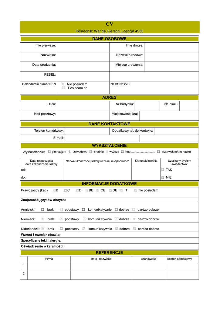 CV Pośrednik: Wanda Gierach Licencja 4933 DANE OSOBOWE Imię pierwsze: Imię drugie: Nazwisko: Nazwisko rodowe: Data urodzenia: Miejsce urodzenia: PESEL: Nie posiadam Posiadam nr Holenderski numer BSN Nr BSN/SoFi: ADRES Ulica: Nr budynku: Kod pocztowy: Nr lokalu: Miejscowość, kraj: DANE KONTAKTOWE Telefon komórkowy: Dodatkowy tel. do kontaktu: E-mail: WYKSZTAŁCENIE gimnazjum Wykształcenie: Data rozpoczęcia data zakończenia szkoły zawodowe średnie wy sze inne Nazwa ukończonej szkoły/uczelni, miejscowość: przerwałem/am naukę Kierunek/zawód: Uzyskany dyplom świadectwo: od: TAK do: NIE INFORMACJE DODATKOWE Prawo jazdy kat : D D T nie posiadam Znajomość języków obcych: ngielski: brak podstawy komunikatywnie do rze ardzo do rze Niemiecki: rak podstawy komunikatywnie do rze ardzo do rze Niderlandzki: rak podstawy komunikatywnie do rze ardzo do rze Wzrost i rozmiar obuwia: Specyficzne leki i alergie: Oświadczenie o karalności: REFERENCJE Firma 1 2 Imię i nazwisko Stanowisko Telefon kontaktowy PRZEBIEG ZATRUDNIENIA /WYJAŚNIENIE PRZERW W ZATRUDNIENIU Nazwa Pracodawcy/ Zleceniodawcy Miejsce pracy /kraj zatrudnienia Okres zatrudnienia (dzień, m-c, rok) Stanowisko Rodzaj wykonywanych czynności od: do: od: do: od: do: od: do: od: do: od: do: od: do: od: do: od: do: od: do: UPRAWNIENIA WÓZ K WIDŁOWY UPRAWNIENIA Inne uprawnienia: T K NI WÓZ K WIDŁOWY DOŚWI D Z NI T K NI Oświadczam , że umieszczone przeze mnie dane są zgodne z prawdą. Wyrażam zgodę na przetwarzanie moich danych osobowych zawartych w mojej ofercie pracy dla potrzeb niezbędnych do realizacji rekrutacji zgodnie z ustawą z dnia 29 sierpnia 1997 o ochronie danych osobowych (Dz.U. Z 2002r. Nr 101 poz.926 ze zm.) Data ….............................. Podpis …..........................................................