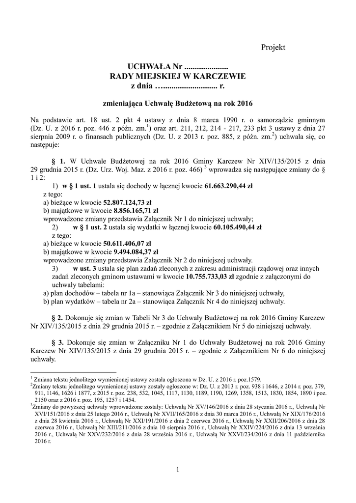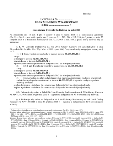 Projekt UCHWAŁA Nr ..................... RADY MIEJSKIEJ W KARCZEWIE z dnia ….......................... r. zmieniająca Uchwałę Budżetową na rok 2016 Na podstawie art. 18 ust. 2 pkt 4 ustawy z dnia 8 marca 1990 r. o samorządzie gminnym (Dz. U. z 2016 r. poz. 446 z późn. zm.1) oraz art. 211, 212, 214 - 217, 233 pkt 3 ustawy z dnia 27 sierpnia 2009 r. o finansach publicznych (Dz. U. z 2013 r. poz. 885, z późn. zm.2) uchwala się, co następuje: § 1. W Uchwale Budżetowej na rok 2016 Gminy Karczew Nr XIV/135/2015 z dnia 29 grudnia 2015 r. (Dz. Urz. Woj. Maz. z 2016 r. poz. 466).3 wprowadza się następujące zmiany do § 1 i 2: 1) w § 1 ust. 1 ustala się dochody w łącznej kwocie 61.663.290,44 zł z tego: a) bieżące w kwocie 52.807.124,73 zł b) majątkowe w kwocie 8.856.165,71 zł wprowadzone zmiany przedstawia Załącznik Nr 1 do niniejszej uchwały; 2) w § 1 ust. 2 ustala się wydatki w łącznej kwocie 60.105.490,44 zł z tego: a) bieżące w kwocie 50.611.406,07 zł b) majątkowe w kwocie 9.494.084,37 zł wprowadzone zmiany przedstawia Załącznik Nr 2 do niniejszej uchwały. 3) w ust. 3 ustala się plan zadań zleconych z zakresu administracji rządowej oraz innych zadań zleconych gminom ustawami w kwocie 10.755.733,03 zł zgodnie z załączonymi do uchwały tabelami: a) plan dochodów – tabela nr 1a – stanowiąca Załącznik Nr 3 do niniejszej uchwały, b) plan wydatków – tabela nr 2a – stanowiąca Załącznik Nr 4 do niniejszej uchwały. § 2. Dokonuje się zmian w Tabeli Nr 3 do Uchwały Budżetowej na rok 2016 Gminy Karczew Nr XIV/135/2015 z dnia 29 grudnia 2015 r. – zgodnie z Załącznikiem Nr 5 do niniejszej uchwały. § 3. Dokonuje się zmian w Załączniku Nr 1 do Uchwały Budżetowej na rok 2016 Gminy Karczew Nr XIV/135/2015 z dnia 29 grudnia 2015 r. – zgodnie z Załącznikiem Nr 6 do niniejszej uchwały. 1 Zmiana tekstu jednolitego wymienionej ustawy została ogłoszona w Dz. U. z 2016 r. poz.1579. Zmiany tekstu jednolitego wymienionej ustawy zostały ogłoszone w: Dz. U. z 2013 r. poz. 938 i 1646, z 2014 r. poz. 379, 911, 1146, 1626 i 1877, z 2015 r. poz. 238, 532, 1045, 1117, 1130, 1189, 1190, 1269, 1358, 1513, 1830, 1854, 1890 i poz. 2150 oraz z 2016 r. poz. 195, 1257 i 1454. 3 Zmiany do powyższej uchwały wprowadzone zostały: Uchwałą Nr XV/146/2016 z dnia 28 stycznia 2016 r., Uchwałą Nr XVI/151/2016 z dnia 25 lutego 2016 r., Uchwałą Nr XVII/165/2016 z dnia 30 marca 2016 r., Uchwałą Nr XIX/176/2016 z dnia 28 kwietnia 2016 r., Uchwałą Nr XXI/191/2016 z dnia 2 czerwca 2016 r., Uchwałą Nr XXII/206/2016 z dnia 28 czerwca 2016 r., Uchwałą Nr XIII/211/2016 z dnia 10 sierpnia 2016 r., Uchwałą Nr XXIV/224/2016 z dnia 13 września 2016 r., Uchwalą Nr XXV/232/2016 z dnia 28 września 2016 r., Uchwałą Nr XXVI/234/2016 z dnia 11 października 2016 r. 2 1 § 4. Dokonuje się zmian w Załączniku Nr 3 do Uchwały Budżetowej na rok 2016 Gminy Karczew Nr XIV/135/2015 z dnia 29 grudnia 2015 r., który otrzymuje brzmienie zgodne z Załącznikiem Nr 7 do niniejszej uchwały. § 5. Dokonuje się zmian w Załączniku Nr 5 do Uchwały Budżetowej na rok 2016 Gminy Karczew Nr XIV/135/2015 z dnia 29 grudnia 2015 r., który otrzymuje brzmienie zgodnie z Załącznikiem Nr 8 do niniejszej uchwały. § 6. Wykonanie uchwały powierza się Burmistrzowi Karczewa. § 7. Uchwała podlega ogłoszeniu w Dzienniku Urzędowym Województwa Mazowieckiego. § 8. Uchwała wchodzi w życie z dniem podjęcia. 2 UZASADNIENIE Ad § 1. 1. Zmiany w Załączniku Nr 1 dotyczą: a) zwiększenia dochodów bieżących w rozdz.70005 o kwotę 1.668,97 zł z tytułu zwrotu firmie Artek sp z o. o. poniesionych nakładów finansowych na adaptację terenu będącego własnością Gminy Karczew, bezpośrednio przyległego do obiektu przemysłowego Artek; b) zwiększenia dochodów bieżących w rozdz.75075 o kwotę 6.000 zł. z tytułu otrzymanych darowizn; c) zwiększenia dochodów bieżących w rozdz.75618 o kwotę 27.994 zł. z tytułu wpływów z opłat za zezwolenia na sprzedaż napojów alkoholowych; d) zwiększenia dochodów bieżących w rozdz.85203 o kwotę 9.525 zł. w związku z otrzymaną informacją z Mazowieckiego Urzędu Wojewódzkiego o zwiększeniu dotacji celowej na działalność środowiskowych domów samopomocy; e) zwiększenia dochodów bieżących w rozdz.85216 o kwotę 97.983 zł. w związku z otrzymaną informacją z Mazowieckiego Urzędu Wojewódzkiego o zwiększeniu dotacji celowej z przeznaczeniem na dofinansowanie wypłat zasiłków stałych; f) zwiększenia dochodów majątkowych w rozdz.90001 o kwotę 216.834,38 zł w związku z otrzymaniem refundacji projektu unijnego „Poprawa gospodarki wodno – ściekowej na terenie Gminy Karczew i Gminy Celestynów”; Ad § 1. 2. Zmiany w Załączniku Nr 2 dotyczą: a) zwiększenia wydatków bieżących w rozdz.60016 o kwotę 1.500 zł. z przeznaczeniem na wykonanie projektu czasowej organizacji ruchu dla budowy zjazdu bezpośrednio przeznaczonego wyłącznie do czasowego użytkowania w miejscowości Ostrówiec na drogę wewnętrzną zlokalizowaną na działce nr 66; b) zwiększenia wydatków bieżących w rozdz.60016 o kwotę 2.460 zł. z przeznaczeniem na wykonanie projektu stałej organizacji ruchu dla zjazdu do Wspólnoty Pastwiskowej; c) zwiększenia wydatków majątkowych w rozdz.60016 o kwotę 300 zł. z przeznaczeniem na zadanie pn. „Budowa chodnika w ul. Częstochowskiej – w ramach Budżetu Partycypacyjnego Osiedla Nr 2”; d) zwiększenia wydatków bieżących w rozdz.60016 o kwotę 300 zł. z przeznaczeniem na zadanie pn. „Remont chodnika przy ul. Ochotników od ul. Leśnej do ul. Gołębiej – w ramach Budżetu Partycypacyjnego Osiedla Nr 6”; e) zwiększenia wydatków bieżących w rozdz.60016 o kwotę 5.000 zł. z przeznaczeniem na zadanie pn. Zakup tłucznia wraz z usługą rozgarnięcia (rozsypania) w ul. Polnej w Otwocku Wielkim – w ramach funduszu sołeckiego wsi Otwock Wielki 