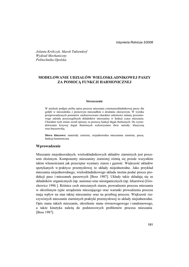 ¦InŜynieria Rolnicza 3/2006 Jolanta Królczyk, Marek Tukiendorf Wydział Mechaniczny Politechnika Opolska MODELOWANIE UDZIAŁÓW WIELOSKŁADNIKOWEJ PASZY ZA POMOCĄ FUNKCJI HARMONICZNEJ Streszczenie W artykule podjęto próbę opisu procesu mieszania czternastoskładnikowej paszy dla gołębi w mieszalniku z pionowym mieszadłem o działaniu okresowym. W wyniku przeprowadzonych pomiarów zaobserwowano charakter zaleŜności zmiany procentowego udziału poszczególnych składników mieszaniny w funkcji czasu mieszania. Charakter tych zmian został opisany za pomocą funkcji drgań tłumionych. Do wymodelowania krzywej drgań tłumionych wykorzystano dwie metody: klasyczną oraz bayesowską. Słowa kluczowe: materiały ziarniste, niejednorodna mieszanina ziarnista, pasza, funkcja harmoniczna Wprowadzenie Mieszanie niejednorodnych, wieloskładnikowych układów ziarnistych jest procesem złoŜonym. Komponenty mieszaniny ziarnistej róŜnią się przede wszystkim takim własnościami jak przeciętne wymiary ziaren i gęstość. Większość układów spotykanych w praktyce przemysłowej to układy niejednorodne. Jako przykład mieszania niejednorodnego, wieloskładnikowego układu moŜna podać proces produkcji pasz i mieszanek paszowych [Boss 1987]. Układy takie składają się ze składników organicznych (np. nasiona) oraz nieorganicznych (np. lekarstwa) [Grochowicz 1996 ]. RóŜnice cech mieszanych ziaren, prowadzenie procesu mieszania w określonym typie urządzenia mieszającego oraz warunki prowadzenia procesu mają wpływ na stan takiej mieszaniny oraz na przebieg procesu. Większość rzeczywistych mieszanin ziarnistych praktyki przemysłowej to układy niejednorodne. Opis stanu takich mieszanin, określenie stanu równowagowego i randomowego, a takŜe kinetyka naleŜą do podstawowych problemów procesu mieszania [Boss 1987]. $,$¦ =b_TagT¦>eÇ_Vml^þ¦@TeX^¦Gh^\XaWbeY¦¦ ¦ W fizyce, technice i Ŝyciu codziennym mamy często do czynienia z ruchem drgającym. Jako przykład tego ruchu moŜna podać ruch tłoka w komorze silnika spalinowego, bicie serca czy teŜ fale dźwiękowe docierającą do naszych uszu podczas koncertu. Ruchem drgającym nazywamy ruch ciała zachodzący wokół stałego połoŜenia równowagi, przy czym rozwaŜania dotyczyć będą ruchu okresowego, w którym ruch polega na cyklicznym wychylaniu się ciała z połoŜenia równowagi w jednakowych odstępach czasu, zwanych okresem drgań T [Bobrowski 1978]. Okresowość ruchu moŜemy wyrazić za pomocą równania (1) dla dowolnego czasu t: u( t ) = u( t + T ) (1) PowyŜsza zaleŜność u(t) moŜe być opisana funkcją czasu pod postacią: u = A sin( ϖt + ϕ ) gdzie: 2π (2) u – funkcja okresowa o okresie T = u – periodic function with the period T = A A ω ω ϕ – amplituda, największe odchylenie od osi czasu t, – amplitude, the highest deviation from the t axis, – prędkość kątowa (pulsacja), – angular velocity (pulsation). – faza początkowa lub przesunięcie fazowe, wyraŜone jako kąt [Brosztejn i in. 2004; Dziubiński, Świątkowski 1978]. – initial phase or phase displacement, express as angle [Brosztejn i in. 2004; Dziubiński, Świątkowski 1978]. ϕ ϖ , 2π ϖ , Kształt funkcji (2) pokazany jest na rysunku 1. Rys. 1. Fig. 1. $,%¦ Kształt krzywej funkcji harmonicznej postaci u = A sin( ϖt + ϕ ) [Dziubiński, Świątkowski 1978] Shape of the harmonic function curve u = A sin( ϖt + ϕ ) [Dziubiński, Świątkowski 1978] ¦@bWX_bjTa\X¦hWm\TÄÇj!!!¦ Ruch harmoniczny tłumiony występuje, gdy drgania odbywają się w ośrodku materialnym, na skutek działania oporu ośrodka (tarcie wewnętrzne, konstrukcyjne, w połączeniach ruchomych, hydrodynamiczne i aerodynamiczne) [Bobrowski 1978, Osiński 1997]. Biorąc pod uwagą budowę maszyn, najistotniejsze znaczenie mają drgania tłumione w ośrodkach gazowych i płynnych. Wykresem funkcji (3) jest krzywa drgań tłumionych (rys. 2): y = Ae − ax sin(ϖx + ϕ 0 ) , a>0, x>0 Rys. 2. Fig. 2. (3) Kształt krzywej drgań tłumionych postaci y = Ae − ax sin( ϖx + ϕ 0 ) [Dziubiński, Świątkowski 1978] Shape of the damped vibration function y = Ae − ax sin( ϖx + ϕ 0 ) [Dziubiński, Świątkowski 1978] Drgania rozchodzą się wzdłuŜ osi x i zbliŜają się do niej asymptotycznie. Postać funkcji harmonicznej tłumionej, oprócz opisu drgań w ośrodku materialnym, na skutek oporu tego ośrodka, została wykorzystana równieŜ do opisu przebiegu innych procesów w róŜnych dziedzinach nauki. Jednym z przykładów wykorzystania tej funkcji w inŜynierii rolniczej jest opisu transportu wilgoci za pośrednictwem fazy powietrznej podczas suszenia ziarna z wykorzystaniem sorbentu naturalnego. W badaniach analizowano wpływ przestrzeni międzyziarnowej na dynamikę wymiany wilgoci dla róŜnych udziałów fazy wilgotnej (sorbetu) i przesuszonej (sorbentu). Zaproponowana postać funkcji harmonicznej z tłumieniem dobrze opisuje przebieg procesu transportu wilgoci podczas suszenia [Szwedziak 2005]. $,&¦ =b_TagT¦>eÇ_Vml^þ¦@TeX^¦Gh^\XaWbeY¦¦ ¦ Cel badań Celem badań było wymodelowanie kształtu funkcji zaleŜności obrazującej zmianę procentowego udział trasera w mieszance w zaleŜności od czasu mieszania przy pomocy funkcji drgań tłumionych. Zastosowanie funkcji drgań harmonicznych tłumionych jest nowatorskim sposobem opisu procesu mieszania materiałów ziarnistych. Metodyka badań Przedmiotem badań była czternastoskładnikowa mieszanka dla gołębi o składzie i udziale procentowym podanym w tabeli 1. Tabela 1. Udziały procentowe składników mieszanki na wejściu Table 1. Input components’ percentages of the mixture Komponent mieszanki Udział procentowy [%] Komponent mieszanki Udział procentowy [%] Peluszka 16,00 Proso Ŝółte 6,50 Sorgo 15,00 Słonecznik czarny 6,00 Dari 10,00 RyŜ biały 5,00 Groch Ŝółty 10,00 Kanar 2,50 Groch zielony 9,00 Wyka brązowa 2,50 Kardi 7,50 Groch nowozelandzki 1,25 O
