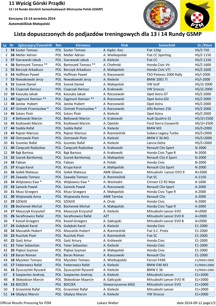 11 Wyścig Górski Prządki 13 i 14 Runda Górskich Samochodowych Mistrzostw Polski (GSMP) Korczyna 13-14 września 2014 Automobilklub Małopolski Lista dopuszczonych do podjazdów treningowych dla 13 i 14 Rundy GSMP No. Lp 1 2 3 4 5 6 7 8 9 10 11 12 13 14 15 16 17 18 19 20 21 22 23 24 25 26 27 28 29 30 31 32 33 34 35 36 37 38 39 40 41 42 43 44 45 46 47 48 49 50 51 Nr 59 58 57 56 55 54 53 52 51 50 49 48 47 46 4 45 44 43 42 41 40 39 32 38 37 36 35 34 33 31 30 29 28 27 26 7 25 24 23 22 21 20 19 18 17 16 3 8 15 2 14 Entrant/Competitor Zgłaszający/Zawodnik Szuter Tomasz Meller Adrian Siarzewski Jakub Bartoszek Tomasz ** Borczyk Arkadiusz Hoffman Paweł Nowakowski Jerzy Szarek Daniel Ciupczyk Dariusz Kaszuba Jakub Zygmunt Damian ** Janów Hubert Ozimek Przemysław * Sztorc Piotr Bełtowski Marcin Kozłowski Marcin Szebla Rafał Rajner Mariusz Ostrowski Piotr Szumiec Rafał Ćwięczek Radosław Bąk Bartosz Szarek Bartłomiej Fabian Krupa Karol Gołek Mateusz Zawada Tomasz Wójtowicz Ewa * Sanecki Paweł Musz Grzegorz Wojewoda Anna SZOŁEK Bochenek Michał Maszczyk Krzysztof Serafinowicz Rafał Kozioł Grzegorz Gołębski Karol Massalski Hubert Ruciński Piotr Gaść Artur Teter Sebastian Piękoś Szymon Baran Roman Myszkier Tomasz Fedorowicz Rafał Żyszczyński Ryszard Szepieniec Andrzej Słobodzian Marcin BOCZEK Grzesiński Rafał Gładysz Marcin Official Results Procesing for PZM Nat. Nar. POL POL POL POL POL POL POL POL POL POL POL POL POL POL POL POL POL POL POL POL POL POL POL POL POL POL POL POL POL POL POL POL POL POL POL POL POL POL POL POL POL POL POL POL POL POL POL POL POL POL POL Driver Kierowca Szuter Tomasz Meller Adrian Siarzewski Jakub Bartoszek Tomasz ** Borczyk Arkadiusz Hoffman Paweł Nowakowski Jerzy Szarek Daniel Ciupczyk Dariusz Kaszuba Jakub Zygmunt Damian ** Janów Hubert Ozimek Przemysław * Sztorc Piotr Bełtowski Marcin Kozłowski Marcin Szebla Rafał Rajner Mariusz Ostrowski Piotr Szumiec Rafał Ćwięczek Radosław Bąk Bartosz Szarek Bartłomiej Fabian Krupa Karol Gołek Mateusz Zawada Tomasz Wójtowicz Ewa * Sanecki Paweł Musz Grzegorz Wojewoda Anna SZOŁEK Bochenek Michał Maszczyk Krzysztof Serafinowicz Rafał Kozioł Grzegorz Gołębski Karol Massalski Hubert Ruciński Piotr Gaść Artury Teter Sebastian Piękoś Szymon Baran Roman Myszkier Tomasz Fedorowicz Rafał Żyszczyński Ryszard Szepieniec Andrzej Słobodzian Maarcin BOCZEK Grzesiński Rafał Gładysz Marcin Club Klub A. Kędzi.-Koz. A. Wielkopolski A. Kielecki A. Chełmski A. Małopolski A. Rzeszowski A. Kielecki A. Małopolski A. Krakowski A. Rzeszowski A. Rzeszowski A. Rzeszowski A. Rzeszowski A. Kielecki A. Krakowski A. Opolski A. Kielecki A. Rzemieślnik A. Kielecki A. Kielecki A. Krakowski A. Krakowski A. Małopolski A. Polski A. Małopolski AMK Gliwice A. Rzemieślnik A. Wschodni A. Rzeszowski A. Małopolski AMK Tarnów A. Orski A. Małopolski A. Kielecki AZT A. Galicyjski A. Kielecki A. Rzemieślnik A. Rzemieślnik A. Królewski A. Kielecki A. Małopolski A. Rzeszowski A. Wielkopolski A. Kielecki A. Kielecki A. Kielecki A. Galicyjski Stowarzyszenie MSG A. Kielecki A. Kielecki Łukasz Walter Make Cat Gr/Class Samochód Kat Gr./Klasa Fiat 126p HS/Z-750 Fiat CC Sporting HS/Z-1150 Fiat CC HS/Z-1150 Honda Civic Vti HS/Z-1600 Honda Civic VTi HS/Z-1600 FSO Polonez 2000 Rally HS/I-2000 BMW 2001 TI HS/I-2000 VW Golf HS/J2-2000 VW Sirocco HS/J2-2000 Opel Astra GT HS/Z-2000 Opel Astra GSI HS/Z-2000 Opel Astra HS/Z-2000 Alfa Romeo 156 HS/Z-2000 Opel Astra HS/Z-2000 Audi Quattro S1 HS/J2+2500 Ford Sierra Cosworth HS/J2+2500 BMW M3 HS/Z+2000 Subaru Legacy Turbo HS/Z+2000 BMW E 36 M3 HS/Z+2000 Lancia Delta HS/Z+2000 Renault Clio Sport N-2000 Honda Civic Type R N-2000 Renault Clio II Sport N-2000 Honda Civic N-2000 Renault Clio Sport N-2000 Mitsubishi Lancer EVO 9 N+2000 Fiat SC A-1150 Citroen C2 R2 Max A-1600 Renault Clio Sport A-2000 Honda Civic Type R A-2000 Renault Clio A-2000 Honda Civic A-2000 Honda Civic Type R A-2000 Mitsubishi Lancer EVO A+2000 Mitsubishi Lancer EVO 8 A+2000 Mitsubishi Lancer EVO 8 A+2000 Honda Civic E1-2000 Fiat S.C. Proto E1-2000 Fiat SC E1-2000 Honda Civic E1-2000 Honda Civic E1-2000 Honda Civic E1-2000 Renault Clio E1-2000 Ferrari F430 E1/RWD+2000 BMW E46 M3 E1/RWD+2000 BMW E 36 E1/RWD+2000 Mitsubishi Lancer E1+2000 Mitsubishi Lancer EVO IX E1+2000 Mitsubishi Lancer EVO E1+2000 Mitsubishi Lancer E1+2000 VW Sirocco E1+2000 date 2014-09-12 page1/2 11 Wyścig Górski Prządki 13 i 14 Runda Górskich Samochodowych Mistrzostw Polski (GSMP) Korczyna 13-14 września 2014 Automobilklub Małopolski Lista dopuszczonych do podjazdów treningowych dla 13 i 14 Rundy GSMP No. Lp 52 53 54 55 56 Nr 10 12 9 11 1 Entrant/Competitor Zgłaszający/Zawodnik DUBAI Matuszyk Michał Soja Piotr Kluza Waldemar Nagórski Tomasz Nat. Driver Nar. POL POL POL POL POL Kierowca DUBAI Matuszyk Michał Soja Piotr Kluza Waldemar Nagórski Tomasz Club Klub Stowarzyszenie MSG A. Wielkopolski A. Opolski A. Beskidzki A. Opolski Make Samochód Mitsubishi Lancer EVO Lotus Exige Lotus Exige Mitsubishi Colt Subaru Impreza 4Turbo Cat Gr/Class Kat Gr./Klasa E1+2000 E2-SH-2000 E2-SH+2000 E2-SH+2000 E2-SH+2000 * - Dodatkowy odbiór administracyjny w sobotę 13-09-2014 do godziny 8:30 ** - Dodatkowe badanie kontrolne w sobotę 13-09-2014 w rejonie startu w godzinach 8.00-8.30 Official Results Procesing for PZM Łukasz Walter date 2014-09-12 page2/2