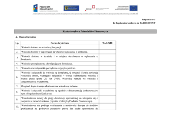 Załącznik nr 3 do Regulaminu konkursu nr 2.6/2015/FPJWP Kryteria wyboru Pośredników Finansowych A. Ocena formalna Lp. Nazwa kryterium 1. Wniosek złożono we właściwej instytucji. 2. Wniosek złożono w odpowiedzi na właściwe ogłoszenie o konkursie. 3 Wniosek złożono w terminie i w miejscu określonym w ogłoszeniu o konkursie. 4. Wniosek sporządzono na obowiązującym formularzu. 5. Wniosek oraz załączniki sporządzono w języku polskim. 6. Wniosek i załączniki do wniosku są kompletne, tj. oryginał i kopia zawierają wszystkie strony, wymagane załączniki + wersja elektroniczna wniosku i biznes planu (płyta CD lub DVD). Wszystkie rubryki we wniosku i załącznikach są wypełnione. 7. Oryginał, kopia i wersja elektroniczna wniosku są tożsame. 8. Wniosek i załączniki wypełnione są zgodnie z dokumentacją konkursową (w tym z Regulaminem Konkursu). 9. Wnioskodawca należy do grupy docelowej, uprawnionej do ubiegania się o wsparcie w ramach konkursu (zgodnie z Metryką Produktu Finansowego). 10. Wnioskodawca nie podlega wykluczeniu z możliwości dostępu do środków publicznych na podstawie przepisów prawa lub osoby uprawnione do TAK/NIE reprezentacji Wnioskodawcy nie podlegają takiemu wykluczeniu. 11. Wnioskodawca prowadzi działalność na terenie województwa pomorskiego. 12. Wnioskodawca prowadzi (lub deklaruje prowadzenie) ewidencję udzielonych Pożyczek dla segmentu MŚP, umożliwiającą sporządzenie okresowych raportów. 13. Wnioskodawca nie znajduje się w likwidacji, w toku postępowania upadłościowego, naprawczego lub pod zarządem komisarycznym oraz nie zachodzą okoliczności dające podstawę do jakiegokolwiek z powyższych zdarzeń. 14. Operacja jest realizowana na terytorium województwa pomorskiego (Operacja zakłada udzielanie Pożyczek na przedsięwzięcia realizowane na terenie województwa pomorskiego). 15. Operacja zakłada pozytywny lub neutralny wpływ na polityki horyzontalne (w szczególności zrównoważony rozwój i równe szanse). 16. Operacja zakłada zgodność z prawodawstwem i krajowym oraz dokumentami programowymi. 17. Operacja jest zgodna z przepisami dotyczącymi pomocy publicznej. 18. Operacja nie zakłada udzielania pomocy przedsiębiorcom znajdującym się w trudnej sytuacji w rozumieniu pkt 20 Wytycznych dotyczących pomocy państwa na ratowanie i restrukturyzację przedsiębiorstw niefinansowych znajdujących się w trudnej sytuacji (Dz. Urz. UE C 249/1 z 31.07.2014 r.). 19. Wnioskodawca zakłada kwalifikowalność wydatków w ramach Operacji. 20. Wnioskodawca zakłada, że średnioroczne koszty zarządzania Operacji są zgodne z poziomem kosztów określonym w Regulaminie Konkursu. 21. Wyliczenia zawarte w złożonej dokumentacji konkursowej zostały dokonane prawidłowo. wspólnotowym 2 B. 1. Kryteria merytoryczne dopuszczające Lp. Nazwa kryterium zgodna z aktualną Strategią TAK/NIE 1. Operacja jest Pomorskiego. Rozwoju Województwa 2. Operacja przyczynia się do osiągnięcia docelowych wartości wskaźników Regionalnego Programu Operacyjnego dla Województwa Pomorskiego na lata 2007-2013. 3. Ogólna sytuacja finansowa Wnioskodawcy nie budzi zastrzeżeń. 4. Operacja zakłada zwiększenie dostępności do źródeł finansowania dla MŚP w województwie pomorskim. 5 Struktura planowanego portfela udzielonych Pożyczek jest zgodna z założeniami przyjętymi w Dokumentacji konkursowej. Ocenie będzie podlegać zaprojektowana struktura portfela w tym m.in.: a) wielkość MŚP wspartych w ramach operacji, b) liczba wspartych Start-upów w relacji do liczby wspartych przedsiębiorstw ogółem. 6. Założone we wniosku wskaźniki są realne do osiągnięcia. 7. Wnioskodawca posiada zdolność do aktywnego działania w regionie. Ocenie będzie podlegać m.in. czy Wnioskodawca posiada co najmniej 1 oddział (placówkę) na terenie województwa pomorskiego. 8. Wnioskodawca posiada zdolność instytucjonalną do sprawnej realizacji Operacji, w szczególności doświadczenie, strukturę organizacyjną, zaplecze techniczne, kadrę zaangażowaną w realizację i obsługę Operacji. 3 B. 2. Kryteria Merytoryczne Punktowe Lp. 1. Nazwa kryterium Zakładany okres budowy portfela Punkty 0-20 Źródło informacji (Nazwa dokumentu) Opis kryterium Ocenie podlega zakładana szybkość budowy portfela. Liczba uzyskanych punktów uzależniona jest od zakładanego tempa budowy portfela. Pośrednik Finansowy otrzyma punkty, jeżeli zakładany okres budowy portfela wyniesie: Biznes Plan pkt C.3, Tab. 5. do 12 miesięcy – 20 pkt powyżej 12 do 15 miesięcy – 10 pkt powyżej 15 miesięcy – 0 pkt 2. Udział start-upów w liczbie wspartych MŚP 0-30 Ocenie podlega deklarowany udział startupów w liczbie wspartych MŚP ogółem Liczba wspartych start-upów: powyżej 30% – 30 pkt 20% do 30% - 10 pkt poniżej 20% - 0 pkt 4 Biznes Plan, Pkt B.4 Zachęty Zgodnie z pkt IX. 5, lit. a) – d) Metryki Produktu Finansowego. Zgodnie z pkt IX. 5, lit. e) Metryki Produktu Finansowego. Kary Zgodnie z pkt IX. 7 oraz IX. 8 Metryki Produktu Finansowego. Brak możliwości ubiegania się Pośrednika Finansowego o zachętę, o której mowa w pkt IX. 5, lit. a) – e) Metryki Produktu Finansowego. Pośrednik Finansowy nie będzie miał możliwości niespełnienia tego kryterium. Na etapie realizacji Operacji weryfikacja będzie przeprowadzana zgodnie z dokumentem Szczegółowe Zasady Sprawozdawczości. W przypadku niezgodności Menadżer może zażądać: 1) usunięcia pożyczki / pożyczek udzielonych przedsiębiorstwom niespełniającym kryterium Start – up (zgodnie z Metryką) z Rejestru Jednostkowych Pożyczek oraz 2) udzielenia kolejnych pożyczek przedsiębiorstwom spełniającym kryteria Start - up. 3. Doświadczenie – liczba wspartych MŚP 0-50 Ocenie podlega liczba MŚP wspartych w ramach infrastruktury (zlokalizowanej na terenie województwa pomorskiego), której zadaniem jest udostępnienie powierzchni pomieszczeń na prowadzenie dzia
