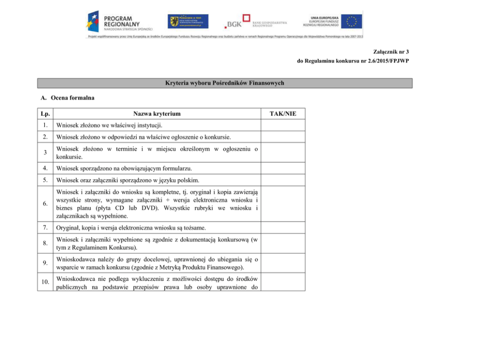 Regulamin Konkursu, Załącznik 3 Kryteria wyboru Pośredników