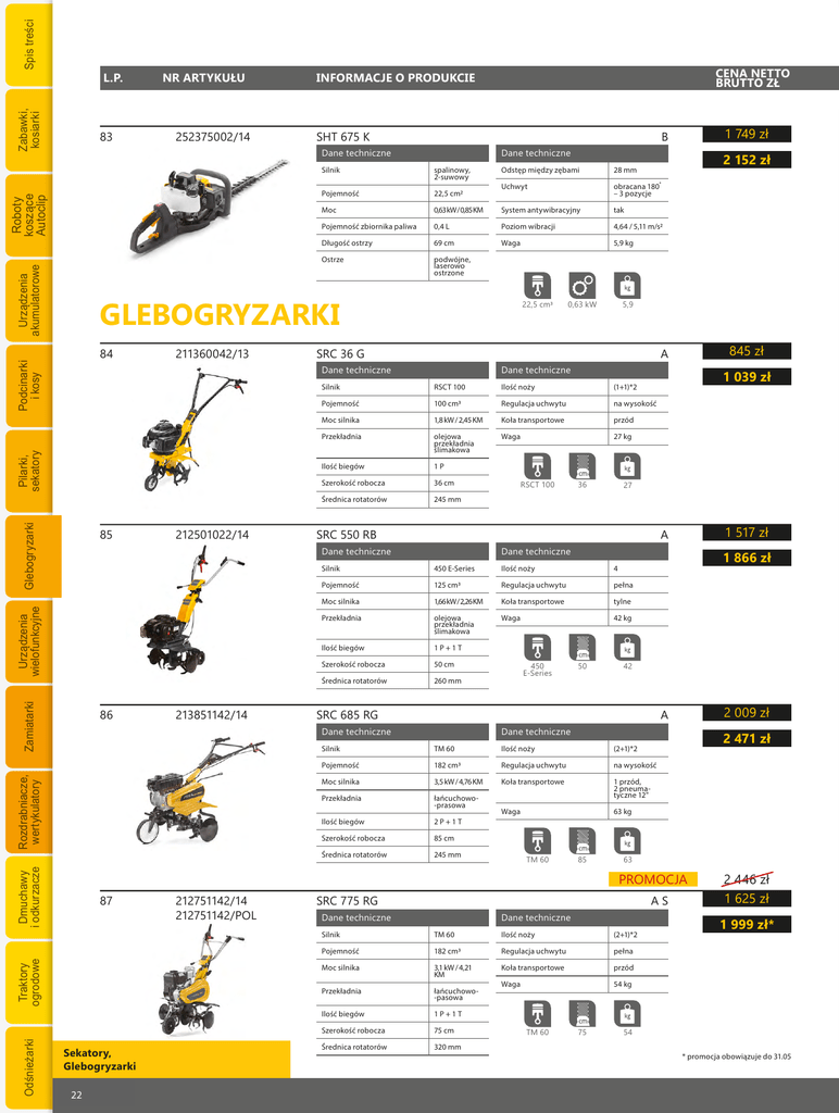 Spis treści Zabawki, kosiarki L.P. 83 NR ARTYKUŁU 252375002/14 SHT 675 K Roboty koszące Autoclip Urządzenia akumulatorowe Dane techniczne Silnik spalinowy, 2-suwowy Pojemność 22,5 cm2 Moc Pojemność zbiornika paliwa Podcinarki i kosy 211360042/13 28 mm Uchwyt obracana 180˚ – 3 pozycje 0,63 kW / 0,85 KM System antywibracyjny tak 0,4 L Poziom wibracji 4,64 / 5,11 m/s2 Długość ostrzy 69 cm Waga 5,9 kg Ostrze podwójne, laserowo ostrzone 22,5 cm3 Pilarki, sekatory Glebogryzarki 212501022/14 Urządzenia wielofunkcyjne Zamiatarki 213851142/14 Rozdrabniacze, wertykulatory 845 zł A 1 039 zł Silnik RSCT 100 Ilość noży (1+1)*2 Pojemność 100 cm3 Regulacja uchwytu na wysokość Moc silnika 1,8 kW / 2,45 KM Koła transportowe przód Przekładnia olejowa przekładnia ślimakowa Waga 27 kg Ilość biegów 1P Szerokość robocza 36 cm Średnica rotatorów 245 mm RSCT 100 36 27 SRC 550 RB 1 517 zł A Dane techniczne 1 866 zł Silnik 450 E-Series Ilość noży 4 Pojemność 125 cm3 Regulacja uchwytu pełna Moc silnika 1,66 kW / 2,26 KM Koła transportowe tylne Przekładnia olejowa przekładnia ślimakowa Waga 42 kg Ilość biegów 1P+1T Szerokość robocza 50 cm Średnica rotatorów 260 mm 450 E-Series 50 42 SRC 685 RG 2 009 zł A Dane techniczne Dmuchawy i odkurzacze 5,9 Dane techniczne Dane techniczne 86 0,63 kW SRC 36 G Dane techniczne 85 2 152 zł Odstęp między zębami GLEBOGRYZARKI 84 1 749 zł B Dane techniczne Dane techniczne Silnik TM 60 Ilość noży (2+1)*2 2 471 zł Pojemność 182 cm3 Regulacja uchwytu na wysokość Moc silnika 3,5 kW / 4,76 KM Koła transportowe Przekładnia łańcuchowo-prasowa 1 przód, 2 pneumatyczne 12" Waga 63 kg Ilość biegów 2P+1T Szerokość robocza 85 cm Średnica rotatorów 245 mm TM 60 85 63 PROMOCJA 87 Traktory ogrodowe Odśnieżarki CENA NETTO BRUTTO ZŁ INFORMACJE O PRODUKCIE Sekatory, Glebogryzarki 22 20 212751142/14 212751142/POL SRC 775 RG AS Dane techniczne Dane techniczne Silnik TM 60 Ilość noży (2+1)*2 Pojemność 182 cm3 Regulacja uchwytu pełna Moc silnika 3,1 kW / 4,21 KM Koła transportowe przód Waga 54 kg Przekładnia łańcuchowo-pasowa Ilość biegów 1P+1T Szerokość robocza 75 cm Średnica rotatorów 320 mm TM 60 75 2 446 zł 1 625 zł 1 999 zł* 54 * promocja obowiązuje do 31.05