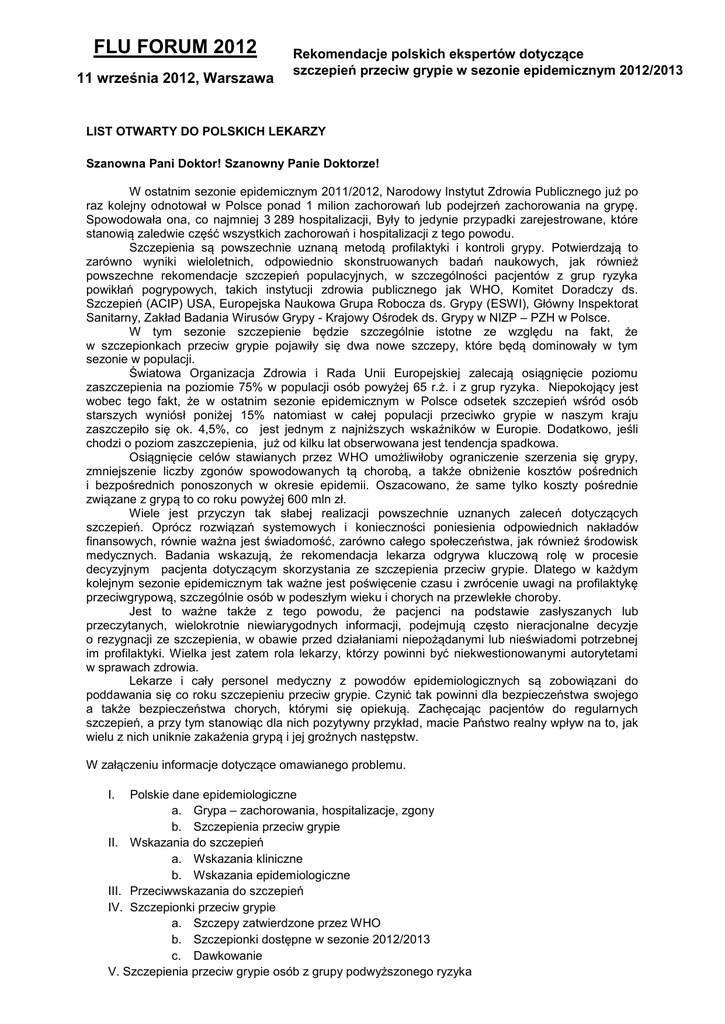 FLU FORUM 2012 11 września 2012, Warszawa Rekomendacje polskich ekspertów dotyczące szczepień przeciw grypie w sezonie epidemicznym 2012/2013 LIST OTWARTY DO POLSKICH LEKARZY Szanowna Pani Doktor! Szanowny Panie Doktorze! W ostatnim sezonie epidemicznym 2011/2012, Narodowy Instytut Zdrowia Publicznego już po raz kolejny odnotował w Polsce ponad 1 milion zachorowań lub podejrzeń zachorowania na grypę. Spowodowała ona, co najmniej 3 289 hospitalizacji, Były to jedynie przypadki zarejestrowane, które stanowią zaledwie część wszystkich zachorowań i hospitalizacji z tego powodu. Szczepienia są powszechnie uznaną metodą profilaktyki i kontroli grypy. Potwierdzają to zarówno wyniki wieloletnich, odpowiednio skonstruowanych badań naukowych, jak również powszechne rekomendacje szczepień populacyjnych, w szczególności pacjentów z grup ryzyka powikłań pogrypowych, takich instytucji zdrowia publicznego jak WHO, Komitet Doradczy ds. Szczepień (ACIP) USA, Europejska Naukowa Grupa Robocza ds. Grypy (ESWI), Główny Inspektorat Sanitarny, Zakład Badania Wirusów Grypy - Krajowy Ośrodek ds. Grypy w NIZP – PZH w Polsce. W tym sezonie szczepienie będzie szczególnie istotne ze względu na fakt, że w szczepionkach przeciw grypie pojawiły się dwa nowe szczepy, które będą dominowały w tym sezonie w populacji. Światowa Organizacja Zdrowia i Rada Unii Europejskiej zalecają osiągnięcie poziomu zaszczepienia na poziomie 75% w populacji osób powyżej 65 r.ż. i z grup ryzyka. Niepokojący jest wobec tego fakt, że w ostatnim sezonie epidemicznym w Polsce odsetek szczepień wśród osób starszych wyniósł poniżej 15% natomiast w całej populacji przeciwko grypie w naszym kraju zaszczepiło się ok. 4,5%, co jest jednym z najniższych wskaźników w Europie. Dodatkowo, jeśli chodzi o poziom zaszczepienia, już od kilku lat obserwowana jest tendencja spadkowa. Osiągnięcie celów stawianych przez WHO umożliwiłoby ograniczenie szerzenia się grypy, zmniejszenie liczby zgonów spowodowanych tą chorobą, a także obniżenie kosztów pośrednich i bezpośrednich ponoszonych w okresie epidemii. Oszacowano, że same tylko koszty pośrednie związane z grypą to co roku powyżej 600 mln zł. Wiele jest przyczyn tak słabej realizacji powszechnie uznanych zaleceń dotyczących szczepień. Oprócz rozwiązań systemowych i konieczności poniesienia odpowiednich nakładów finansowych, równie ważna jest świadomość, zarówno całego społeczeństwa, jak również środowisk medycznych. Badania wskazują, że rekomendacja lekarza odgrywa kluczową rolę w procesie decyzyjnym pacjenta dotyczącym skorzystania ze szczepienia przeciw grypie. Dlatego w każdym kolejnym sezonie epidemicznym tak ważne jest poświęcenie czasu i zwrócenie uwagi na profilaktykę przeciwgrypową, szczególnie osób w podeszłym wieku i chorych na przewlekłe choroby. Jest to ważne także z tego powodu, że pacjenci na podstawie zasłyszanych lub przeczytanych, wielokrotnie niewiarygodnych informacji, podejmują często nieracjonalne decyzje o rezygnacji ze szczepienia, w obawie przed działaniami niepożądanymi lub nieświadomi potrzebnej im profilaktyki. Wielka jest zatem rola lekarzy, którzy powinni być niekwestionowanymi autorytetami w sprawach zdrowia. Lekarze i cały personel medyczny z powodów epidemiologicznych są zobowiązani do poddawania się co roku szczepieniu przeciw grypie. Czynić tak powinni dla bezpieczeństwa swojego a także bezpieczeństwa chorych, którymi się opiekują. Zachęcając pacjentów do regularnych szczepień, a przy tym stanowiąc dla nich pozytywny przykład, macie Państwo realny wpływ na to, jak wielu z nich uniknie zakażenia grypą i jej groźnych następstw. W załączeniu informacje dotyczące omawianego problemu. I. Polskie dane epidemiologiczne a. Grypa – zachorowania, hospitalizacje, zgony b. Szczepienia przeciw grypie II. Wskazania do szczepień a. Wskazania kliniczne b. Wskazania epidemiologiczne III. Przeciwwskazania do szczepień IV. Szczepionki przeciw grypie a. Szczepy zatwierdzone przez WHO b. Szczepionki dostępne w sezonie 2012/2013 c. Dawkowanie V. Szczepienia przeciw grypie osób z grupy podwyższonego ryzyka Opracowano na podstawie: 1. Prevention and Control of Influenza with Vaccines, Recommendations of the Advisory Committee on Immunization Practices (ACIP), 2010. MMWR 2010; 59, (No. RR-8):1-64. 2. Brydak L.B. Grypa, pandemia grypy - mit czy zagrożenie? Oficyna Wydawnicza Rytm, Warszawa 2008, 1-494. 3. Meldunki epidemiologiczne dostępne na www.pzh.gov.pl 4. GRYPA wskazania do szczepień, możliwe powikłania pogrypowe. List do lekarzy. Krajowy Ośrodek ds. Grypy , Polskie Towarzystwo Medycyny Rodzinnej, 2008 Brydak L.B., Romanowska M., Steciwko A., Radzikowski A., Polskie Standardy Profilaktyki Grypy 5. Rekomendacje Krajowego Ośrodka ds. Grypy, NIZP- PZH. Polskiego Towarzystwa Medycyny Rodzinnej, Warszawa 2007. 6. Zalecenia do szczepień przeciwko grypie na sezon epidemiczny 2012/2013 dostępne na www.pzh.gov.pl ZAŁĄCZNIK 1A. Grypa - epidemiologia Średnia dzienna zapadalność na grypę i podejrzenia grypy (na 100 tys. ludności) wg tygodniowych / dwutygodniowych meldunków w sezonie 2011/12 w porównaniu z sezonami 2006/2007 - 2010/2011 (www.pzh.gov.pl) 1 400 000 3 500 1 200 000 3 000 1 000 000 2 500 800 000 2 000 600 000 1 500 400 000 1 000 200 000 500 0 0 Zapadalność roczna na 100 tys. ludności Zachorowania 2. Zachorowania i podejrzenia zachorowań na grypę oraz zapadalność na grypę lub podejrzenia grypy w sezonach 2000/2001 -2011/2012 (www.pzh.gov.pl) Tysiące 3. Zachorowania i podejrzenia zachorowań na grypę oraz hospitalizacje z powodu grypy lub podejrzeń grypy w sezonach 2000/2001-2011/2012 (www.pzh.gov.pl) 1 400 9 000 8 000 1 200 7 000 Zachorowania 6 000 800 5 000 600 4 000 3 000 Hospitalizacje 1 000 400 2 000 200 1 000 0 0 Zachorowania Hospitalizacje Tysiące 4. Zachorowania i podejrzenia zachorowań 