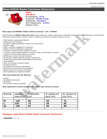 Informacje o produkcie Utworzono 07-03-2017 Bluza KASSA Męska Czerwona Ośmiornica Cena : 249,00 zł Nr katalogowy : 0114 Producent : KASSA Group Dostępność : Dostępny Stan magazynowy : wysoki Średnia ocena : Bluza męska dla NURKÓW KASSA w kolorze czerwonym wzór OCTOPUS ● ● ● ● ● ● ● ● ● ● ● ● ● ● ● ● ● ● ● er m ar k Bluza Polskiej firmy KASSA deep water world, bardzo praktyczna, miękka i ciepła uszyta z podwójnej warstwy materiału wysokiej jakości i bardzo dobrze wykończona. Bluza powstała z myślą o nurkach, miłośnikach nurkowania i wszystkich lubiących ten styl. 100% bawełna o gramaturze 400g./m2. Podwójna warstwa materiału W środku w kapturze podszewka z logiem firmy małe literki K Mięsista i ciepła Kaptur z gumkami ściągającymi ze stoperami Rękawy i dół bluzy wykończone ściągaczami 2 kieszenie z przodu wsuwane zapinane na suwak 1 kieszeń z przodu pionowa zapinana na suwak w środku z karabińczykiem na gumie 1 kieszeń na lewym rękawie zapinana na suwak KASSA napis z przodu na kieszeni pionowej Na końcach suwaków zawieszki gumowe z logiem firmy Na dole bluzy wszyte kółko do przyczepienia karabińczyka Szwy podwójne Konik morski (logo) na prawym rękawie Na kapturze litera K Na prawej bocznej kieszeni mała literka K Ośmiornica z tyłu na plecach (duża aplikacja) Wyszyty napis z tyłu na dolnej części bluzy Bluza zapakowana w eleganckie pudełko Bluza jest przeznaczona dla Mężczyzn ● ● ● Nurków Sympatyków nurkowania Na prezent Dla wszystkich którym się podoba at ● w Bluza zapakowana w proste ale eleganckie pudełko super sprawa na prezent. Rozmiar: obwód w dł całkowita klatce [cm] [cm] M L XL 118 126 130 69 73 81 dł. rękawa od pach [cm] 56 59 65 Dostępne opcje Bluza KASSA Męska Czerwona Ośmiornica » Rozmiar: M, L, XL. Wygenerowano w programie www.oscGold.com dł. rękawa od szyi [cm] 75 85 89
