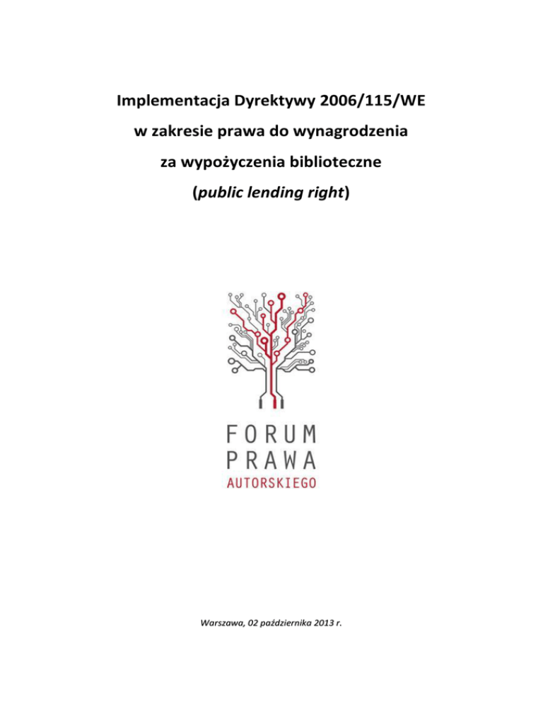 Implementacja Dyrektywy 2006/115/WE w zakresie prawa do wynagrodzenia za wypożyczenia biblioteczne (public lending right) Warszawa, 02 października 2013 r. 1. Podstawowe informacje dotyczące wdrożenia dyrektywy 2006/115/WE w zakresie prawa do wynagrodzenia za wypożyczenia biblioteczne. 1. Dyrektywa Parlamentu Europejskiego i Rady z dnia 12 grudnia 2006 r. w sprawie prawa najmu i użyczenia oraz niektórych praw pokrewnych prawu autorskiemu w zakresie własności intelektualnej (2006/115/WE) reguluje obowiązki państw członkowskich związane z wprowadzeniem do krajowego ustawodawstwa prawa najmu i użyczenia oryginałów i egzemplarzy powielonych utworów chronionych prawem autorskim i prawami pokrewnymi. Tekst z 2006 roku jest wersją ujednoliconą dyrektywy Rady Wspólnot Europejskich nr 92/100 z 19 listopada 1992 r. 2. Zgodnie z motywem (5) dyrektywy 2006/115/WE w celu umożliwienia wykonywania działalności twórcom i wykonawcom konieczne są dla nich stosowne dochody stanowiące podstawę dla dalszej pracy twórczej i artystycznej. Możliwość zapewnienia tego rodzaju dochodów może być efektywnie zagwarantowana jedynie przez stosowną ochronę prawną każdego zainteresowanego właściciela praw. Natomiast motyw (14) podkreśla, że państwa członkowskie winny wprowadzić, przynajmniej w stosunku do twórców, szczególne regulacje w przypadku prawa użyczenia publicznego. 3. Dyrektywa wprowadza prawo do godziwego wynagrodzenia w związku z najmem utworów lub przedmiotów praw pokrewnych (art. 5) oraz prawo do wynagrodzenia w związku z publicznym użyczeniem utworów lub przedmiotów praw pokrewnych (art. 6). Wynagrodzenie za publiczne użyczenie, które obejmuje wypożyczanie egzemplarzy utworów w instytucjach dostępnych dla publiczności, w tym w bibliotekach, ma charakter obligatoryjny i niezależny od tego, czy państwo członkowskie UE zdecyduje się na wprowadzenie prawa wyłącznego związanego z publicznym użyczaniem. Prawo do wynagrodzenia za publiczne użyczanie egzemplarzy utworów przez biblioteki określa się również jako public lending right. 4. Dyrektywa Rady Wspólnot Europejskich nr 92/100 została implementowana do polskiego systemu prawa w dwóch nowelizacjach ustawy o prawie autorskim i prawach pokrewnych tj. ustawach z 9 czerwca 2000 r. oraz 28 października 2002 r. W wyniku tych nowelizacji zostały wprowadzone zmiany do art. 6, art. 28, art. 50, art. 51 i art. 97 ustawy. 5. Art. 28 ustawy o prawie autorskim i prawach pokrewnych zawiera w obecnym brzmieniu szerokie zwolnienie z obowiązku wynagradzania uprawnionych za udostępnienie egzemplarzy utworów rozpowszechnionych przez biblioteki, archiwa i szkoły. Zgodnie z obowiązującymi przepisami ich wypożyczanie przez te instytucje jest całkowicie nieodpłatne – stanowi więc użyczenie w rozumieniu art. 2 pkt 1 b dyrektywy 2006/115/WE. 6. W świetle orzeczeń Trybunału Sprawiedliwości Unii Europejskiej, a w szczególności wyroków w sprawach C- 67/08 Padawan oraz C-271/10 Vewa całkowite wyłączenie z systemu wynagrodzeń za wypożyczenia biblioteczne wszystkich bibliotek publicznych jest sprzeczne z dyrektywą 2006/115/WE. Po wydaniu tychże orzeczeń nie budzi więc wątpliwości, że uprawnionym na podstawie przepisów dyrektywy należy się stosowne wynagrodzenie także w przypadku użyczania egzemplarzy ich utworów przez biblioteki publiczne. Brak skutecznej implementacji przepisów dotyczących wynagrodzenia z tytułu public lending right może skutkować wszczęciem przez Komisję Europejską postępowania przed Trybunałem Sprawiedliwości Unii Europejskiej przeciwko Polsce, związanego z niepełnym wdrożeniem dyrektywy 2006/115/WE. W związku z tym należy wypracować model implementacji public lending right najbardziej dostosowany do polskich realiów i potrzeb, bazując na doświadczeniach innych państw Unii Europejskiej, w których takie rozwiązania od dawna funkcjonują. 2|S tr o na 7. Polska jest bowiem jednym z trzech państw Unii Europejskiej - obok Rumunii i Bułgarii które jak dotąd nie implementowały regulacji dotyczącej wynagrodzenia za wypożyczenia biblioteczne. Systemy wynagrodzeń za wypożyczenia biblioteczne poza Unią Europejską istnieją również w Australii, Izraelu, Kanadzie, Norwegii i Nowej Zelandii. 8. Pewnych wskazówek w zakresie koniecznej implementacji dostarcza orzecznictwo Trybunału Sprawiedliwości Unii Europejskiej. Wyrok w sprawie C-271/10 VEWA określa kryteria, jakimi powinny kierować się państwa członkowskie przy ustalaniu wysokości opłat z tytułu użyczania publicznego. Trybunał stwierdził, iż opłaty te winny odzwierciedlać intensywność korzystania ze zbiorów bibliotecznych, a także nie mogą być określane jedynie na podstawie liczby wypożyczających zapisanych do bibliotek (np. obliczane na podstawie ryczałtowej kwoty ustalonej od jednego wypożyczającego za dany rok). Jednocześnie TSUE zauważył, że przepisy przedmiotowej dyrektywy nie definiują pojęcia wynagrodzenia. Stąd przepisy odnoszące się do wynagrodzenia należy - zgodnie z zasadami jednolitego stosowania prawa wspólnotowego i równości - interpretować w świetle przepisów i zasad ustanowionych przez ogół dyrektyw dotyczących własności intelektualnej w rozumieniu nadanym im przez Trybunał. TSUE powołał się tu na istniejące orzecznictwo, m.in. w sprawie C-467/08 Padawan, w której wskazano, że wynagrodzenie uprawnionego, czy inaczej mówiąc rekompensata, ma na celu wyrównanie szkody poniesionej przez twórców z powodu korzystania bez ich zgody z chronionych utworów. Zdaniem TSUE określenie najważniejszych kryteriów w ustalaniu wysokości wynagrodzenia, w sposób zgodny z prawem wspólnotowym, należy wyłącznie do państw członkowskich. Niemniej jednak, z uwagi na motyw piąty dyrektywy 2006/115/WE, w którym mowa jest o tym, że wynagrodzenie/rekompensata ustanowione na mocy dyrektywy powinno pozwolić twórcom na 