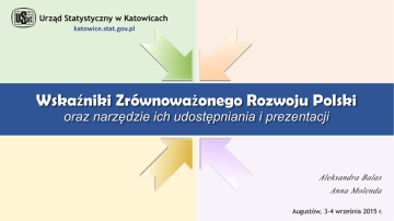 Urząd Statystyczny w Katowicach katowice.stat.gov.pl Wskaźniki Zrównoważonego Rozwoju Polski oraz narzędzie ich udostępniania i prezentacji Aleksandra Balas Anna Molenda Augustów, 3-4 września 2015 r. Projekt: Wsparcie w zakresie rozwijania zestawu wskaźników do monitorowania narodowych strategii zrównoważonego rozwoju – Rozwój i wdrożenie polskiego zestawu wskaźników zrównoważonego rozwoju W ramach wymienionego projektu w latach 2009-2011 były realizowane pierwsze prace, mające na celu opracowanie krajowego zestawu wskaźników do monitorowania zrównoważonego rozwoju kraju oraz opracowanie i wdrożenie strategii ich udostępniania. Z uwagi na brak w Polsce Narodowej Strategii Zrównoważonego Rozwoju, projekt zakładał dobór wskaźników zrównoważonego rozwoju w oparciu o założenia i cele odnoszące się do wyzwań zrównoważonego rozwoju zapisanych w krajowych dokumentach strategicznych. Wynikiem projektu była opracowana lista 77 wskaźników zrównoważonego rozwoju kraju w układzie 4 ładów: społecznego, gospodarczego, środowiskowego i instytucjonalno-politycznego. katowice.stat.gov.pl 2 Kryteria doboru wskaźników oraz przyjęta koncepcja ich grupowania według ładów i dziedzin Zasada zrównoważonego rozwoju posiada w Polsce rangę konstytucyjną i jest zawarta w art. 5 Konstytucji Rzeczypospolitej Polskiej jako jedna z zasad ustrojowych. Zrównoważony rozwój jest podstawowym celem polityki rozwoju prowadzonej na szczeblu krajowym, regionalnym i lokalnym w oparciu o odpowiednie dokumenty strategiczne. Identyfikacja celów i priorytetów odnoszących się do wyzwań zrównoważonego rozwoju zapisanych w krajowych dokumentach strategicznych stanowiła podstawę do opracowania krajowej listy wskaźników zrównoważonego rozwoju. katowice.stat.gov.pl 6 Założenia przyjęte w pracach nad zestawem wskaźników zrównoważonego rozwoju Za podstawę aktualizacji zestawu wskaźników przyjęto założenia i rozwiązania ustalone w trakcie realizacji zakończonego w 2011 r. projektu, dotyczące zarówno metody doboru wskaźników jak również ich grupowania według ładów i dziedzin. W pracach nad zestawem wskaźników monitorujących ZR zastosowano definicję zrównoważonego rozwoju zawartą w Ustawie Prawo Ochrony Środowiska z dnia 27 kwietnia 2001 r. w art. 3 pkt. 50: Zrównoważony rozwój – to rozwój społeczno-gospodarczy, w którym następuje proces integrowania działań politycznych, gospodarczych i społecznych, z zachowaniem równowagi przyrodniczej oraz trwałości podstawowych procesów przyrodniczych, w celu zagwarantowania możliwości zaspokajania podstawowych potrzeb poszczególnych społeczności lub obywateli zarówno współczesnego pokolenia, jak i przyszłych pokoleń. katowice.stat.gov.pl 3 Założenia przyjęte w pracach nad zestawem wskaźników zrównoważonego rozwoju W pracach nad przygotowaniem zaktualizowanego zestawu wskaźników wykorzystano formę konkretyzacji koncepcji zrównoważonego rozwoju zastosowaną w zrealizowanym wcześniej projekcie. Wybór wskaźników poprzedzony został odpowiedzią na pytanie: co chcemy mierzyć?, czyli jakie elementy koncepcji zrównoważonego rozwoju będą przedmiotem pomiaru. Fundament monitoringu stanowił komplementarny opis ww. koncepcji rozwoju poprzez identyfikację: • zasad zrównoważonego rozwoju, stanowiących podstawowy „filtr” dla selekcji wskaźników, • celów jako pozytywnych stanów docelowych rozwoju, opisanych w różnych dokumentach strategicznych, • ładów: społecznego, gospodarczego, środowiskowego, instytucjonalno-politycznego. katowice.stat.gov.pl 4 Założenia przyjęte w pracach nad zestawem wskaźników zrównoważonego rozwoju Cele oraz łady mają charakter wzorców do osiągnięcia, do których zmierzają zrównoważone zmiany rozwojowe. Wzajemne powiązania tych fundamentalnych dla prawidłowego pomiaru zrównoważonego rozwoju kategorii ilustruje poniższy rysunek. ZRÓWNOWAZONY ROZWÓJ (ZR) ZASADY ZR dobór celów grupowanie celów CELE ZR ŁAD ŁAD ZINTEGROWANY ZINTEGROWANY ZR ZR ŁAD społeczny ZR pomiar realizacji celów i ładów WSKAŹNIKI ZR rozwoju społecznego społeczne rozwoju gospodarczego gospodarcze ŁAD gospodarczy ZR gospodarcze rozwoju środowiskowego środowiskowe ŁAD środowiskowy ZR środowiskowe rozwoju instytucjonalno-politycznego instytucjonalno /polityczne ŁAD instytucjonalno-polityczny społeczne instytucjonalno-polityczne Dobór wskaźników katowice.stat.gov.pl 5 Kryteria doboru wskaźników oraz przyjęta koncepcja ich grupowania według ładów i dziedzin Podczas doboru wskaźników w ramach poszczególnych ładów i dziedzin kierowano się następującymi kryteriami: • • • • obecność na liście wskaźników do monitorowania realizacji Strategii Zrównoważonego Rozwoju UE, porównywalność międzynarodowa, dostępność danych, wiarygodność źródła danych. Wśród licznych wymogów poprawności wskaźnika zrównoważonego rozwoju należy wymienić przede wszystkim: • • konieczność występowania związku merytorycznego z opisywanym zjawiskiem zrównoważonego rozwoju poprzez odpowiedź na pytania: czy wskaźnik wyraża istotę zrównoważonego rozwoju i jaki ład, temat, jaką zasadę oraz cel rozwojowy wskaźnik opisuje? poprawność formalną ocenianą na podstawie ogólnych zasad poprawności budowy wskaźnika (ocenie podlegały następujące kryteria: interpretacja – dostępność wyjaśnień i komentarzy ułatwiających zrozumienie treści prezentowanych informacji, teoretyczna trafność – czy wskaźnik możliwie najlepiej odzwierciedla zachodzące zjawiska, metodologia – czy istnieje jasna i czytelna metodologia obliczania wskaźnika, jakość oraz porównywalność i dostępność danych). katowice.stat.gov.pl 7 Kryteria doboru wskaźników oraz przyjęta koncepcja ich grupowania według ładów i dziedzin Prace aktualizacyjne w pierwszym etapie obejmowały swoim zak