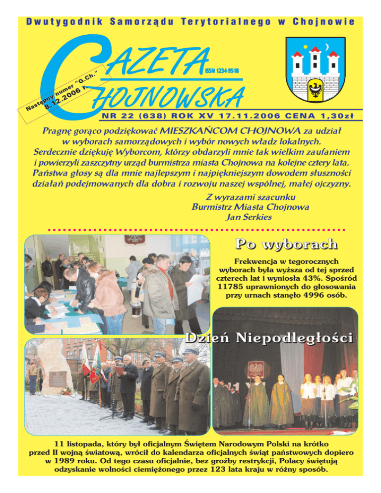 D w u t y g o d n i k S a m o r z ¹ d u Te r y t o r i a l n e g o w C h o j n o w i e ” h. .C G “ er r. m 6 u n 00 y .2 pn tê .12 s 8 Na NR 22 (638) ROK XV 17.11.2006 CENA 1,30z³ Pragnê gor¹co podziêkowaæ MIESZKAÑCOM CHOJNOWA za udzia³ w wyborach samorz¹dowych i wybór nowych w³adz lokalnych. Serdecznie dziêkujê Wyborcom, którzy obdarzyli mnie tak wielkim zaufaniem i powierzyli zaszczytny urz¹d burmistrza miasta Chojnowa na kolejne cztery lata. Pañstwa g³osy s¹ dla mnie najlepszym i najpiêkniejszym dowodem s³usznoœci dzia³añ podejmowanych dla dobra i rozwoju naszej wspólnej, ma³ej ojczyzny. Z wyrazami szacunku Burmistrz Miasta Chojnowa Jan Serkies Po wyborach Frekwencja w tegorocznych wyborach by³a wy¿sza od tej sprzed czterech lat i wynios³a 43%. Spoœród 11785 uprawnionych do g³osowania przy urnach stanê³o 4996 osób. Dzieñ Niepodleg³oœci 11 listopada, który by³ oficjalnym Œwiêtem Narodowym Polski na krótko przed II wojn¹ œwiatow¹, wróci³ do kalendarza oficjalnych œwi¹t pañstwowych dopiero w 1989 roku. Od tego czasu oficjalnie, bez groŸby restrykcji, Polacy œwiêtuj¹ odzyskanie wolnoœci ciemiê¿onego przez 123 lata kraju w ró¿ny sposób. Chojnowskie rozmaitoœci Z prac wydzia³ów Wydzia³ RG * Trwaj¹ prace przy budowie oœwietlenia ulicznego na ulicach Matejki, Wyspiañskiego, Orzeszkowej i Konopnickiej. Zakoñczono natomiast budowê oœwietlenia przy ul. Tuwima. * Postêpuj¹ prace przy budowie boiska wielofunkcyjnego przy ul. Ma³achowskiego. Za kilka dni wykonawca pokryje teren nawierzchni¹ z trawy syntetycznej. * Rozstrzygniêto przetarg na wykonanie projektu sieci wodnej, kanalizacyjnej i deszczowej w rejonie ulic Asnyka, Po³udniowa, Z³otoryjska. W okolicach tych ulic pojawi¹ siê niebawem geodeci, geolodzy i projektanci, którzy przeprowadz¹ odpowiednie pomiary, niezbêdne do projektu. * Wy³oniono tak¿e wykonawcê ruroci¹gu t³ocznego sieci sanitarnej, który powstanie na terenach podstrefy LSSE przy ul. Okrzei. Wydzia³ SO Wydzia³ Spraw Obywatelskich Urzêdu Miejskiego w Chojnowie informuje mieszkañców Chojnowa o obowi¹zku wymiany do 31 grudnia 2007r. dowodów osobistych wydanych w formie ksi¹¿eczkowej na dowody osobiste nowego wzoru. Wszystkie dowody wydane przed 1 stycznia 2001 r. bêd¹ niewa¿ne od 1 stycznia 2008r. Jednoczeœnie przypominamy, ¿e ka¿da osoba bêd¹ca obywatelem polskim i zamieszka³a w Rzeczpospolitej Polskiej, która ukoñczy³a 18. rok ¿ycia, jest obowi¹zana posiadaæ dowód osobisty. Prosimy osoby, które nie dokona³y tego obowi¹zku o zg³aszanie siê do urzêdu, pokój nr 1. Wnioski na dowody osobiste s¹ przyjmowane codziennie oprócz poniedzia³ków w godzinach pracy urzêdu. Wydzia³ GGiOŒ Zgodnie z art. 35 ust. 1 ustawy z dnia 21 sierpnia 1997 r. o gospodarce nieruchomoœciami /j.t. Dz.U. z 2004 r. Nr 261, poz. 2603 z póŸ. zm./ Wydzia³ Gospodarki Gruntami i Ochrony Œrodowiska Urzêdu Miejskiego w Chojnowie informuje o wywieszeniu na tablicy og³oszeñ tut. Urzêdu od 03.11.2006 r. do 24.11.2006 r. wykazu lokali mieszkalnych przeznaczonych do sprzeda¿y w drodze bezprzetargowej na rzecz najemców, znajduj¹cych siê w budynkach po³o¿onych przy ul. D¹browskiego 18A, ul. Legnickiej 93, ul. Boh. Getta Warszawskiego 2, ul. B. Chrobrego 8 2 (Zarz¹dzenie Burmistrza Miasta Chojnowa z dnia 03 listopada 2006 r. Nr 118/2006). Osoby, którym przys³uguje pierwszeñstwo w nabyciu na podstawie art. 34 ust. 1 pkt 1 i pkt 2 ustawy o gospodarce nieruchomoœciami winny z³o¿yæ wnioski w Urzêdzie Miejskim w Chojnowie w terminie do dnia 18.12.2006 r. Bezp³atne badania Oœrodek Diagnostyki Onkologicznej w Legnicy przy ul. gen. Andersa 4 serdecznie zaprasza na bezp³atne, profilaktyczne badania mammograficzne piersi, finansowane przez Narodowy Fundusz Zdrowia. Badania nie wymagaj¹ skierowañ lekarskich. S¹ przeznaczone dla kobiet w wieku 50-69 lat, które w ci¹gu 2 lat nie mia³y wykonywanych badañ mammograficznych. Rejestracja osobista lub telefoniczna od poniedzia³ku do pi¹tku w godzinach od 7.30 do 18.30. Tel. 076/ 855 09 41, 076/ 862 74 99. Badania s¹ prowadzone do 30.12.2006 lub do wyczerpania limitu. Tylko profilaktyczne badanie mammograficzne wykrywa nowotwór piersi w stadium uleczalnym! Krajobraz po Taka sytuacja powtarza siê po ka¿dych wyborach. Dziesi¹tki plakatów spe³niaj¹cych swoj¹ kampanijn¹ rolê, d³ugo jeszcze po przeprowadzonych wyborach pozostaje na murach i p³otach. Komitety wyborcze staj¹ na g³owie szukaj¹c najbardziej eksponowanych miejsc przed wyborami, potem zapominaj¹, ¿e g³osz¹c w swoich programach wyborczych dba³oœæ o estetykê miasta sami zaœmiecaj¹ jego krajobraz. Prawo dok³adnie okreœla termin usuniêcia plakatów, ale kto siê tym przejmuje po kampanii… Zaproszenie na wystawê Miejska Biblioteka Publiczna zaprasza na wystawê prac plastycznych Renaty Zarzecznej z Dolnoœl¹skiego Zwi¹zku Inwalidów Narz¹du Ruchu. Wystawie towarzyszy pokaz wyrobów uczestników Warsztatu Terapii Zajêciowej w Chojnowie. Wystawa czynna jest do 30 listopada. Wszystkie wystawione prace mo¿na zakupiæ. Zagraæ z Pierwsz¹ Lig¹! To niew¹tpliwie marzenie ka¿dego zespo³u. Marzenia jednak czêsto siê spe³niaj¹. W najbi¿sz¹ sobotê w Legnickiem Centrum Kultury odbêdzie siê koncert FARBEN LEHRE i ZMAZA. To pierwszoligowcy. Informujemy, ¿e koncert rozpocznie chojnowski POLISH FICTION, na co dzieñ æwicz¹cy w naszym MDK. Dla tego teamu to w³aœnie spe³nienie jednego z wielu marzeñ. Pocz¹tek o godzinie 18. Cena biletów 15 z³. Z dziennikarskiego obowi¹zku nale¿y dodaæ, ¿e p³ocki FARBEN LEHRE obchodzi 20.lecie istnienia. Bêdzie siê wiêc dzia³o. Obszerny fotoreporta¿ w nastêpnym wydaniu gazety. Corhydron w Chojnowie W naszym kraju nie by³o jeszcze chyba takiego skandalu farmaceutycznego. 31 paŸdziernika Narodowy Instytut Zdrowia Publicznego wykry³, ¿e w jednej z fiolek z antyalergicznym corhydronem znajduje siê 