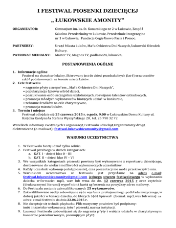 I FESTIWAL PIOSENKI DZIECIĘCEJ „ ŁUKOWSKIE AMONITY” ORGANIZATOR: Gimnazjum im. ks. St. Konarskiego nr 2 w Ł ukowie, Zespół Szkolno-Przedszkolny w Ł ukowie, Przedszkole Integracyjne nr 1 w Ł ukowie, Fundacja Cegieł kowo Pasja i Pomoc. PARTNERZY : Urzą d Miasta Ł uków, Mał a Orkiestra Dni Naszych, Ł ukowski Oś rodek PATRONAT MEDIALNY: Kultury. Master TV, Magnes TV, podlasie24, lukow24, POSTANOWIENIA OGÓLNE 1. Informacje ogólne Festiwal ma charakter lokalny. Skierowany jest do dzieci przedszkolnych (lat 6) oraz uczniów szkółpodstawowych na terenie miasta Łuków. 2. Cele festiwalu • nagranie pł yty z zespoł em „ Mał a Orkiestra Dni Naszych”, • popularyzacja ś piewu wś ród dzieci, • poszukiwanie osób szczególnie uzdolnionych, rozwijanie talentów estradowych, • promocja mł odych wykonawców biorą cych udziałw konkursie, • zebranie ś rodków na cele charytatywne, • promocja miasta Ł uków. 3. Termin i miejsce Festiwal odbę dzie się 25 czerwca 2015 r. o godz. 9.00 wŁ ukowskim Domu Kultury ul. Księ dza Kardynał a Stefana Wyszyń skiego 20, tel. 25 798 32 72 Wszelkich informacji zwią zanych z organizacjąFestiwalu udzielająOrganizatorzy drogą elektroniczną(e-mailową ): [email protected] WARUNKI UCZESTNICTWA 1. W Festiwalu biorąudziałtylko soliś ci. 2. Festiwal przebiega w dwóch kategoriach: a. KAT. I – dzieci klas 0 – III b. KAT. II – dzieci klas IV – VI 3. We wszystkich kategoriach piosenki powinny byćwykonywane z repertuaru dziecięcego, dostosowane do wieku i moż liwoś ci wykonawczych uczestników. 4. Każdy uczestnik wykonuje jednąpiosenkę , czas prezentacji nie moż e przekroczyć5 min. 5. Warunkiem uczestnictwa w festiwalu jest przysł anie na adres e-mail : [email protected] jednego utworu festiwalowego w wykonaniu dziecka w formacie: mp3, wav lub wma do dn. 12 czerwca 2015 r oraz czytelnie (drukowanymi literami) wypeł nionąkartązgł oszenia na powyż szy adres mailowy. 6. Do Festiwalu zostanie zakwalifikowanych 25 wykonawców. 7. Zakwalifikowane osoby zobowiązane sądo wysłania p rofesjonalnego podkładu muzycznego, w dobrej jakoś ci w tonacji dziecka, do których bę dąś piewać ( format: mp3, wav lub wma) na adres- e mail festiwalu do dnia 22.06.2015 r. 8. Nie akceptuje siętechniki playbacku. Plik muzyczny powinien byćpodpisany: imięi nazwisko wykonawcy, tytułpiosenki, nazwa instytucji. 9. Laureaci Festiwalu zobowią zani sądo nagrania pł yty i wzię cia udział u w charytatywnym koncercie pokonkursowym, promują cym pł ytę . JURY 1. Wykonawców oceniaćbę dzie jury powoł ane przez organizatorów. Obrady jury sątajne, zaś werdykt jest nieodwoł alny. 2. W ocenie wykonawców przewidziane jest jury mł odzież owe. 3. Ocenie podlegaćbę dą : a. walory wokalne b. repertuar c. ogólny efekt sceniczny d. interpretacja e. w przypadku piosenki premierowej kompozycja i aranż acji 4. Jury po wysł uchaniu wszystkich wykonawców ogł osi wyniki i przyzna nagrody. 5. Jury ma prawo do przyznawania wyróż nień . PRZEBIEG FESTIWALU 1. Kwalifikacji wstę pnej dokona powoł ana przez organizatorów komisja artystyczna w dniu 16.06.2015 r. na podstawie nadesł anych nagrań . 2. O wynikach uczestnicy zostaną powiadomieni za poś rednictwem adresu e-mail lub telefonicznie, podanym w zgł oszeniu do dnia 18.06.2015 r. 3. Dnia 25.06.2015 r . Festiwal, ogł oszenie wyników. 4. Lipiec-sierpień– nagrywanie pł yty z zespoł em „Mał a Orkiestra Dni Naszych”. 5. Wrzesień -paź dziernik 2015 r . (konkretna data bę dzie podana w póź niejszym terminie) – koncert pokonkursowy, promują cy pł ytę . NAGRODY 1. Uczestnicy festiwalu otrzymajądyplomy. 2. Laureatom zostanąprzyznane statuetki, w każ dej kategorii: a. Złoty amonit b. Srebrny amonit c. Brą zowy amonit 3. Laureaci wezmąudziałw nagraniu pł yty po-festiwalowej z zespoł em „Mał a Orkiestra Dni Naszych”. 4. Wyniki festiwalu umieszczone zostanąw czasopismach i mediach lokalnych. UWAGI KOŃCOWE 1. Organizator zapewnia sobie moż liwoś ć zmian w Regulaminie podyktowanych uzasadnionymi wzglę dami organizacyjnymi. 2. Jury powoł ane przez organizatora zastrzega sobie prawo do zmian w regulaminie, jeżeli nastą pi taka koniecznoś ć . 3. Zgł aszają c siędo udział u w festiwalu, zgodnie z niniejszym regulaminem, uczestnik akceptuje jego warunki. 4. Organizatorzy nie zobowią zująsiędo odsył ania, archiwizowania oraz przechowywania nadesł anych nagrań . 5. Rodzice wyraż ajązgodęna prezentacjęwizerunku i przetwarzanie danych osobowych dziecka. Niezbę dnądokumentacjęw tym zakresie przechowuje instytucja zgł aszają ca. Ł uków, dn. 28 maja 2015 r.