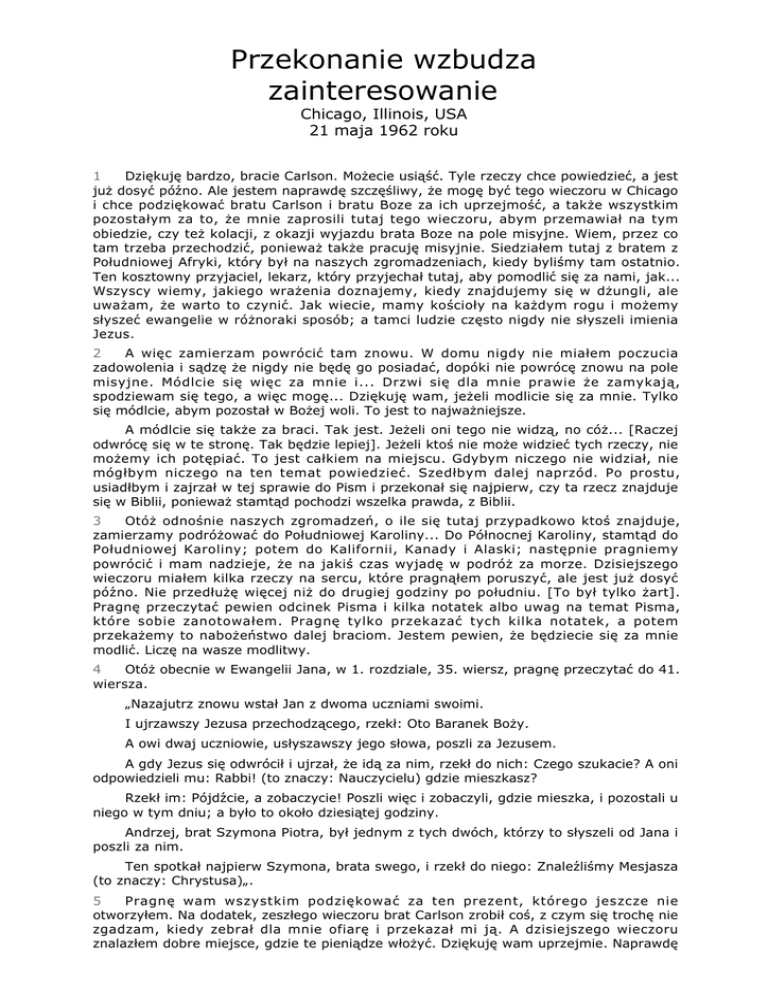 Przekonanie wzbudza zainteresowanie Chicago, Illinois, USA 21 maja 1962 roku 1 Dziękuję bardzo, bracie Carlson. Możecie usiąść. Tyle rzeczy chce powiedzieć, a jest już dosyć późno. Ale jestem naprawdę szczęśliwy, że mogę być tego wieczoru w Chicago i chce podziękować bratu Carlson i bratu Boze za ich uprzejmość, a także wszystkim pozostałym za to, że mnie zaprosili tutaj tego wieczoru, abym przemawiał na tym obiedzie, czy też kolacji, z okazji wyjazdu brata Boze na pole misyjne. Wiem, przez co tam trzeba przechodzić, ponieważ także pracuję misyjnie. Siedziałem tutaj z bratem z Południowej Afryki, który był na naszych zgromadzeniach, kiedy byliśmy tam ostatnio. Ten kosztowny przyjaciel, lekarz, który przyjechał tutaj, aby pomodlić się za nami, jak... Wszyscy wiemy, jakiego wrażenia doznajemy, kiedy znajdujemy się w dżungli, ale uważam, że warto to czynić. Jak wiecie, mamy kościoły na każdym rogu i możemy słyszeć ewangelie w różnoraki sposób; a tamci ludzie często nigdy nie słyszeli imienia Jezus. 2 A więc zamierzam powrócić tam znowu. W domu nigdy nie miałem poczucia zadowolenia i sądzę że nigdy nie będę go posiadać, dopóki nie powrócę znowu na pole misyjne. Módlcie się więc za mnie i... Drzwi się dla mnie prawie że zamykają, spodziewam się tego, a więc mogę... Dziękuję wam, jeżeli modlicie się za mnie. Tylko się módlcie, abym pozostał w Bożej woli. To jest to najważniejsze. A módlcie się także za braci. Tak jest. Jeżeli oni tego nie widzą, no cóż... [Raczej odwrócę się w te stronę. Tak będzie lepiej]. Jeżeli ktoś nie może widzieć tych rzeczy, nie możemy ich potępiać. To jest całkiem na miejscu. Gdybym niczego nie widział, nie mógłbym niczego na ten temat powiedzieć. Szedłbym dalej naprzód. Po prostu, usiadłbym i zajrzał w tej sprawie do Pism i przekonał się najpierw, czy ta rzecz znajduje się w Biblii, ponieważ stamtąd pochodzi wszelka prawda, z Biblii. 3 Otóż odnośnie naszych zgromadzeń, o ile się tutaj przypadkowo ktoś znajduje, zamierzamy podróżować do Południowej Karoliny... Do Północnej Karoliny, stamtąd do Południowej Karoliny; potem do Kalifornii, Kanady i Alaski; następnie pragniemy powrócić i mam nadzieje, że na jakiś czas wyjadę w podróż za morze. Dzisiejszego wieczoru miałem kilka rzeczy na sercu, które pragnąłem poruszyć, ale jest już dosyć późno. Nie przedłużę więcej niż do drugiej godziny po południu. [To był tylko żart]. Pragnę przeczytać pewien odcinek Pisma i kilka notatek albo uwag na temat Pisma, które sobie zanotowałem. Pragnę tylko przekazać tych kilka notatek, a potem przekażemy to nabożeństwo dalej braciom. Jestem pewien, że będziecie się za mnie modlić. Liczę na wasze modlitwy. 4 Otóż obecnie w Ewangelii Jana, w 1. rozdziale, 35. wiersz, pragnę przeczytać do 41. wiersza. „Nazajutrz znowu wstał Jan z dwoma uczniami swoimi. I ujrzawszy Jezusa przechodzącego, rzekł: Oto Baranek Boży. A owi dwaj uczniowie, usłyszawszy jego słowa, poszli za Jezusem. A gdy Jezus się odwrócił i ujrzał, że idą za nim, rzekł do nich: Czego szukacie? A oni odpowiedzieli mu: Rabbi! (to znaczy: Nauczycielu) gdzie mieszkasz? Rzekł im: Pójdźcie, a zobaczycie! Poszli więc i zobaczyli, gdzie mieszka, i pozostali u niego w tym dniu; a było to około dziesiątej godziny. Andrzej, brat Szymona Piotra, był jednym z tych dwóch, którzy to słyszeli od Jana i poszli za nim. Ten spotkał najpierw Szymona, brata swego, i rzekł do niego: Znaleźliśmy Mesjasza (to znaczy: Chrystusa)„. 5 Pragnę wam wszystkim podziękować za ten prezent, którego jeszcze nie otworzyłem. Na dodatek, zeszłego wieczoru brat Carlson zrobił coś, z czym się trochę nie zgadzam, kiedy zebrał dla mnie ofiarę i przekazał mi ją. A dzisiejszego wieczoru znalazłem dobre miejsce, gdzie te pieniądze włożyć. Dziękuję wam uprzejmie. Naprawdę Przekonanie wzbudza zainteresowanie 2 to doceniam. Wiem, że kiedy te pieniądze przeszły z waszych rąk do moich, to musze być szafarzem tych Bożych dóbr, tych pieniędzy. Pragnę umieścić te pieniądze w najlepszym miejscu, jakie znam, tam, gdzie coś może być uczynione dla Bożego Królestwa. Skłońmy teraz przez chwile nasze głowy. 6 Niebieski Ojcze, tak wiele dobrych rzeczy było tego wieczoru już powiedzianych. Zastanawiam się, czy masz jeszcze dalsze poselstwo dla tych ludzi, coś, co by ich zachęciło lub udzieliło im wiary. Słyszeliśmy świadectwa wielkich wojowników z pola misyjnego. Jest to dla mnie przywilejem, że mogę być tego wieczoru w ich obecności mężczyzn i kobiet, którzy Ciebie miłują. Jak Tobie dziękujemy za te pieśni i za te serca, za pilne nastawienie tych ludzi w tej późnej godzinie, ich ciągłe oczekiwanie. Są głodni i spragnieni, Panie. Kiedy słyszę Ciebie, jak mówisz w języku, o którym nie mam żadnego pojęcia, słyszę jak jakiś szlachetny żołnierz tutaj staje i podaje wykład, to dodaje mi zachęty, Ojcze. Jestem tak wdzięczny za wszystkie te rzeczy. Pobłogosław tych ludzi, Ojcze, pobłogosław twoje Słowo i pomóż twojemu słudze w obecnej chwili. Jeżeli jest kilka spraw, które mogą być wypowiedziane i mogą stać się dla kogoś pomocą, modlę się, abyś je użył teraz, w Imieniu Jezusa. Amen. 7 Chce powiedzieć, że największym powołaniem na tym świecie, według mojej opinii, jest powołanie na pole misyjne. Każdy człowiek, który jest misjonarzem, jest apostołem, ponieważ słowo: „apostoł” - oznacza: „posłany”, a słowo: „misjonarz” - oznacza także „posłany”. Są to takie same słowa, używane w ten sam sposób. Nie wiem, dlaczego się wolą nazywać misjonarzami, ale to jest dobre słowo, albo apostoł. 8 Otóż, tego wieczoru chce głosić na temat „Przekonanie wzbudza zainteresowanie”. Są to dwa słowa, w oparciu o które pragnę wypowiedzieć kilka uwag i zacytować