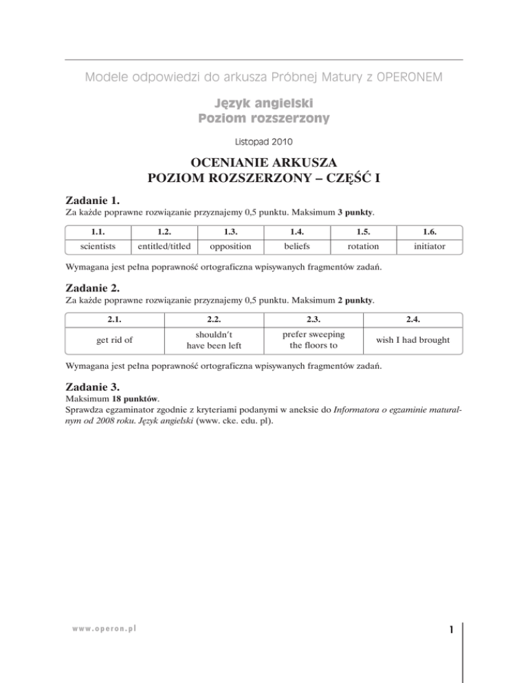 Modele odpowiedzi do arkusza Próbnej Matury z OPERONEM Język angielski Poziom rozszerzony Listopad 2010 OCENIANIE ARKUSZA POZIOM ROZSZERZONY – CZĘŚĆ I Zadanie 1. Za każde poprawne rozwiązanie przyznajemy 0,5 punktu. Maksimum 3 punkty. 1.1. 1.2. 1.3. 1.4. 1.5. 1.6. scientists entitled/titled opposition beliefs rotation initiator Wymagana jest pełna poprawność ortograficzna wpisywanych fragmentów zadań. Zadanie 2. Za każde poprawne rozwiązanie przyznajemy 0,5 punktu. Maksimum 2 punkty. 2.1. 2.2. 2.3. 2.4. get rid of shouldn’t have been left prefer sweeping the floors to wish I had brought Wymagana jest pełna poprawność ortograficzna wpisywanych fragmentów zadań. Zadanie 3. Maksimum 18 punktów. Sprawdza egzaminator zgodnie z kryteriami podanymi w aneksie do Informatorao egzaminiematuralnymod 2008roku.Językangielski(www. cke. edu. pl). www.operon.pl 1 Językangielski.Poziomrozszerzony PróbnaMaturazOPERONEMi„GazetąWyborczą” OCENIANIE ARKUSZA POZIOM ROZSZERZONY – CZĘŚĆ II Zadanie 4. Za każde poprawne rozwiązanie przyznajemy 1 punkt. Maksimum 5 punktów. 4.1. 4.2. 4.3. 4.4. 4.5. C B D E A Zadanie 5. Za każde poprawne rozwiązanie przyznajemy 1 punkt. Maksimum 5 punktów. T F 5.1. Marietta refuses to copy other girls’ behaviour. X 5.2. Marietta makes a decision to change her name. X 5.3. Taylor remains cool-headed after being given a baby. X 5.4. Mattie becomes Taylor’s employee. X 5.5. Mattie has a secret occupation. X Zadanie 6. Za każde poprawne rozwiązanie przyznajemy 1 punkt. Maksimum 5 punktów. 6.1. 6.2. 6.3. 6.4. 6.5. C D A B D Zadanie 7. Za każde poprawne rozwiązanie przyznajemy 1 punkt. Maksimum 5 punktów. 7.1. 7.2. 7.3. 7.4. 7.5. B B A C D Zadanie 8. Za każde poprawne rozwiązanie przyznajemy 1 punkt. Maksimum 4 punkty. 8.1. 8.2. 8.3. 8.4. E C D A www.operon.pl 2 Językangielski.Poziomrozszerzony PróbnaMaturazOPERONEMi„GazetąWyborczą” Zadanie 9. Za każde poprawne rozwiązanie przyznajemy 0,5 punktu. Maksimum 3 punkty. 9.1. 9.2. 9.3. 9.4. 9.5. 9.6. A B C D C B www.operon.pl 3