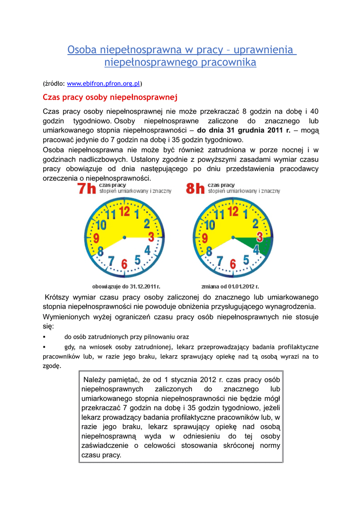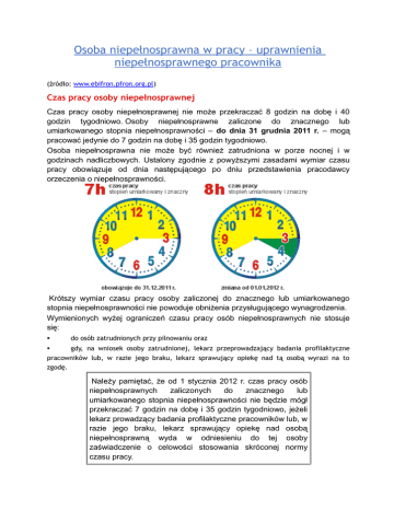Osoba niepełnosprawna w pracy – uprawnienia niepełnosprawnego pracownika (źródło: www.ebifron.pfron.org.pl) Czas pracy osoby niepełnosprawnej Czas pracy osoby niepełnosprawnej nie może przekraczać 8 godzin na dobę i 40 godzin tygodniowo. Osoby niepełnosprawne zaliczone do znacznego lub umiarkowanego stopnia niepełnosprawności – do dnia 31 grudnia 2011 r. – mogą pracować jedynie do 7 godzin na dobę i 35 godzin tygodniowo. Osoba niepełnosprawna nie może być również zatrudniona w porze nocnej i w godzinach nadliczbowych. Ustalony zgodnie z powyższymi zasadami wymiar czasu pracy obowiązuje od dnia następującego po dniu przedstawienia pracodawcy orzeczenia o niepełnosprawności. Krótszy wymiar czasu pracy osoby zaliczonej do znacznego lub umiarkowanego stopnia niepełnosprawności nie powoduje obniżenia przysługującego wynagrodzenia. Wymienionych wyżej ograniczeń czasu pracy osób niepełnosprawnych nie stosuje się: do osób zatrudnionych przy pilnowaniu oraz gdy, na wniosek osoby zatrudnionej, lekarz przeprowadzający badania profilaktyczne pracowników lub, w razie jego braku, lekarz sprawujący opiekę nad tą osobą wyrazi na to zgodę. Należy pamiętać, że od 1 stycznia 2012 r. czas pracy osób niepełnosprawnych zaliczonych do znacznego lub umiarkowanego stopnia niepełnosprawności nie będzie mógł przekraczać 7 godzin na dobę i 35 godzin tygodniowo, jeżeli lekarz prowadzący badania profilaktyczne pracowników lub, w razie jego braku, lekarz sprawujący opiekę nad osobą niepełnosprawną wyda w odniesieniu do tej osoby zaświadczenie o celowości stosowania skróconej normy czasu pracy. Przerwy w pracy Osobie niepełnosprawnej – bez względu na dobowy wymiar czasu pracy – przysługuje prawo do dodatkowej przerwy w pracy w wymiarze 15 minut na gimnastykę usprawniającą lub wypoczynek. Dodatkowy urlop 10 dni dodatkowego urlopu Osobie zaliczonej do znacznego lub umiarkowanego stopnia niepełnosprawności przysługuje dodatkowy urlop wypoczynkowy w wymiarze 10 dni roboczych w roku kalendarzowym. Prawo do pierwszego urlopu dodatkowego osoba ta nabywa po przepracowaniu jednego roku następującego po dniu zaliczenia jej do jednego z tych stopni niepełnosprawności. Urlop dodatkowy nie przysługuje natomiast osobie uprawnionej do urlopu wypoczynkowego w wymiarze przekraczającym 26 dni roboczych lub do urlopu dodatkowego – w wymiarze 10 dni. 21 dni urlopu na turnus rehabilitacyjny Osoba zaliczona do znacznego lub umiarkowanego stopnia niepełnosprawności ma także prawo do zwolnienia od pracy w wymiarze do 21 dni roboczych w celu uczestniczenia w turnusie rehabilitacyjnym, nie częściej niż raz w roku. Pracownik ubiegający się o udział w turnusie rehabilitacyjnym powinien uzyskać od lekarza sprawującego nad nim opiekę wniosek o skierowanie na taki turnus. Podstawą wypłaty wynagrodzenia za czas zwolnienia od pracy w związku z pobytem na turnusie rehabilitacyjnym jest przedłożony pracodawcy dokument potwierdzający pobyt na turnusie, wystawiony przez jego organizatora. Za czas omawianego zwolnienia od pracy pracownikom niepełnosprawnym przysługuje prawo do wynagrodzenia obliczonego tak jak ekwiwalent pieniężny za urlop wypoczynkowy. Zgodnie z obowiązującymi przepisami nie może dojść do kumulacji nieobecności w pracy z powodu korzystania z dodatkowego (10-dniowego) urlopu oraz zwolnienia od pracy w celu uczestniczenia w turnusie rehabilitacyjnym. Łączny wymiar urlopu dodatkowego i zwolnienia od pracy w celu uczestniczenia w turnusie rehabilitacyjnym nie może przekroczyć 21 dni roboczych w roku kalendarzowym. Możliwość zwolnienia od pracy Pracownikowi niepełnosprawnemu legitymującemu się orzeczeniem o znacznym lub umiarkowanym stopniu niepełnosprawności przysługuje ponadto zwolnienie od pracy w celu wykonania badań specjalistycznych, poddania się zabiegom leczniczym lub usprawniającym, a także w celu uzyskania zaopatrzenia ortopedycznego lub jego naprawy, jeżeli czynności te nie mogą być wykonane poza godzinami pracy. Za czas zwolnienia od pracy pracownik zachowuje prawo do wynagrodzenia obliczonego tak jak ekwiwalent pieniężny za urlop wypoczynkowy. Wypadek przy pracy lub choroba zawodowa - obowiązki pracodawcy Osobie zatrudnionej, która w wyniku wypadku przy pracy lub choroby zawodowej utraciła zdolność do pracy na dotychczasowym stanowisku, pracodawca jest obowiązany wydzielić lub zorganizować odpowiednie stanowisko pracy z podstawowym zapleczem socjalnym, nie później niż w okresie trzech miesięcy od daty zgłoszenia przez tę osobę gotowości przystąpienia do pracy. Zgłoszenie gotowości przystąpienia do pracy powinno nastąpić w ciągu miesiąca od dnia uznania za osobę niepełnosprawną. Przepisu tego nie stosuje się, gdy wyłączną przyczyną wypadku przy pracy było naruszenie przepisów w zakresie bezpieczeństwa i higieny pracy przez pracownika z jego winy lub jego stanu nietrzeźwości - udowodnione przez pracodawcę Podstawa prawna - art. 14 – art. 20 ustawy z dnia 27 sierpnia 1997 r. o rehabilitacji zawodowej i społecznej oraz zatrudnianiu osób niepełnosprawnych (Dz.U. z 2011 r. 127, poz. 721 z późn. zm.).