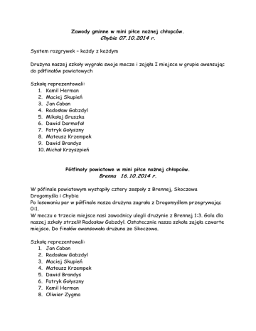 Zawody gminne w mini piłce nożnej chłopców. Chybie 07.10.2014 r. System rozgrywek – każdy z każdym Drużyna naszej szkoły wygrała swoje mecze i zajęła I miejsce w grupie awansując do półfinałów powiatowych Szkołę reprezentowali: 1. Kamil Herman 2. Maciej Skupień 3. Jan Caban 4. Radosław Gabzdyl 5. Mikołaj Gruszka 6. Dawid Darmofał 7. Patryk Gołyszny 8. Mateusz Krzempek 9. Dawid Brandys 10. Michał Krzyszpień Półfinały powiatowe w mini piłce nożnej chłopców. Brenna 16.10.2014 r. W pófinale powiatowym wystąpiły cztery zespoły z Brennej, Skoczowa Drogomyśla i Chybia Po losowaniu par w półfinale nasza drużyna zagrała z Drogomyślem przegrywając 0:1. W meczu o trzecie miejsce nasi zawodnicy ulegli drużynie z Brennej 1:3. Gola dla naszej szkoły strzelił Radosław Gabzdyl. Ostatecznie nasza szkoła zajęła czwarte miejsce. Do finałów awansowała drużuna ze Skoczowa. Szkołę reprezentowali: 1. Jan Caban 2. Radosław Gabzdyl 3. Maciej Skupień 4. Mateusz Krzempek 5. Dawid Brandys 6. Patryk Gołyszny 7. Kamil Herman 8. Oliwier Zygma ZAWODY GMINNE W SZTAFETOWYCH BIEGACH PRZEŁAJOWYCH CHYBIE, 25.09.2014 r. Chłopcy: W sztafecie naszej szkoły wystąpili: Kamil Herman, Radosław Gabzdyl, Mateusz Krzempek, Maciej Skupień, Mikołaj Gruszka, Konrad Król zajmując pierwsze miejsce i awansując do finałów powiatowych. Dziewczęta: Drużyna w składzie: Anna Rygiel, Sandra Mencnarowska, Joanna Pawlik, Martyna Heller, Martyna Kajsztura, Oliwia Dendys zajęła drugie miejsce. ZAWODY POWIATOWE W SZTAFETOWYCH BIEGACH PRZEŁAJOWYCH – CHYBIE, 02.10.2014 r. Drużyna chłopców zajęła VIII miejsce na XI szkół Naszą szkołę reprezentowali: Kamil Herman, Radosław Gabzdyl, Mateusz Krzempek, Maciej Skupień, Mikołaj Gruszka, Konrad Król, Jakub Krzempek