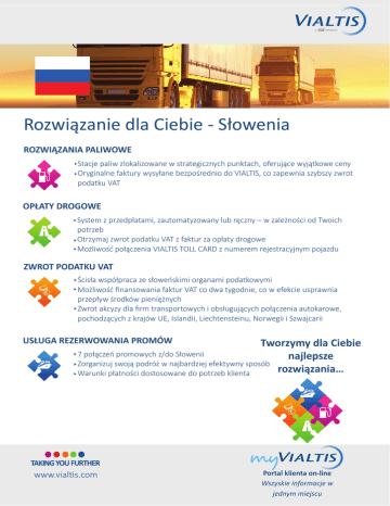 a company Rozwiązanie dla Ciebie - Słowenia ROZWIĄZANIA PALIWOWE Stacje paliw zlokalizowane w strategicznych punktach, oferujące wyjątkowe ceny Oryginalne faktury wysyłane bezpośrednio do VIALTIS, co zapewnia szybszy zwrot podatku VAT OPŁATY DROGOWE System z przedpłatami, zautomatyzowany lub ręczny – w zależności od Twoich potrzeb Otrzymaj zwrot podatku VAT z faktur za opłaty drogowe Możliwość połączenia VIALTIS TOLL CARD z numerem rejestracyjnym pojazdu ZWROT PODATKU VAT Ścisła współpraca ze słoweńskimi organami podatkowymi Możliwość finansowania faktur VAT co dwa tygodnie, co w efekcie usprawnia przepływ środków pieniężnych Zwrot akcyzy dla firm transportowych i obsługujących połączenia autokarowe, pochodzących z krajów UE, Islandii, Liechtensteinu, Norwegii i Szwajcarii USŁUGA REZERWOWANIA PROMÓW Tworzymy dla Ciebie 7 połączeń promowych z/do Słowenii najlepsze Zorganizuj swoją podróż w najbardziej efektywny sposób rozwiązania… Warunki płatności dostosowane do potrzeb klienta www.vial www vial s.com s com Portal klienta on-line Wszyskie informacje w jednym miejscu