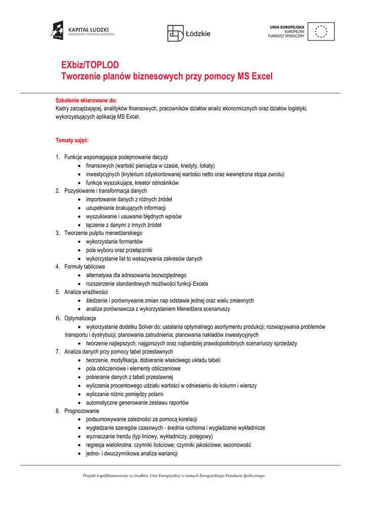 EXbiz/TOPLOD Tworzenie planów biznesowych przy pomocy MS Excel Szkolenie skierowane do: Kadry zarządzającej, analityków finansowych, pracowników działów analiz ekonomicznych oraz działów logistyki, wykorzystujących aplikację MS Excel. Tematy zajęć: 1. Funkcje wspomagające podejmowanie decyzji finansowych (wartość pieniądza w czasie, kredyty, lokaty) inwestycyjnych (kryterium zdyskontowanej wartości netto oraz wewnętrzna stopa zwrotu) funkcje wyszukujące, kreator odnośników 2. Pozyskiwanie i transformacja danych importowanie danych z różnych źródeł uzupełnianie brakujących informacji wyszukiwanie i usuwanie błędnych wpisów łączenie z danymi z innych źródeł 3. Tworzenie pulpitu menedżerskiego wykorzystanie formantów pola wyboru oraz przełączniki wykorzystanie list to wskazywania zakresów danych 4. Formuły tablicowe alternatywa dla adresowania bezwzględnego rozszerzenie standardowych możliwości funkcji Excela 5. Analiza wrażliwości śledzenie i porównywanie zmian nap odstawie jednej oraz wielu zmiennych analiza porównawcza z wykorzystaniem Menedżera scenariuszy 6. Optymalizacja wykorzystanie dodatku Solver do: ustalania optymalnego asortymentu produkcji; rozwiązywania problemów transportu i dystrybucji; planowania zatrudnienia; planowania nakładów inwestycyjnych tworzenie najlepszych, najgorszych oraz najbardziej prawdopodobnych scenariuszy sprzedaży 7. Analiza danych przy pomocy tabel przestawnych tworzenie, modyfikacja, dobieranie właściwego układu tabeli pola obliczeniowe i elementy obliczeniowe pobieranie danych z tabeli przestawnej wyliczenia procentowego udziału wartości w odniesieniu do kolumn i wierszy wyliczanie różnic pomiędzy polami automatyczne generowanie zestawu raportów 8. Prognozowanie podsumowywanie zależności za pomocą korelacji wygładzanie szeregów czasowych - średnia ruchoma i wygładzanie wykładnicze wyznaczanie trendu (typ liniowy, wykładniczy, potęgowy) regresja wielokrotna: czynniki ilościowe; czynniki jakościowe; sezonowość jedno- i dwuczynnikowa analiza wariancji Projekt współfinansowany ze środków Unii Europejskiej w ramach Europejskiego Funduszu Społecznego EXbiz/TOPLOD Tworzenie planów biznesowych przy pomocy MS Excel 9. Formatowanie warunkowe formatowanie warunkowe oparte na formułach budowanie formatów warunkowych uzależnionych od parametrów pobranych z arkusza 10. Wielopoziomowe zagnieżdżanie oraz łączenie funkcji Wyszukaj.pionowo() oraz Wyszukaj.poziomo() Funkcje logiczne jako kryteria funkcji Jeżeli() Stosowanie funkcji Adr.Pośr() w celu budowania złożonych źródeł do list oraz zakresów formuły Metoda szkolenia: • wykład + warsztaty. Czas trwania: 21 godzin (3 dni) Korzyści wynikające z ukończenia szkolenia Zdobycie umiejętności optymalizacji decyzji finansowych, tworzenia modeli biznesowych oraz opracowywanie raportów przy wykorzystaniu narzędzi MS Excel; umiejętność optymalizowania decyzji finansowych wykorzystując MS Excel do modelowania sytuacji biznesowych; poznanie głównych narzędzi analizy danych w MS Excel - wykresy przestawne i tabele przestawne. Oczekiwane przygotowanie słuchaczy: Podstawowa znajomość systemu Windows. Znajomość zagadnień omawianych na szkoleniu Projekt współfinansowany ze środków Unii Europejskiej w ramach Europejskiego Funduszu Społecznego