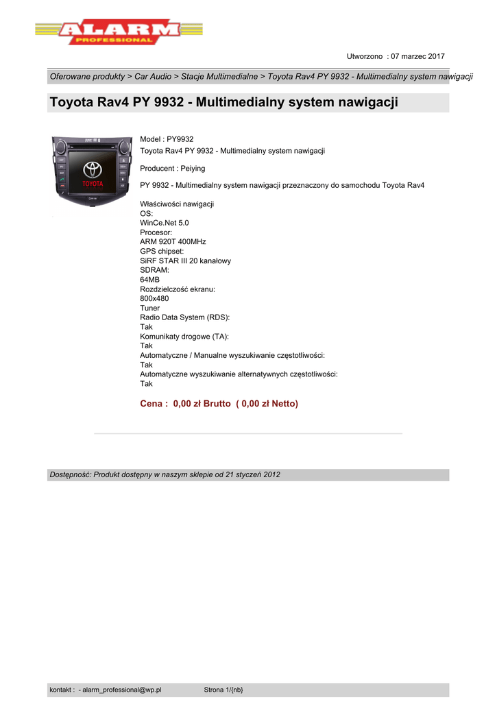 Utworzono : 07 marzec 2017 Oferowane produkty > Car Audio > Stacje Multimedialne > Toyota Rav4 PY 9932 - Multimedialny system nawigacji Toyota Rav4 PY 9932 - Multimedialny system nawigacji Model : PY9932 Toyota Rav4 PY 9932 - Multimedialny system nawigacji Producent : Peiying PY 9932 - Multimedialny system nawigacji przeznaczony do samochodu Toyota Rav4 Właściwości nawigacji OS: WinCe.Net 5.0 Procesor: ARM 920T 400MHz GPS chipset: SiRF STAR III 20 kanałowy SDRAM: 64MB Rozdzielczość ekranu: 800x480 Tuner Radio Data System (RDS): Tak Komunikaty drogowe (TA): Tak Automatyczne / Manualne wyszukiwanie częstotliwości: Tak Automatyczne wyszukiwanie alternatywnych częstotliwości: Tak Cena : 0,00 zł Brutto ( 0,00 zł Netto) Dostępność: Produkt dostępny w naszym sklepie od 21 styczeń 2012 kontakt : - [email protected] Strona 1/{nb}